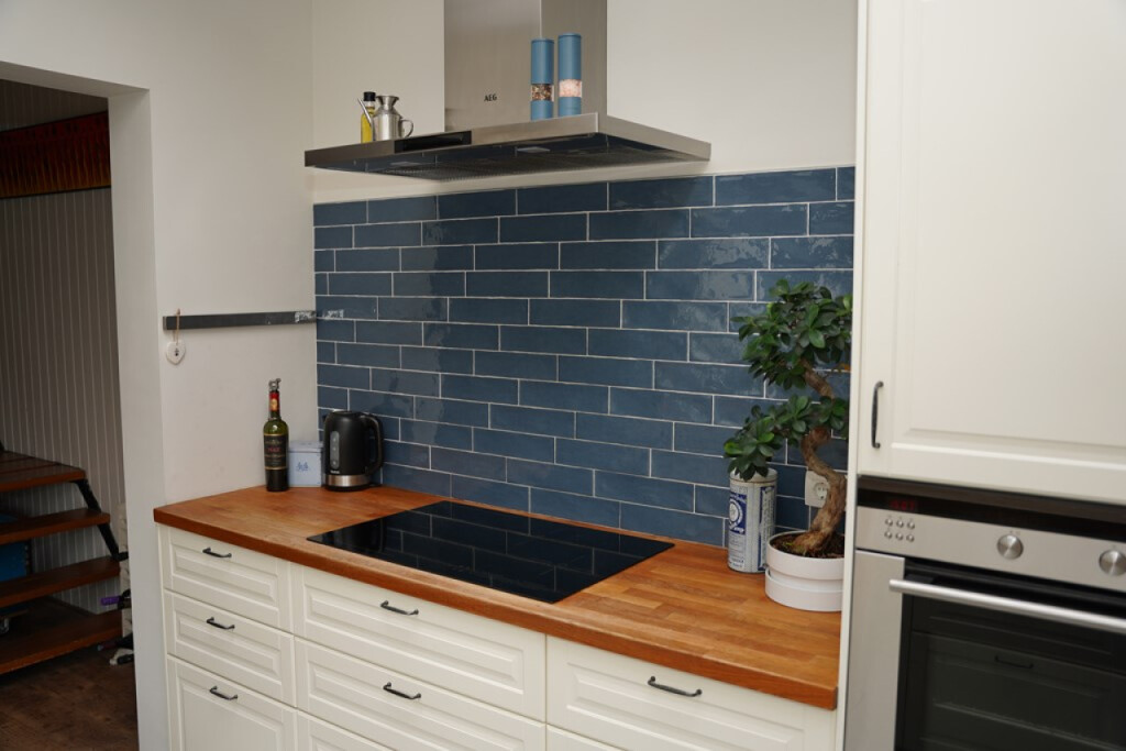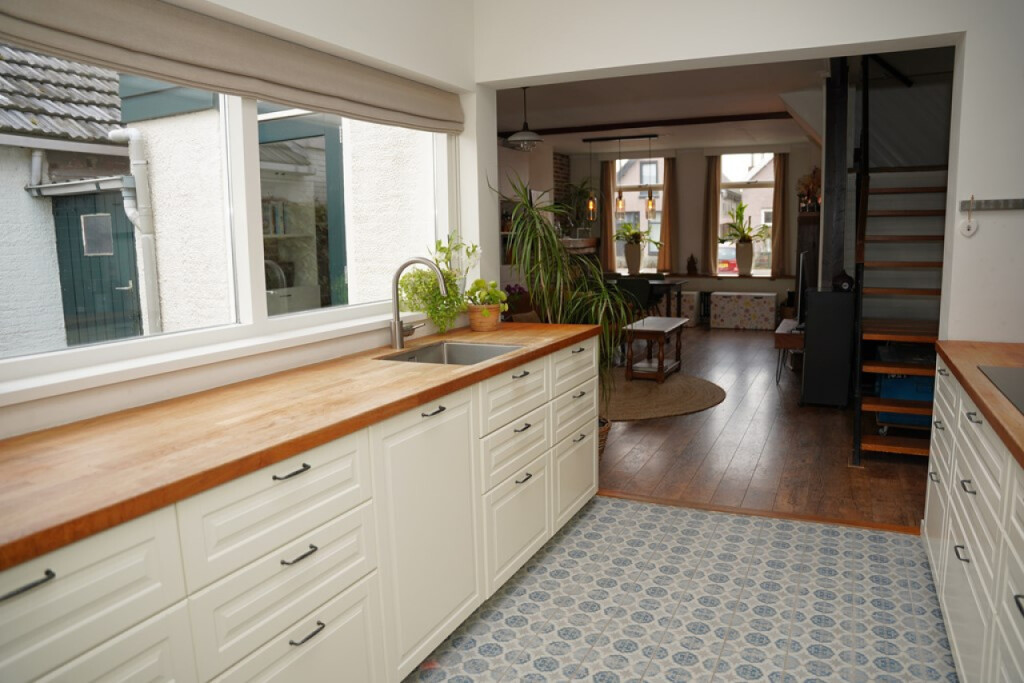 De open keuken met een ruim aanrecht aan 2 zijden is van alle gemakken voorzien met onder andere een moderne oven, een vaatwasser en een inductie kookplaat. Een groot raam richting de tuin zorgt hier voor een zee aan daglicht.