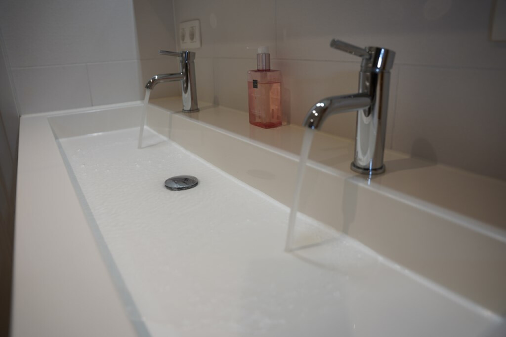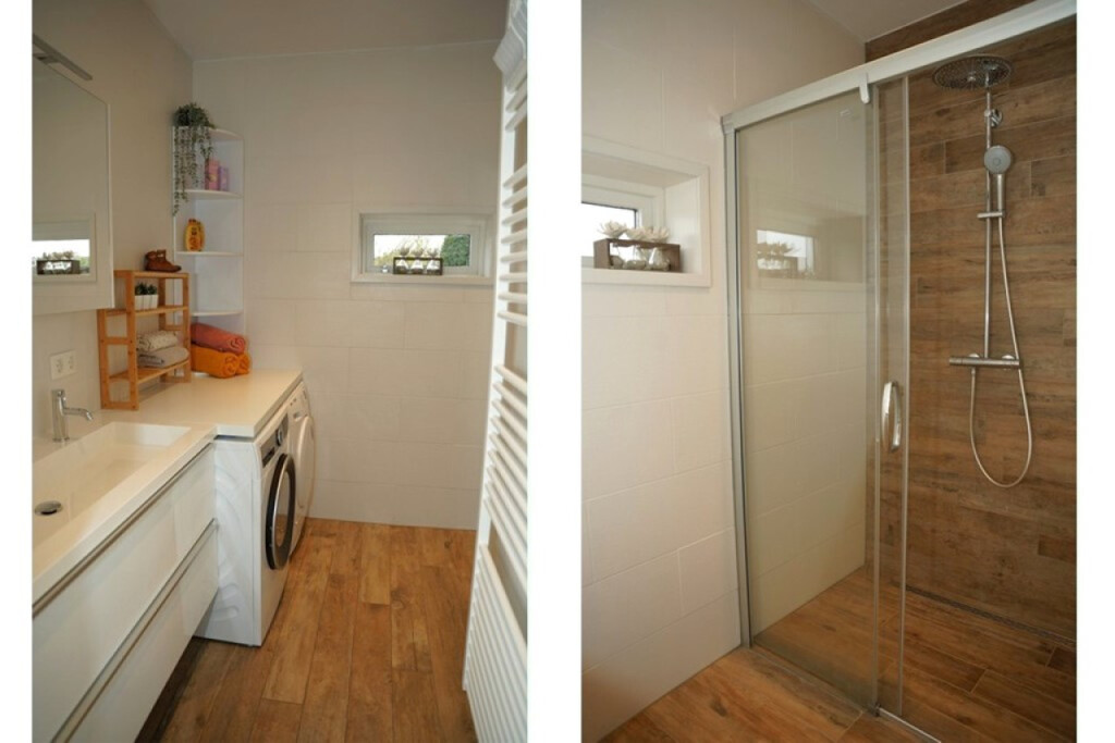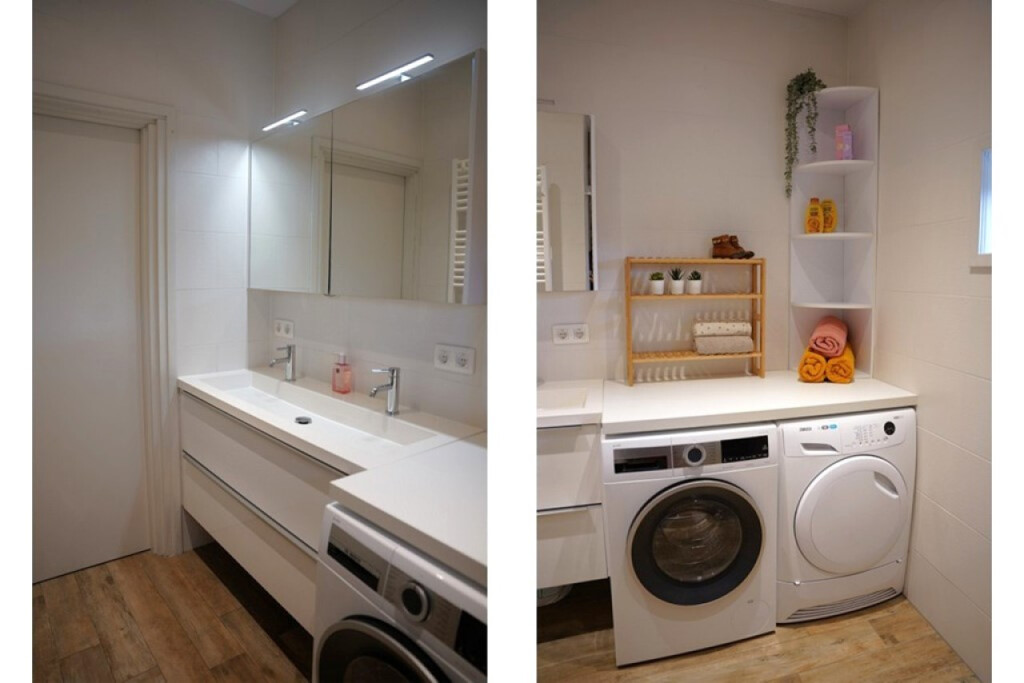 Via de keuken kom je in de stijlvol ingerichte badkamer met inloopdouche, dubbele wastafel en aansluiting voor de wasmachine. Naast de badkamer is een apart toilet met een fonteintje.