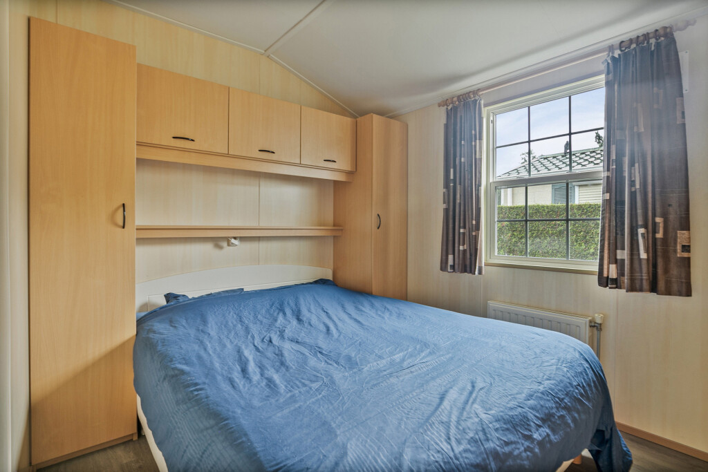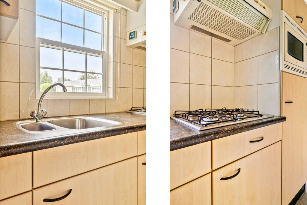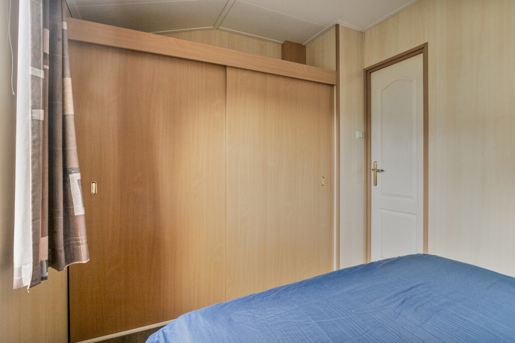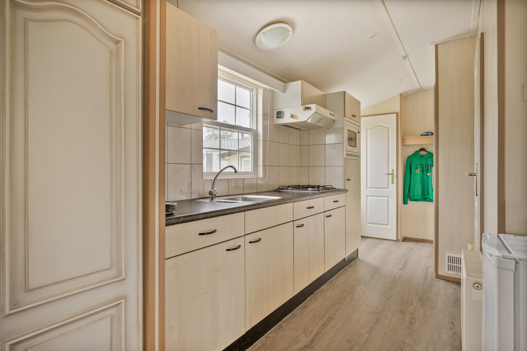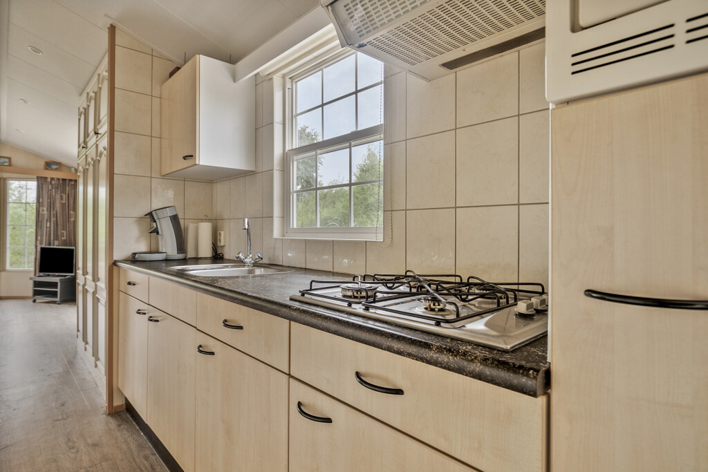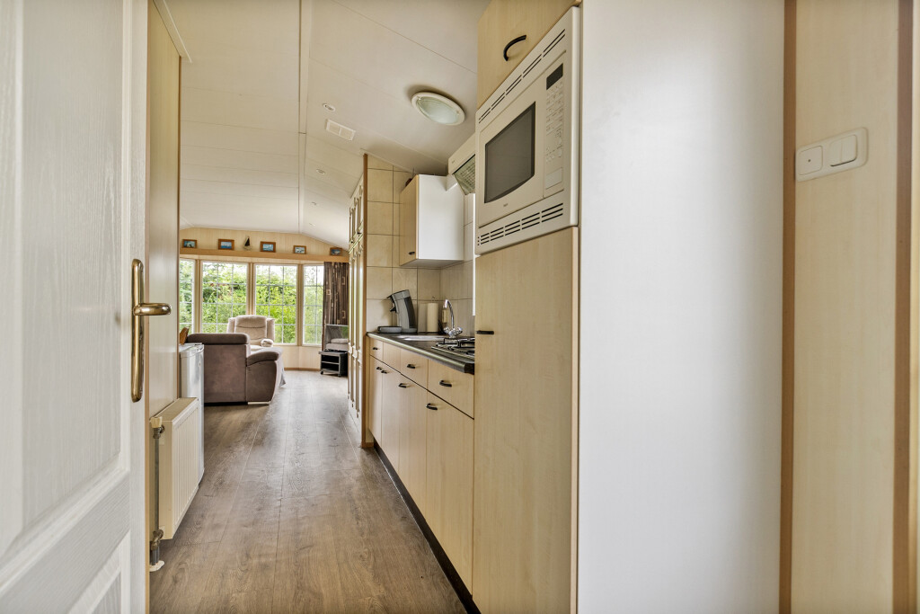 Bij binnenkomst treft u de hal die toegang biedt tot de verschillende vertrekken van dit chalet. De ruime woonkamer is voorzien van grote raampartijen en een schuifpui die leidt naar de tuin, waardoor u overdag heerlijk kunt genieten van de zon. Aangrenzend aan de woonkamer treft u de open keuken die is voorzien van een 4-pits gasfornuis, afzuigkap, combi-oven en een koelkast. De badkamer beschikt over een douche, een wastafelmeubel en een toilet. Verder treft u in het chalet nog twee ruime slaapkamers, waarvan één slaapkamer is voorzien van vaste kastruimte.