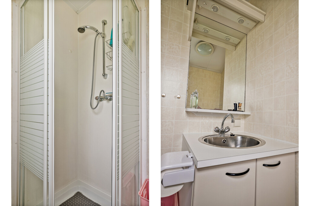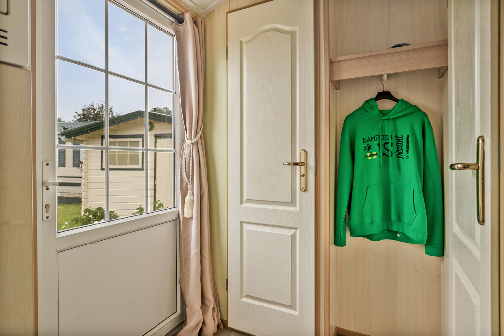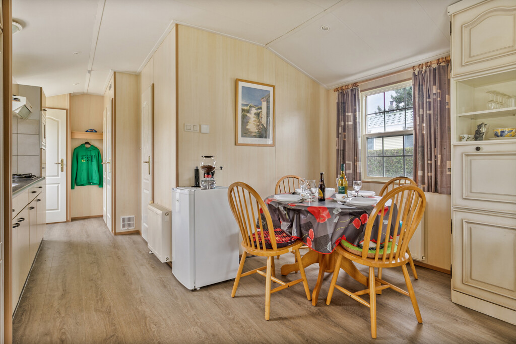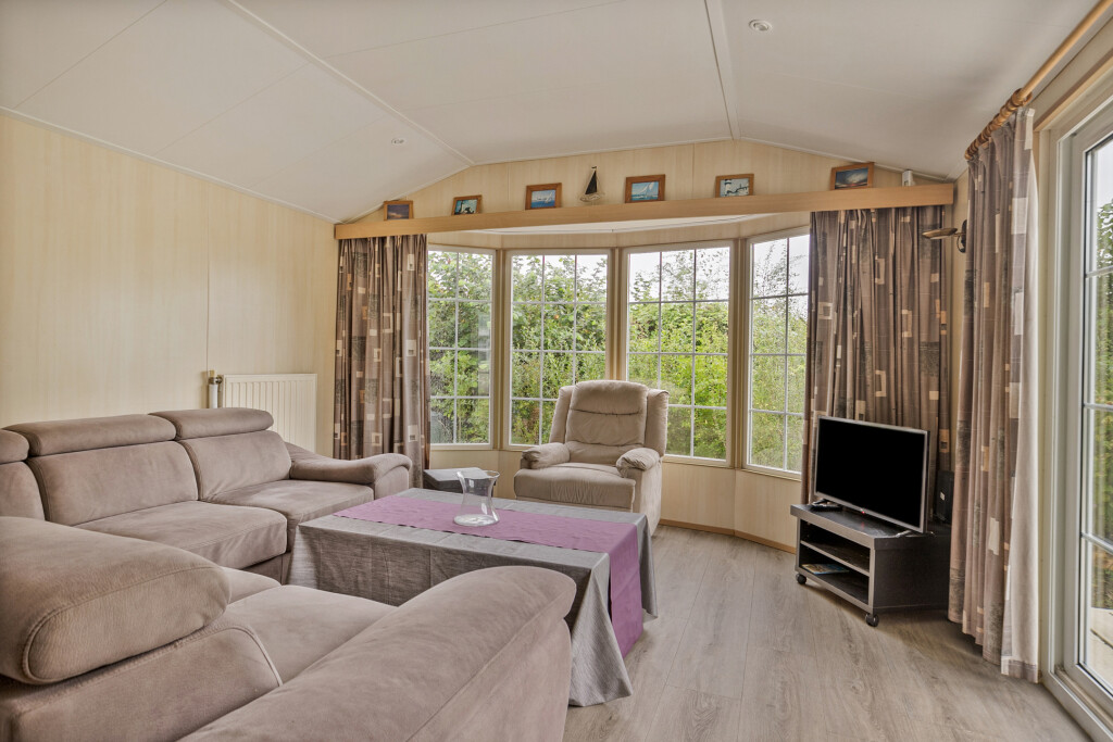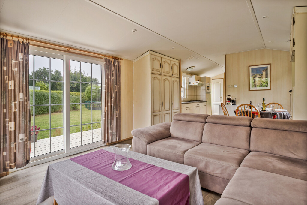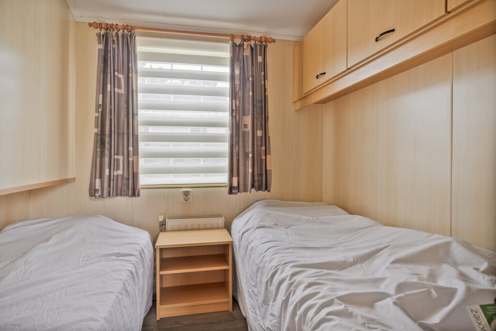 Bij binnenkomst treft u de hal die toegang biedt tot de verschillende vertrekken van dit chalet. De ruime woonkamer is voorzien van grote raampartijen en een schuifpui die leidt naar de tuin, waardoor u overdag heerlijk kunt genieten van de zon. Aangrenzend aan de woonkamer treft u de open keuken die is voorzien van een 4-pits gasfornuis, afzuigkap, combi-oven en een koelkast. De badkamer beschikt over een douche, een wastafelmeubel en een toilet. Verder treft u in het chalet nog twee ruime slaapkamers, waarvan één slaapkamer is voorzien van vaste kastruimte.