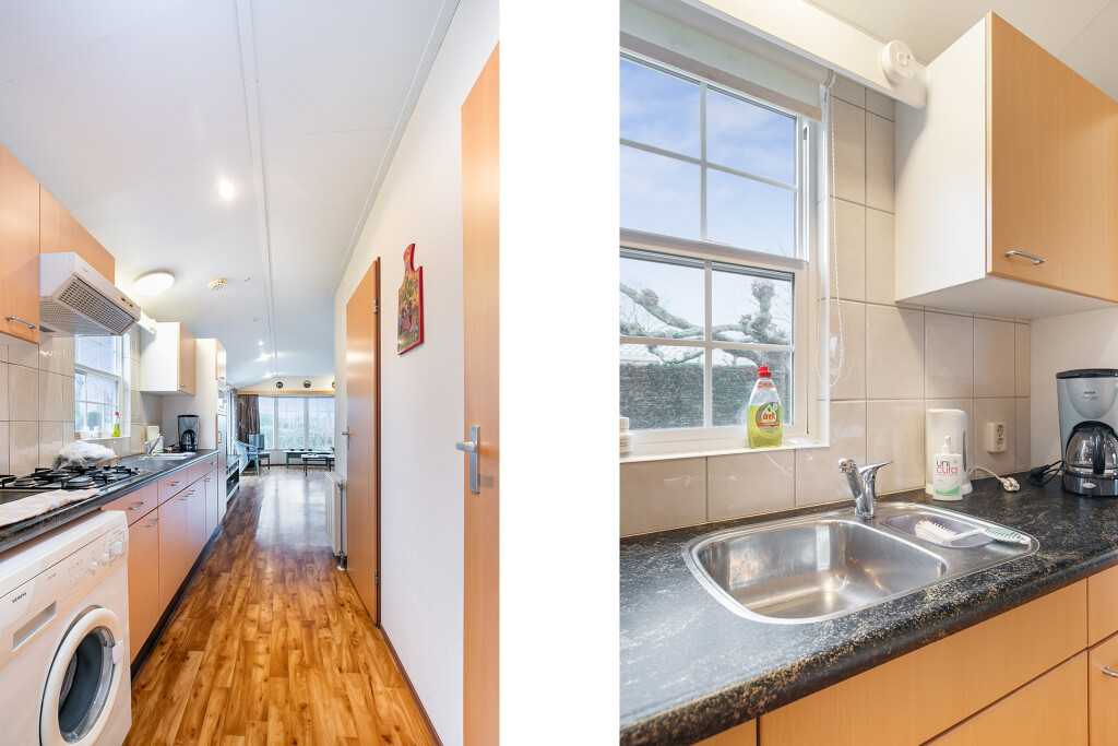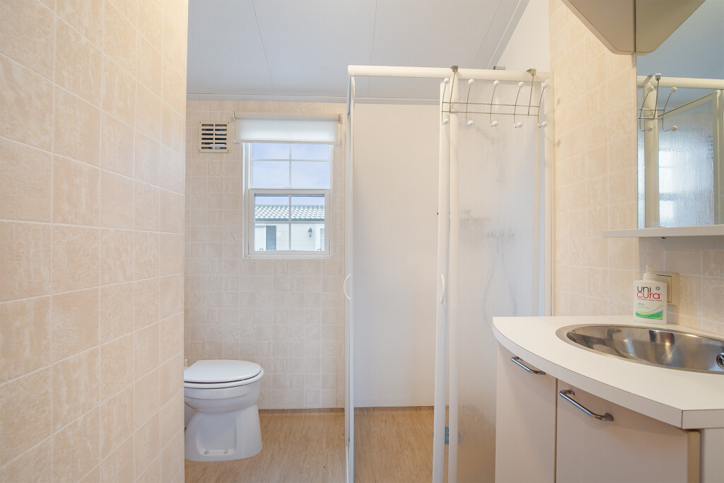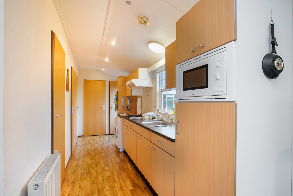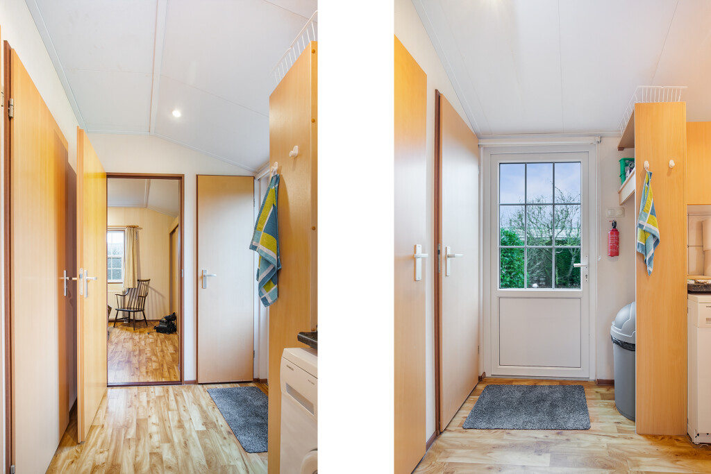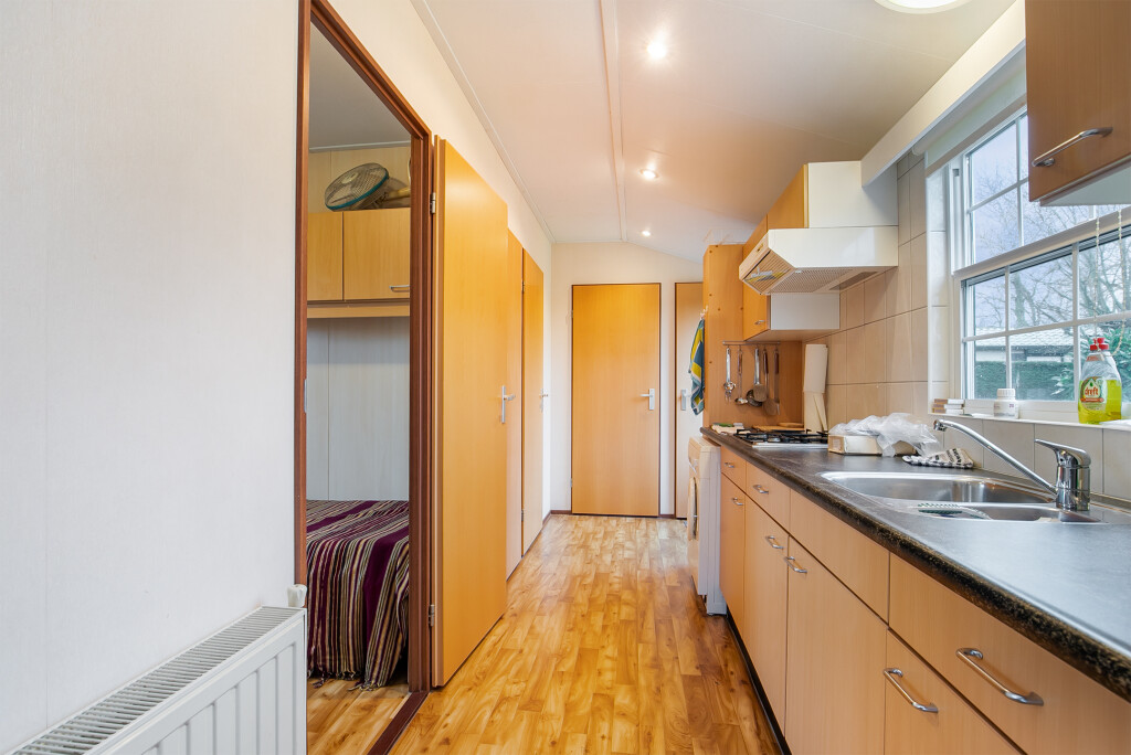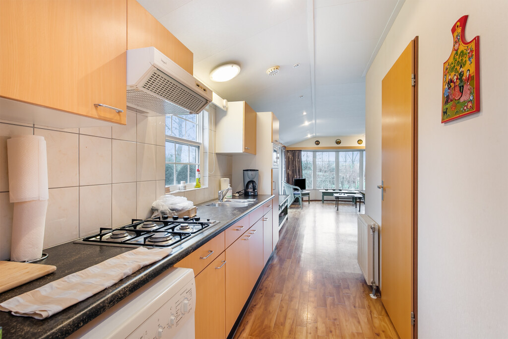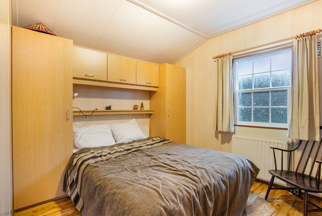 Bij binnenkomst treft u de hal die toegang biedt tot de verschillende vertrekken van deze bungalow. De ruime woonkamer is voorzien van grote raampartijen en een schuifpui die leidt naar de tuin, waardoor u overdag heerlijk kunt genieten van de zon. Aangrenzend aan de woonkamer treft u de open keuken die is voorzien van een 4-pits gasfornuis, afzuigkap, magnetron, koelkast en een wasmachineaansluiting. De badkamer beschikt over een inloopdouche, een wastafelmeubel en een toilet. Verder treft u in het chalet nog twee ruime slaapkamers.