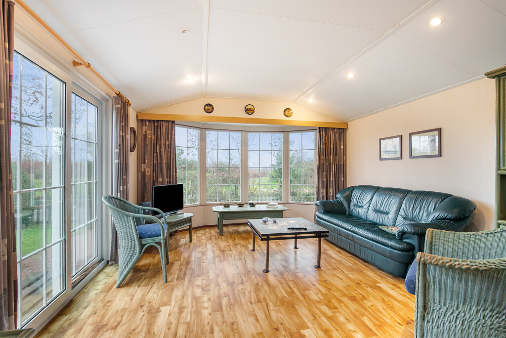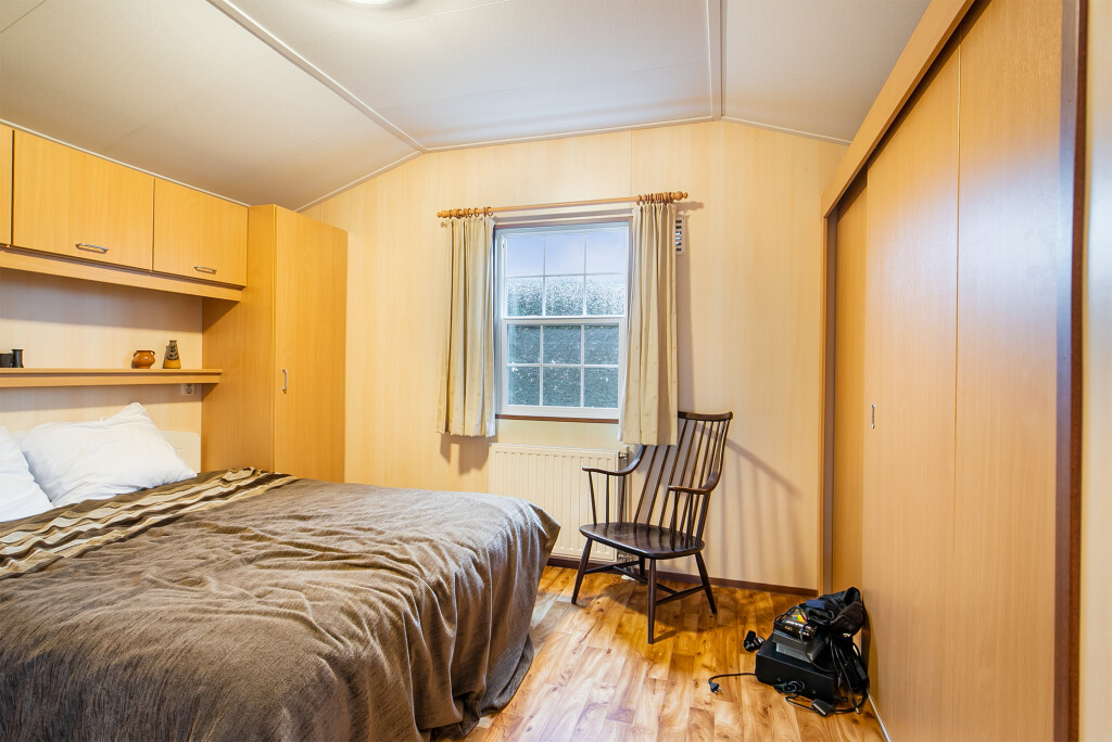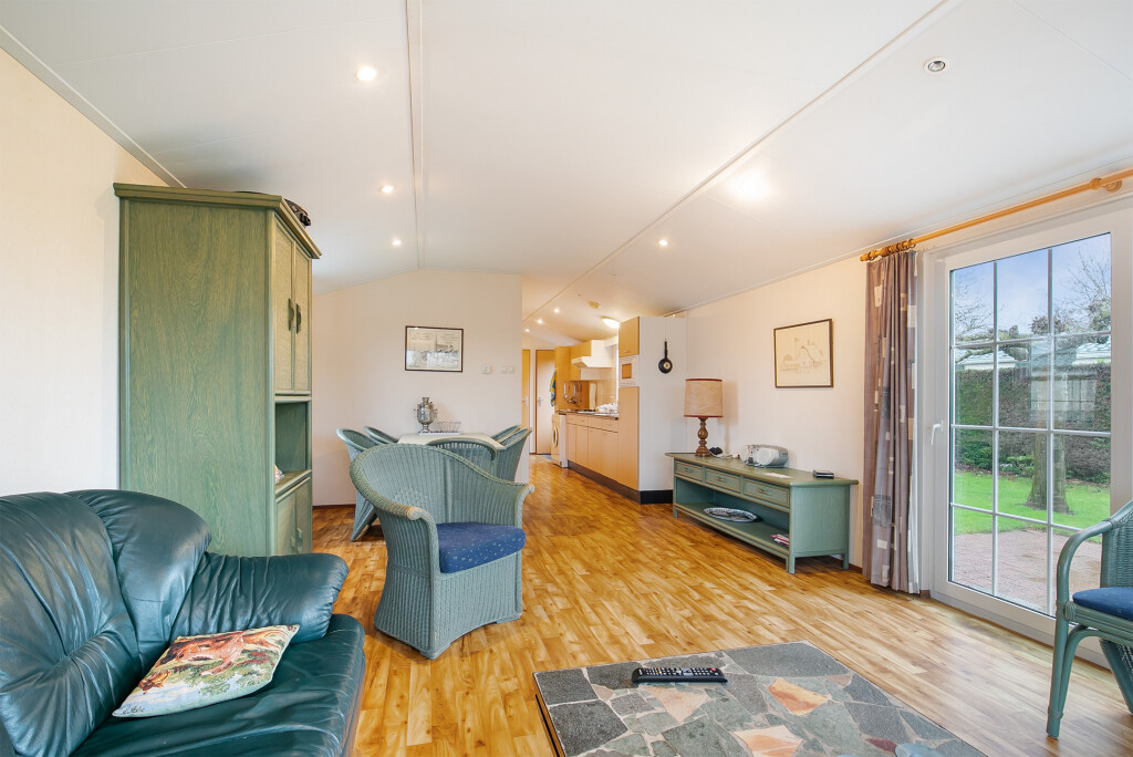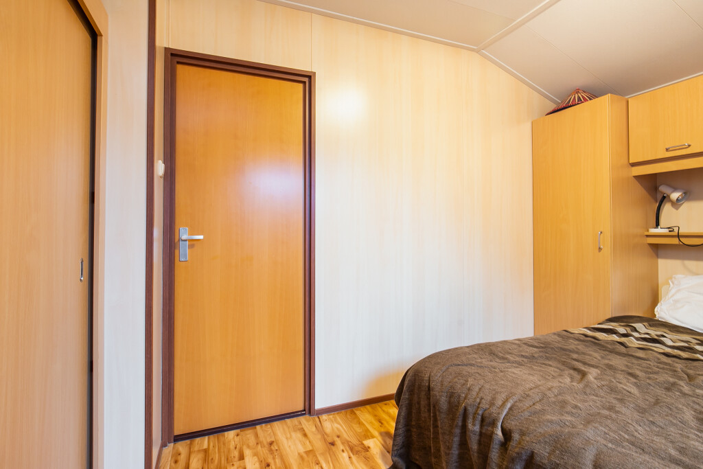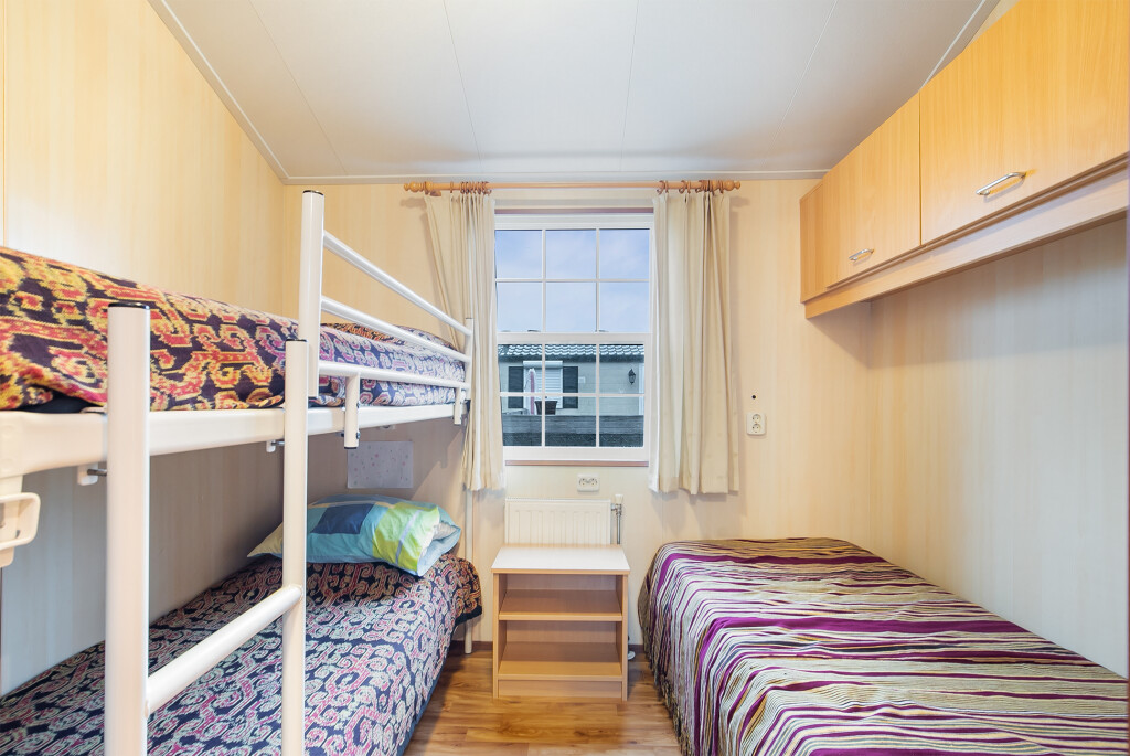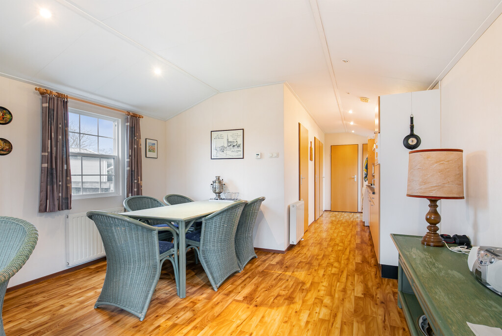 Bij binnenkomst treft u de hal die toegang biedt tot de verschillende vertrekken van deze bungalow. De ruime woonkamer is voorzien van grote raampartijen en een schuifpui die leidt naar de tuin, waardoor u overdag heerlijk kunt genieten van de zon. Aangrenzend aan de woonkamer treft u de open keuken die is voorzien van een 4-pits gasfornuis, afzuigkap, magnetron, koelkast en een wasmachineaansluiting. De badkamer beschikt over een inloopdouche, een wastafelmeubel en een toilet. Verder treft u in het chalet nog twee ruime slaapkamers.