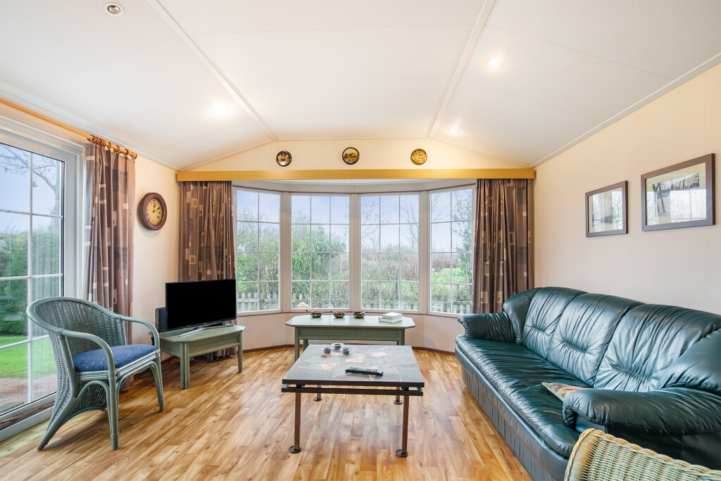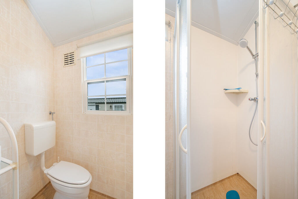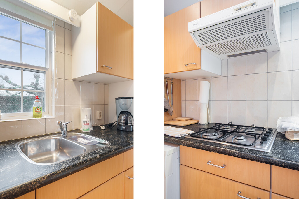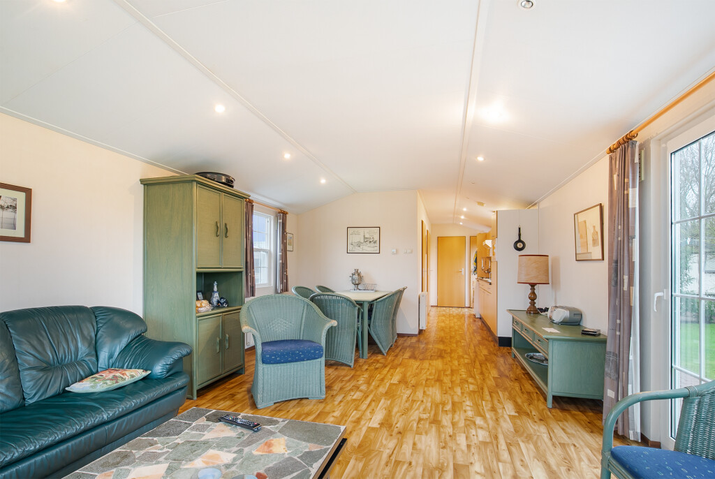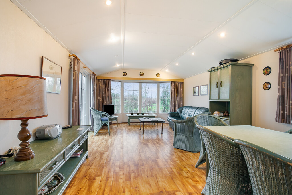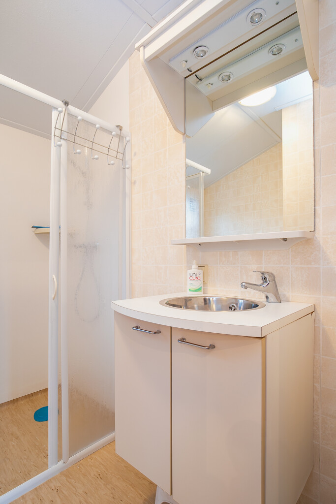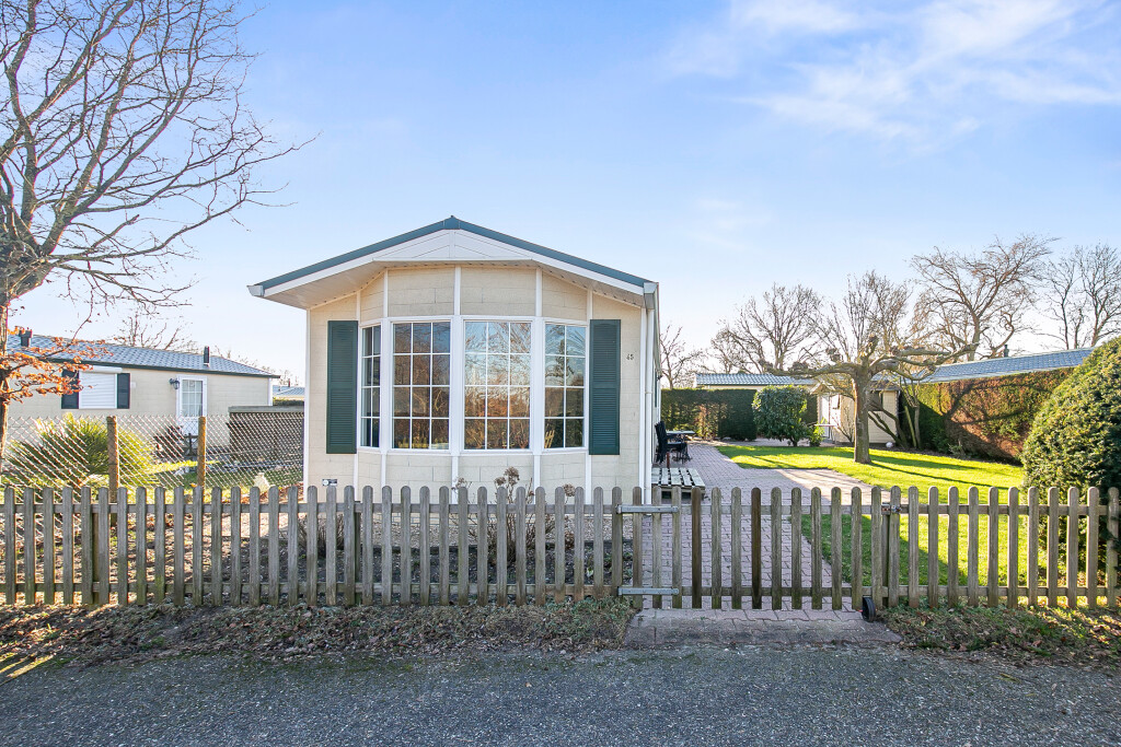 Bij binnenkomst treft u de hal die toegang biedt tot de verschillende vertrekken van deze bungalow. De ruime woonkamer is voorzien van grote raampartijen en een schuifpui die leidt naar de tuin, waardoor u overdag heerlijk kunt genieten van de zon. Aangrenzend aan de woonkamer treft u de open keuken die is voorzien van een 4-pits gasfornuis, afzuigkap, magnetron, koelkast en een wasmachineaansluiting. De badkamer beschikt over een inloopdouche, een wastafelmeubel en een toilet. Verder treft u in het chalet nog twee ruime slaapkamers.