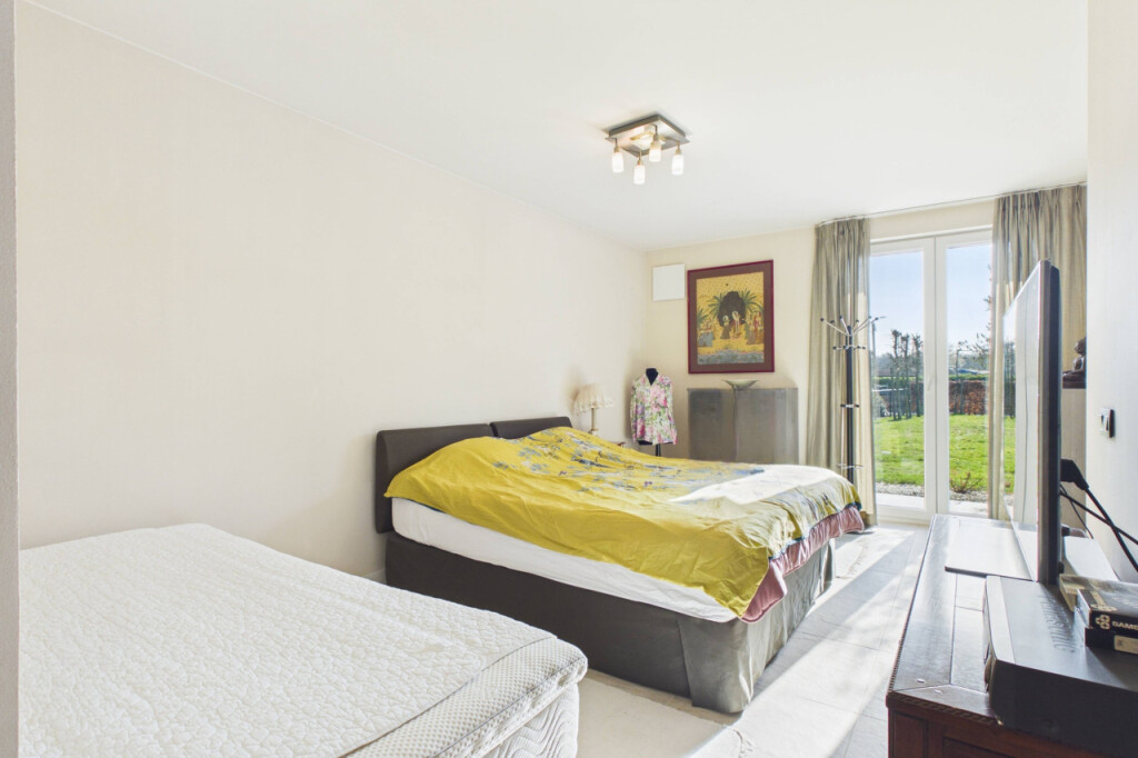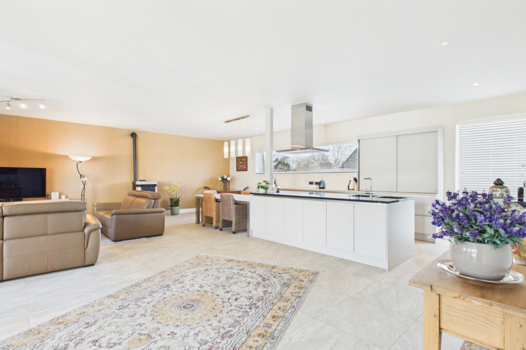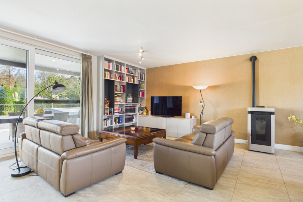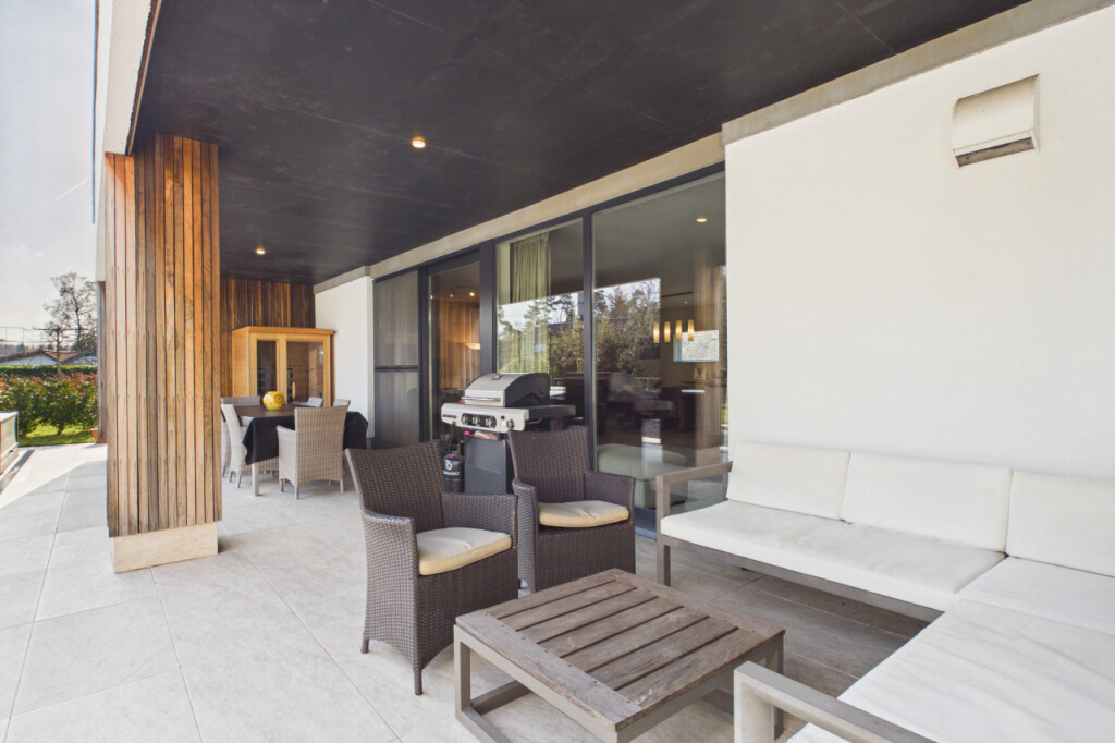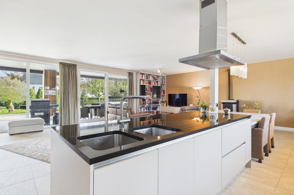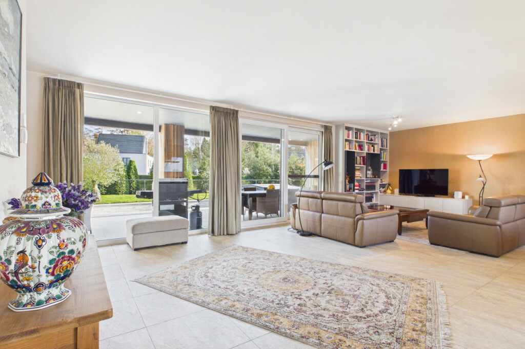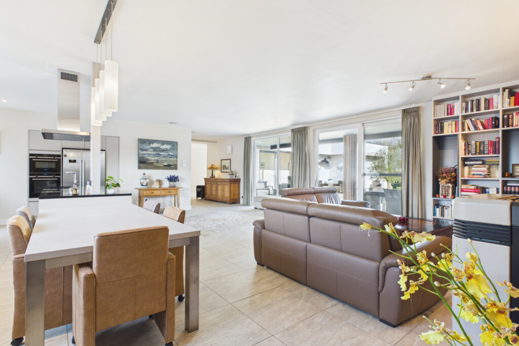 De leefruimte is ruim en licht, met grote raampartijen en een directe verbinding met de tuin en het overdekte terras.