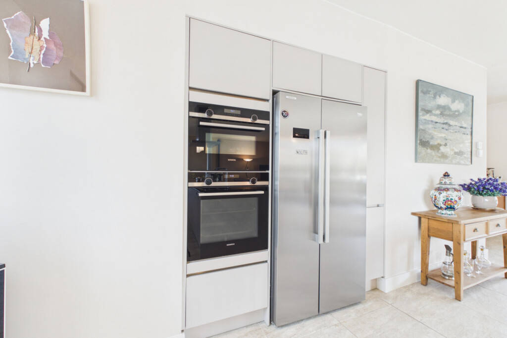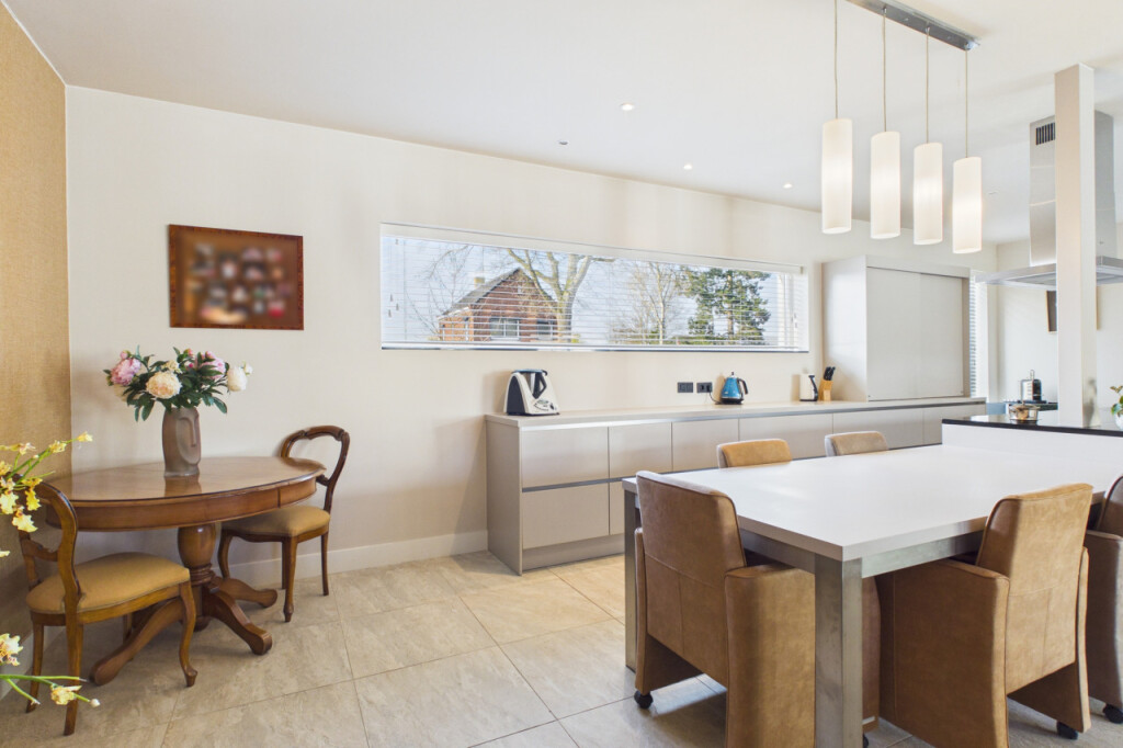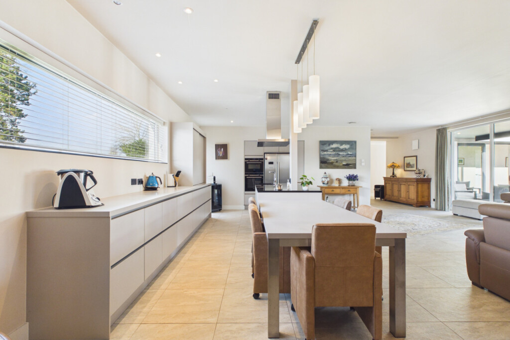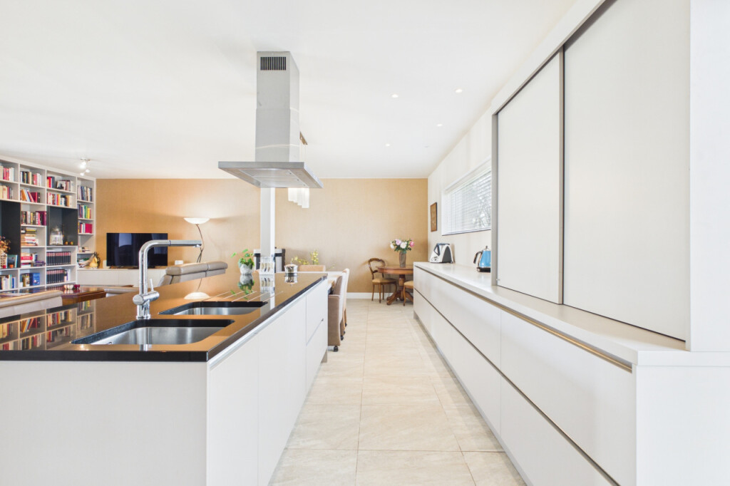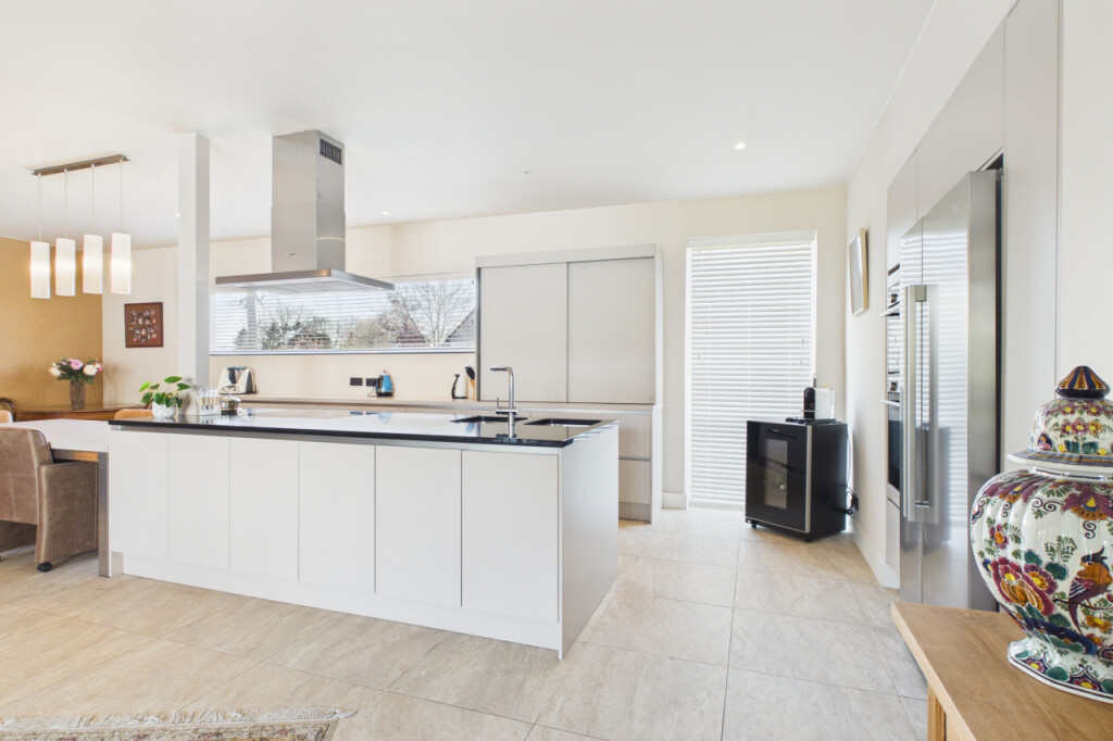 De open maatwerk keuken sluit hier naadloos op aan en is strak uitgevoerd met hoogwaardige inbouwapparatuur.