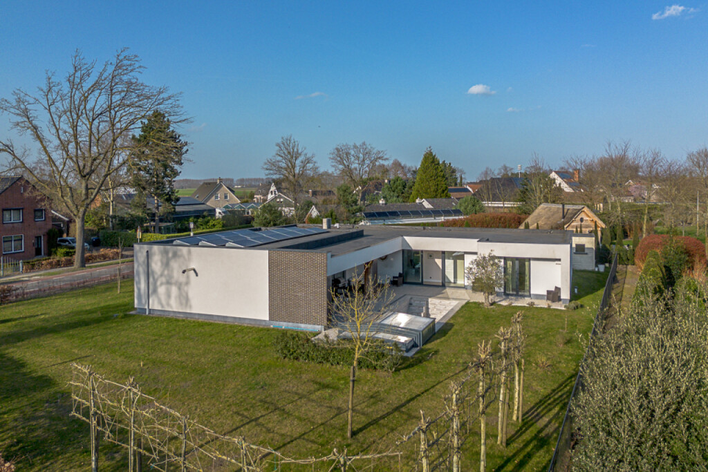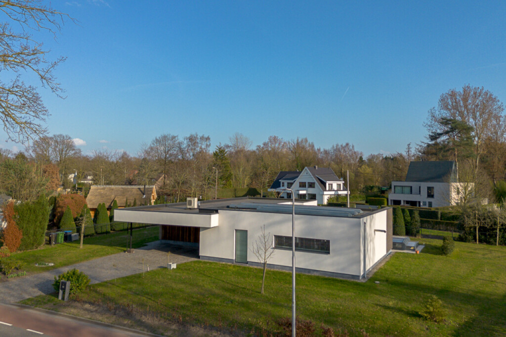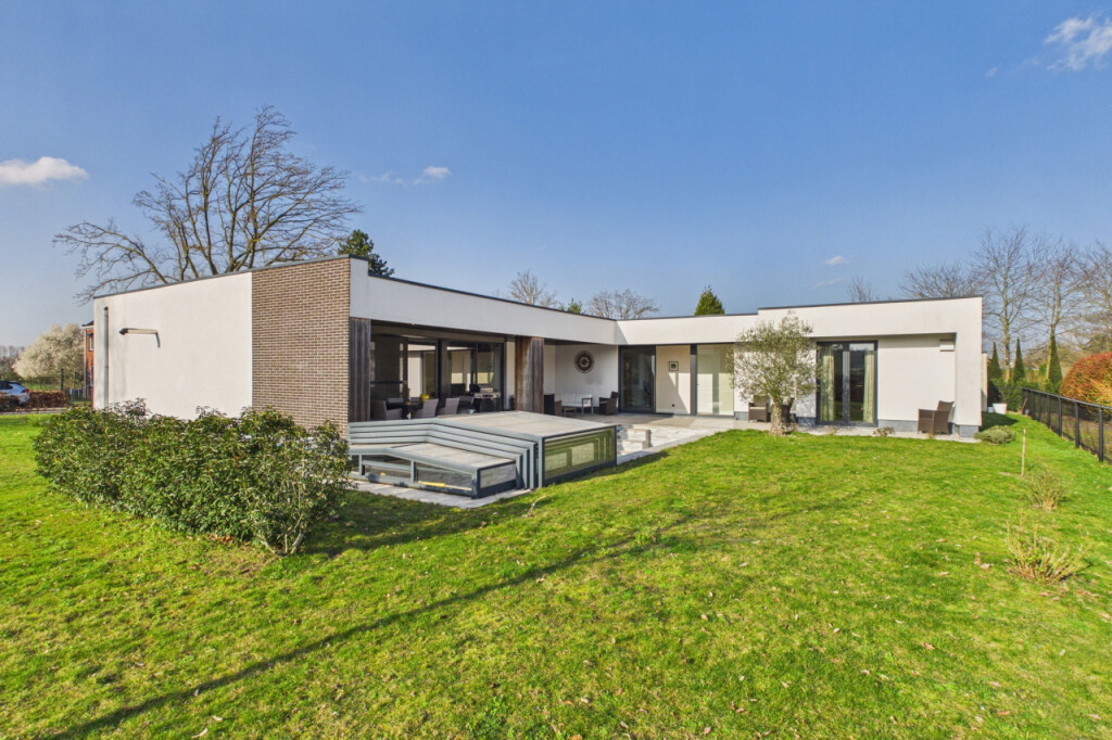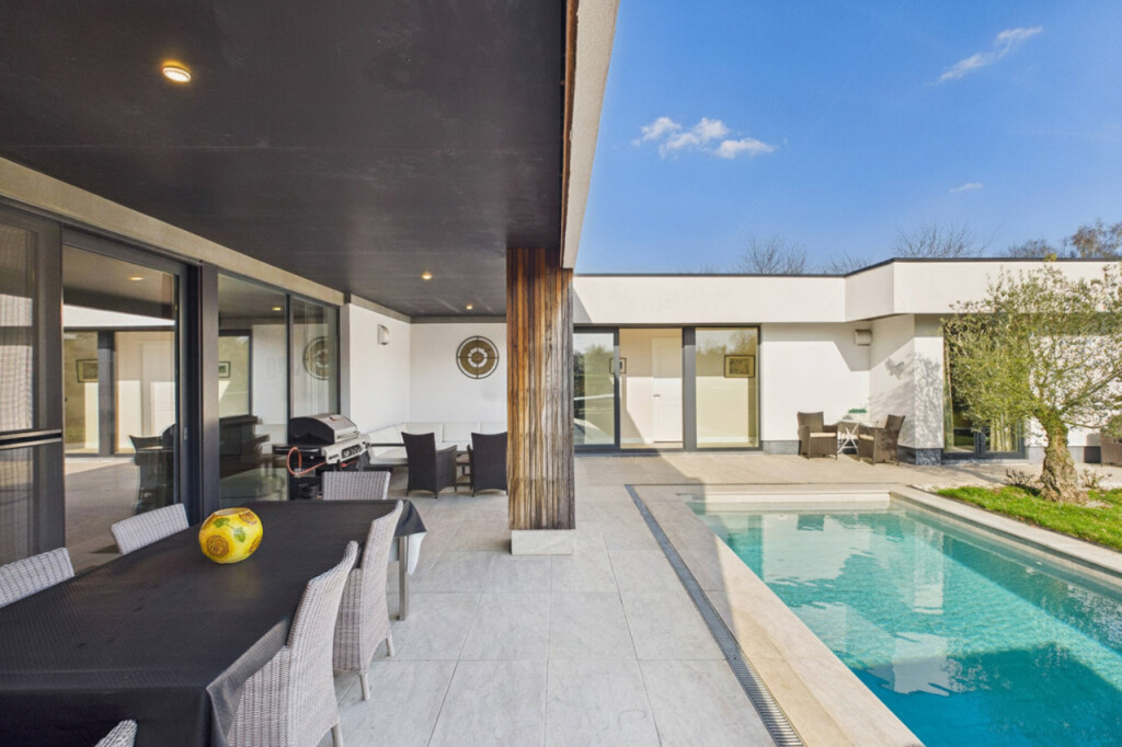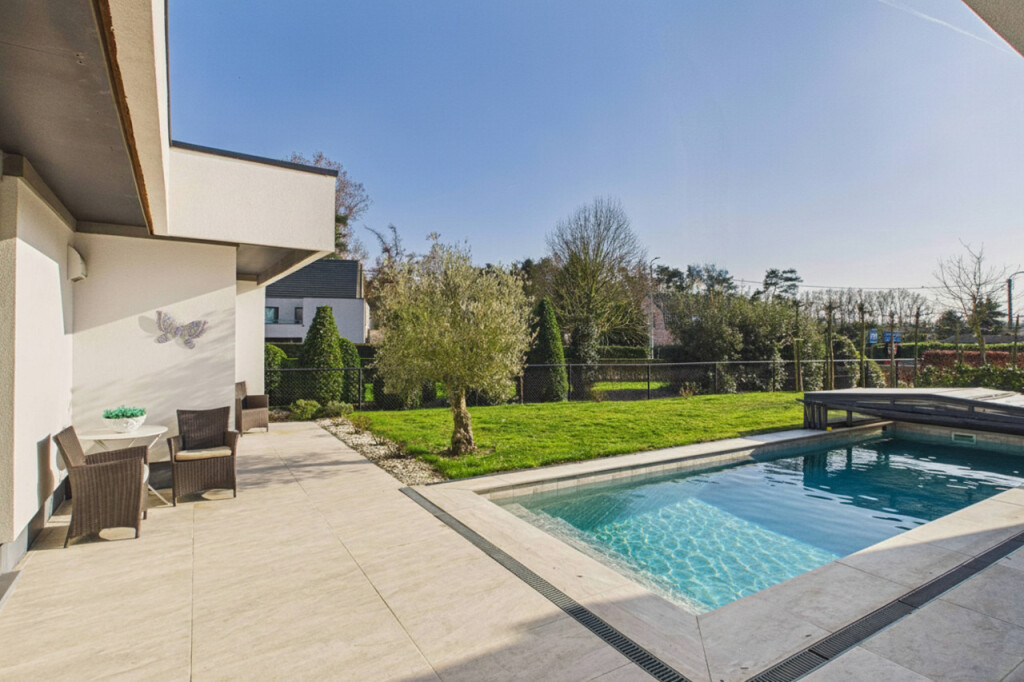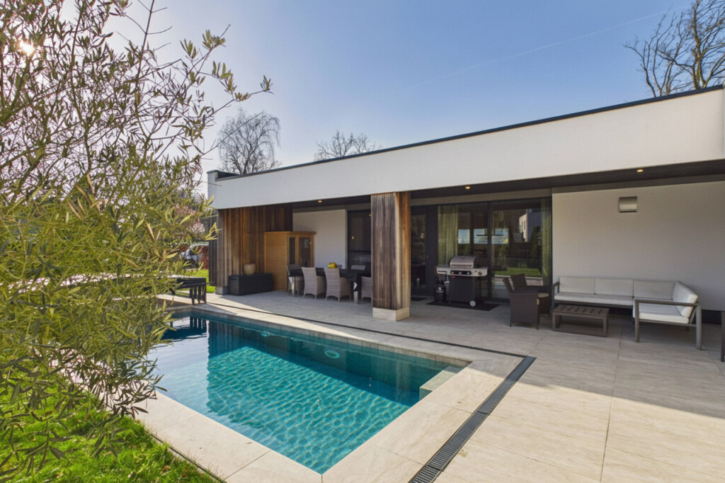 De tuin rondom biedt ruimte en privacy, met een grote terrasoverkapping als verlengstuk van de woonkamer. Het zwembad maakt het plaatje compleet.