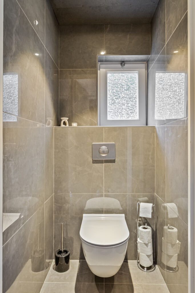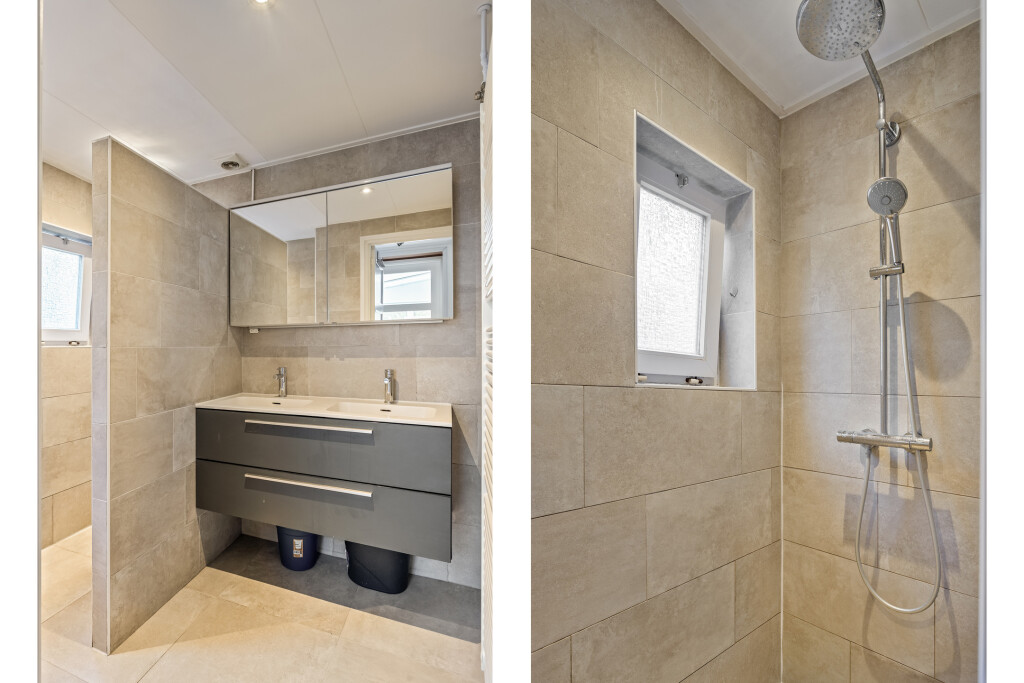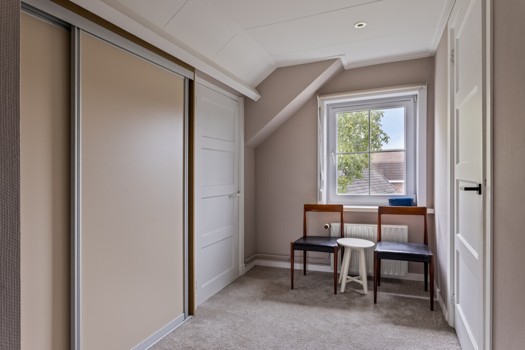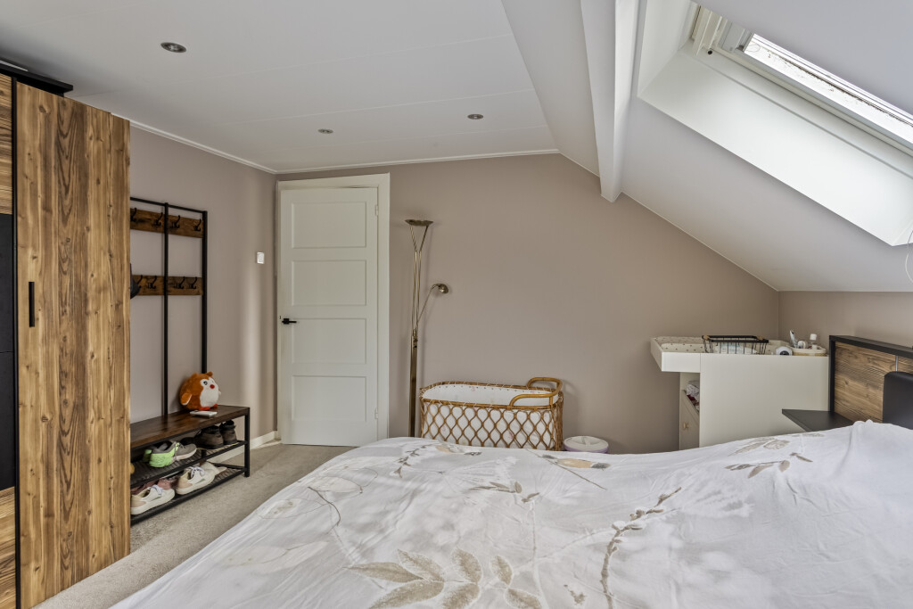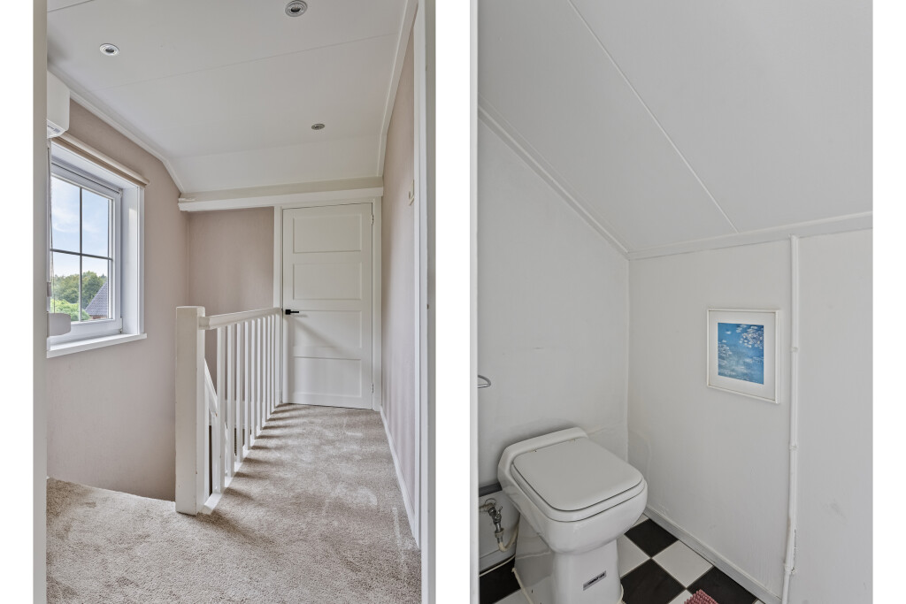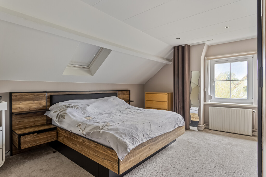 Via de vaste trap bereik je de overloop die toegang biedt tot twee ruime slaapkamers. De grootste slaapkamer beschikt over een airco en rolluiken, waardoor het er in elk seizoen comfortabel verblijven is. De tweede slaapkamer is eveneens voorzien van rolluiken en beschikt daarnaast over handige inbouwkasten. Op deze verdieping vind je verder nog een apart toilet met fonteintje.