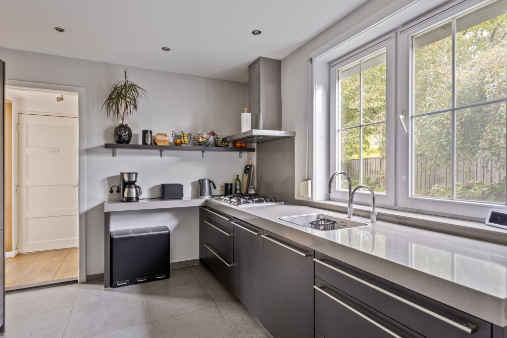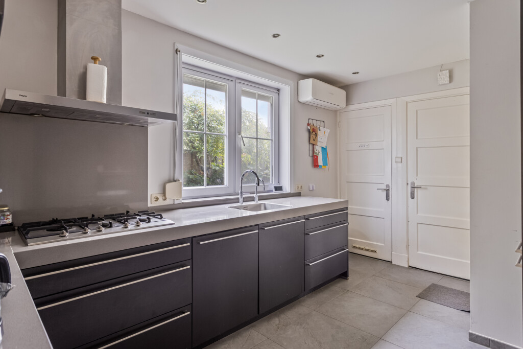 Bij binnenkomst in de hal heb je toegang tot de dichte keuken in hoekopstelling. Deze is volledig uitgerust met een 5-pits gaskookplaat, vaatwasser, koelkast en combi oven/magnetron. Ook zijn hier de aansluitingen voor wasmachine en droger aanwezig en hangt er een airco-unit die zowel kan koelen als verwarmen. Vanuit de keuken bereik je de ruime kelder: ideaal als voorraadruimte of wijnkelder.