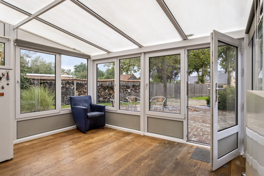 De gezellige woonkamer met houten vloer en houthaard nodigt uit tot ontspannen avonden. Aansluitend vind je de serre, eveneens voorzien van houten vloer en verwarming, waar je het hele jaar door geniet van uitzicht op de prachtige tuin.