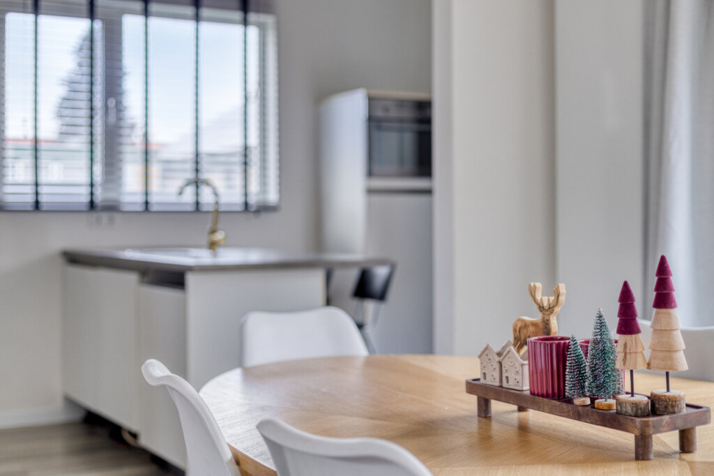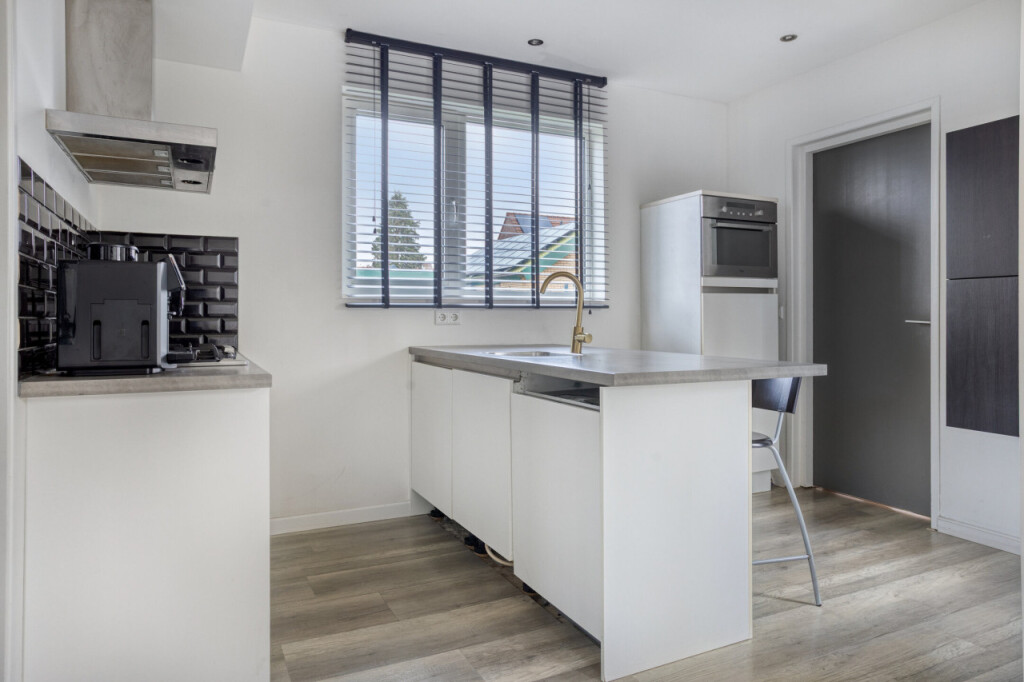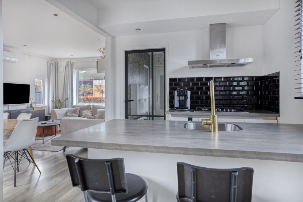 Entree in de hal met toilet, vernieuwde meterkast, trapopgang een trapkast. De knusse, gezellige woonkamer is voorzien van een airco en heeft bij de eethoek dubbele tuindeuren naar het terras. De open keuken heeft een rechte opstelling met een gasfornuis en afzuigkap. In het eiland met bar zit de vaatwasser (’25), verder is er een kast met koelkast en combi/oven. Vanuit de keuken is er een deur naar de aanbouw met handige bijkeuken. Hier treft u de wasmachine aansluiting en een deur naar de tuin.