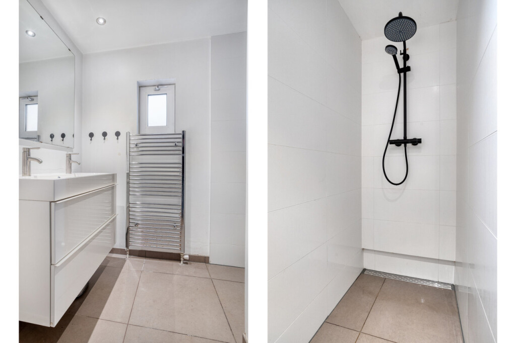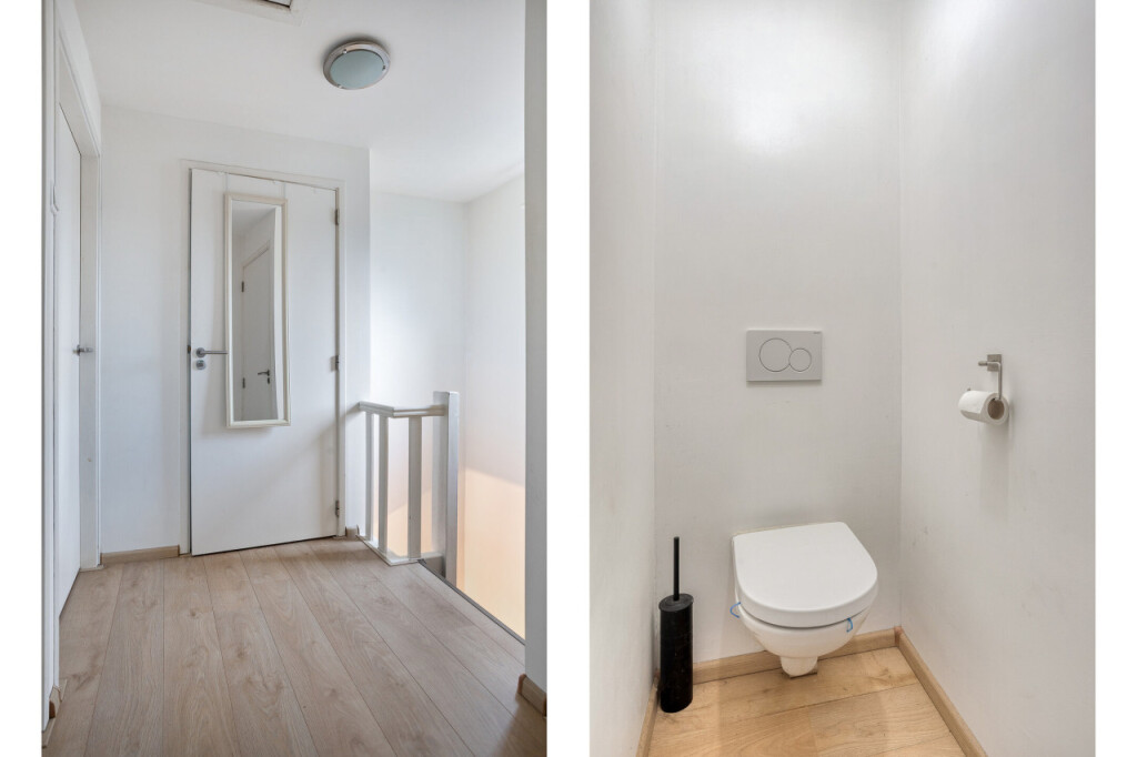 Overloop met toilet. Aan de achterzijde van de woning is er een ruime- en een kleinere slaapkamer.. Aan de achterzijde van de woning is er een middelgrote slaapkamer. Alle slaapkamers kamers zijn voorzien van elektrisch bedienbare rolluiken. De nette badkamer heeft een wasmeubel met grote wastafel en een inloopdouche.