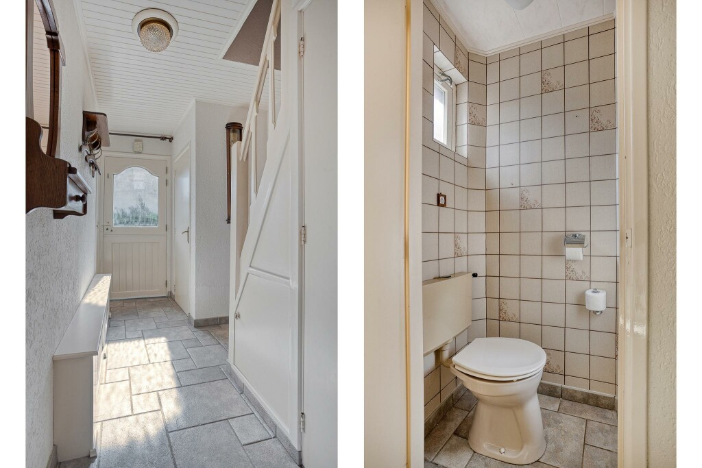 Entree in de hal met tegelvloer, toilet, meterkast, trapopgang en trapkast.