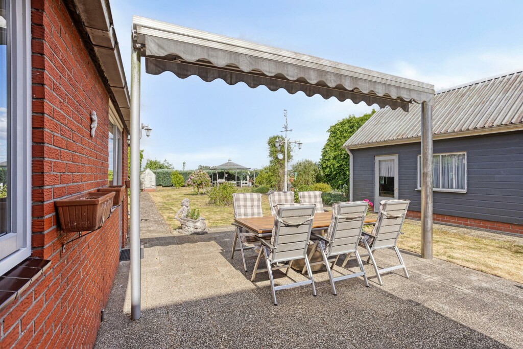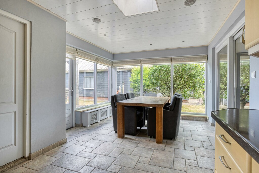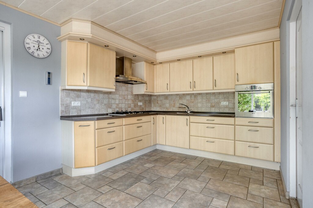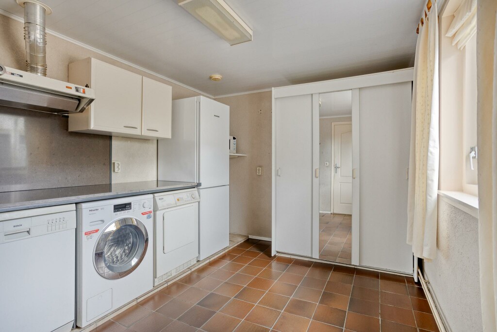 De nette, L-vorige woonkamer met tegelvloer is heerlijk licht door de vele raampartijen. Vanuit de woonkamer een ruime aanbouw met de eetkeuken. De keuken is eenvoudig en is voorzien van een gasfornuis, afzuigkap en oven. De keuken is voorzien van vloerverwarming en heeft een deur naar de tuin. In de grote bijkeuken is plaats voor o.a de wasapparatuur en hier staat tevens de hybride c.v-ketel (Intergas ’22).