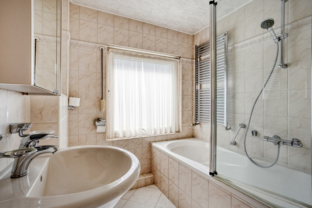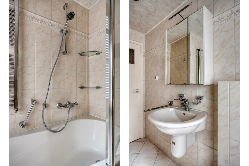 De nette badkamer is voorzien van een bad/douche combinatie, wastafel, 2e toilet en vloerverwarming.