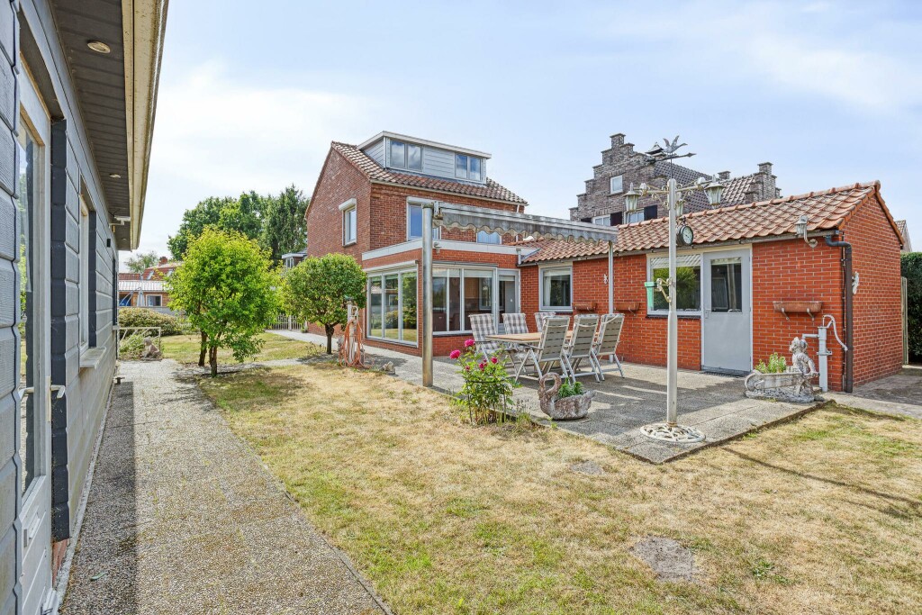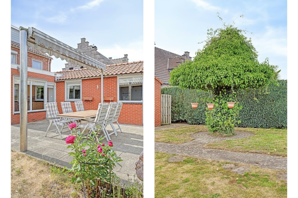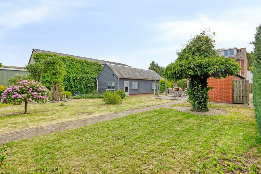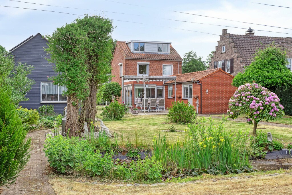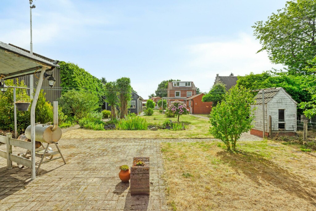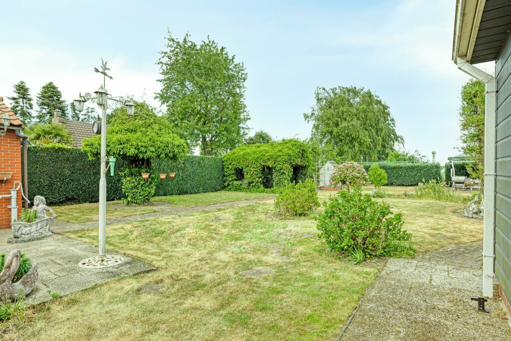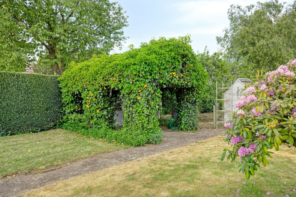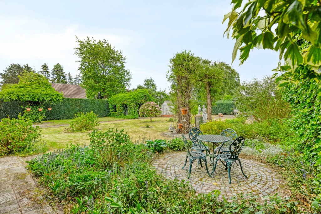 De diepe tuin is een heerlijke plek om helemaal tot rust te komen. Grenzend aan de woning een fijn terras met zonnescherm of zoek één van de heerlijke plekjes achterin de tuin of onder de overkapping. De tuin heeft een heerlijk gazon met diverse bloemborders en achterin de tuin een fraaie vijverpartij. Grenzend aan de woning is er een berging/tuinkamer die eventueel ook bij de woning getrokken kan worden en als extra kamer kan fungeren.