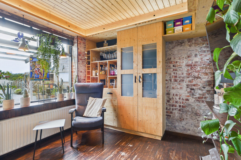Bij binnenkomst kom je in de woonkeuken, uitgevoerd in lichte houttinten en voorzien van inbouwapparatuur. Vanuit hier is er een doorgang naar de woonkamer, die door de grote ramen prettig licht is. De woonkamer heeft een vaste kast en een aparte zithoek, met een trap die toegang geeft tot de eerste verdieping. De badkamer is praktisch ingericht met douche, wastafel, toilet, witgoedaansluiting en extra bergruimte.