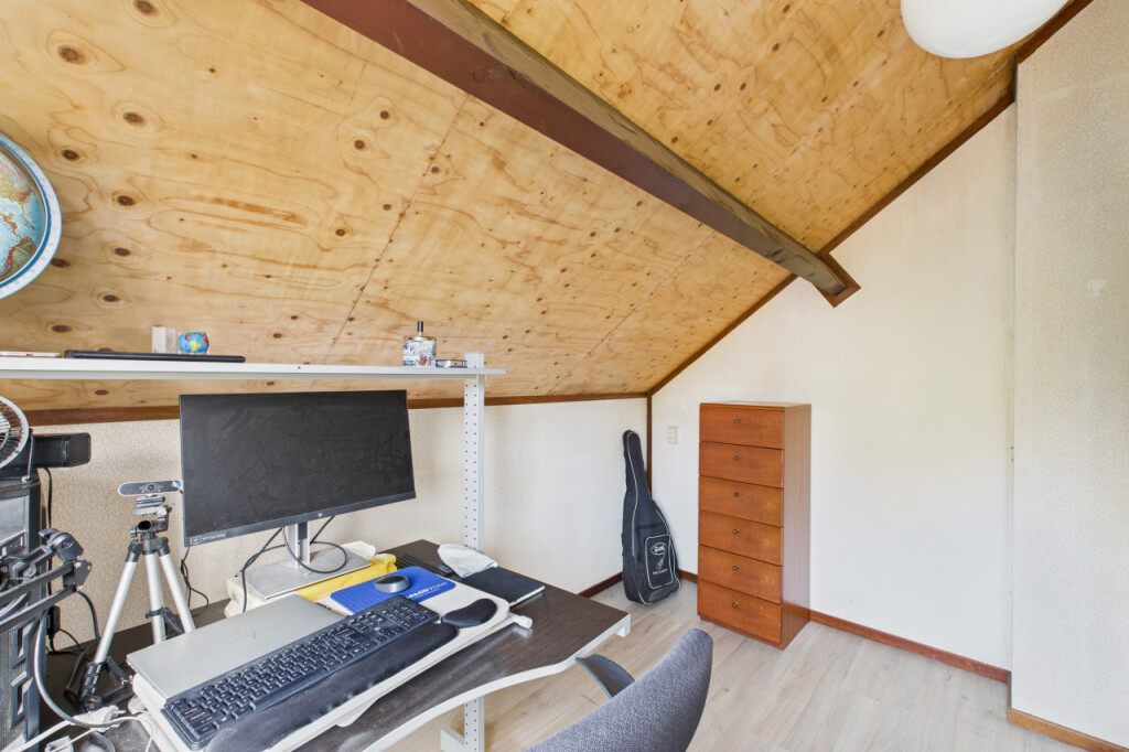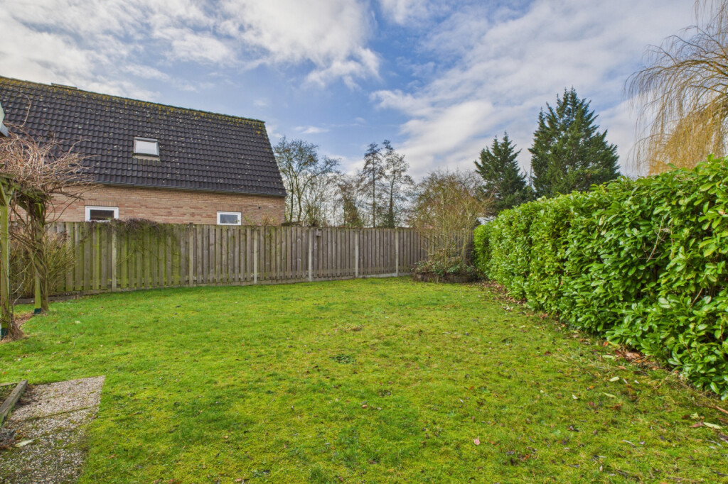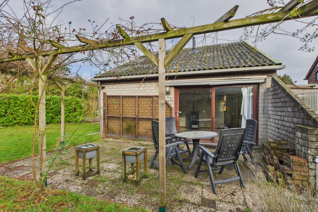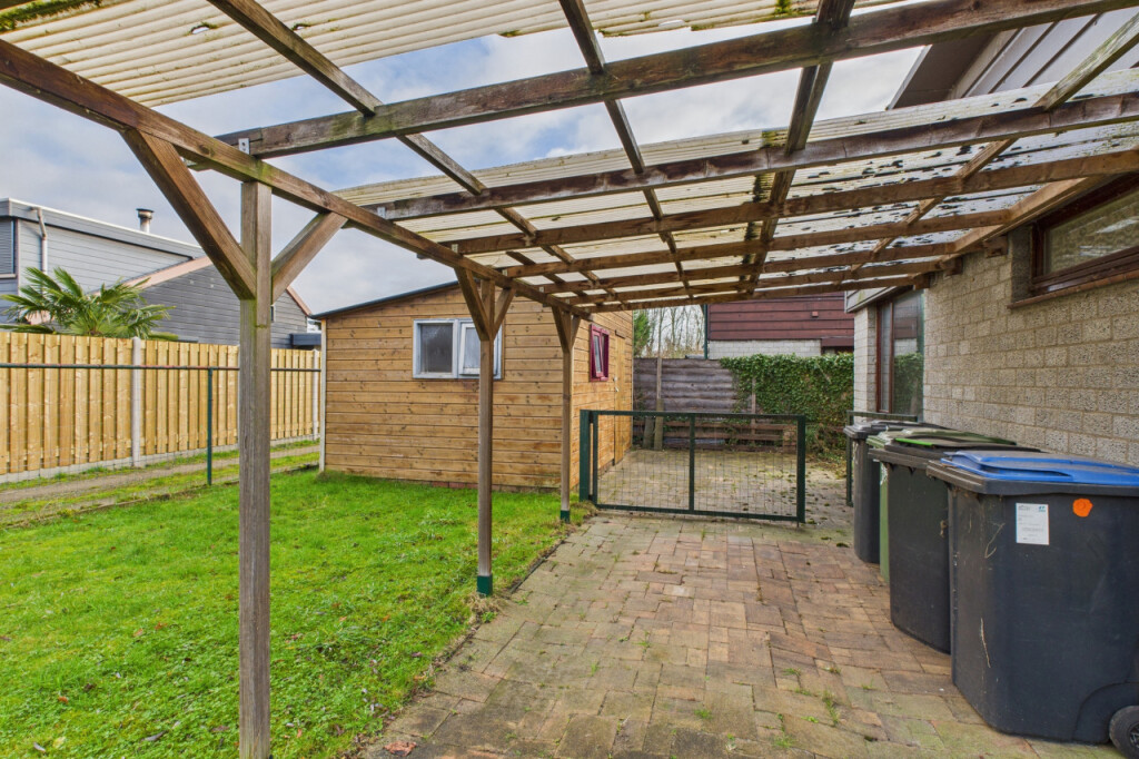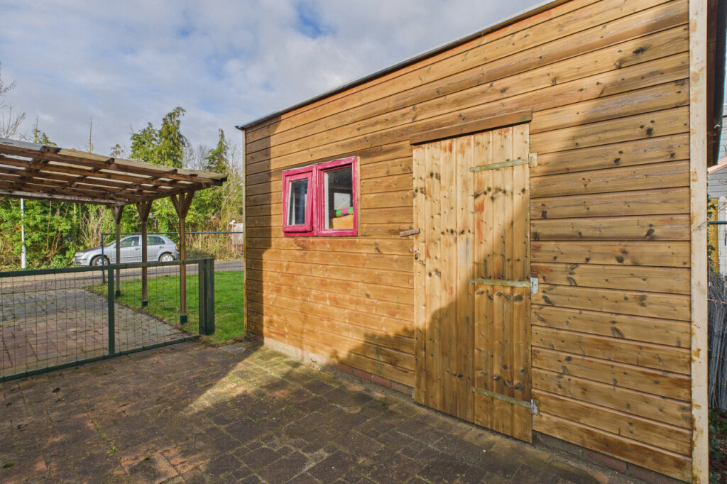 De tuin vormt een belangrijk onderdeel van het woonplezier. Rondom de woning ligt een royale tuin met terras, een groot gazon en een tuinhuis, waardoor er altijd een fijne plek in de zon of schaduw te vinden is. In de tuin bevindt zich daarnaast een houten berging met elektra, ideaal voor het opbergen van fietsen en tuingereedschap. De oprit met overkapping op eigen terrein zorgt voor extra gemak en parkeerruimte.