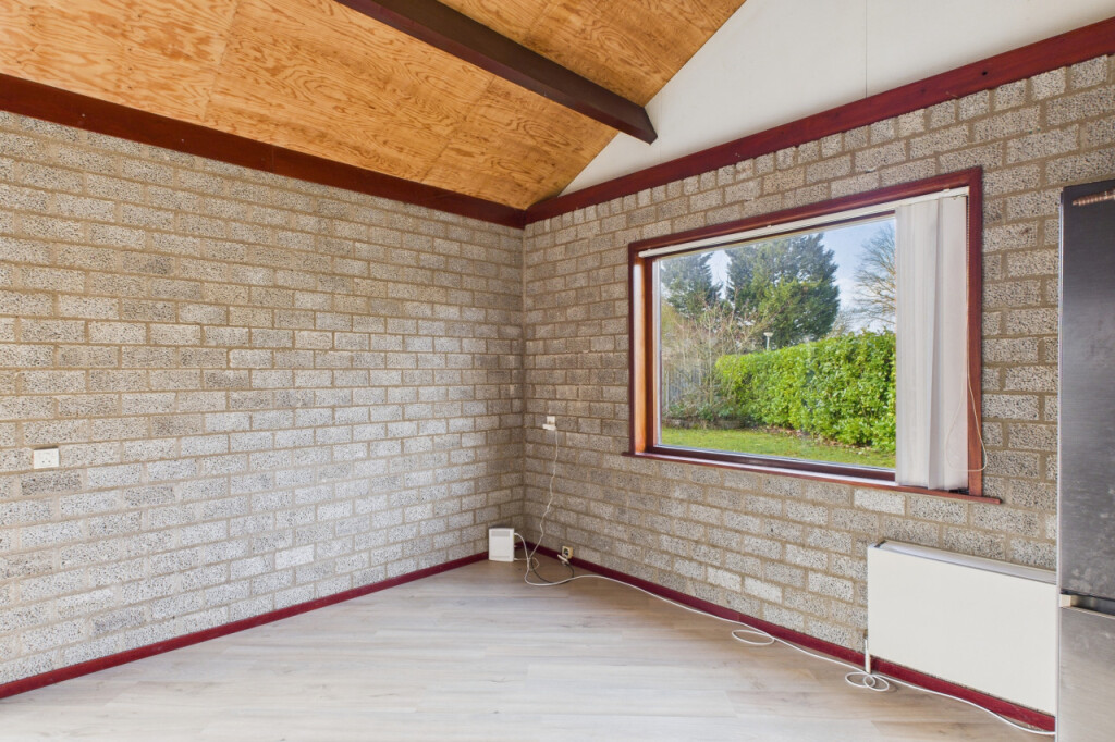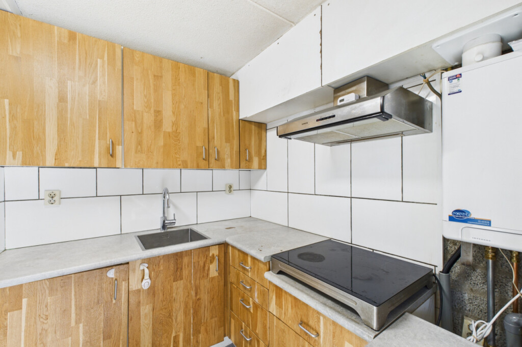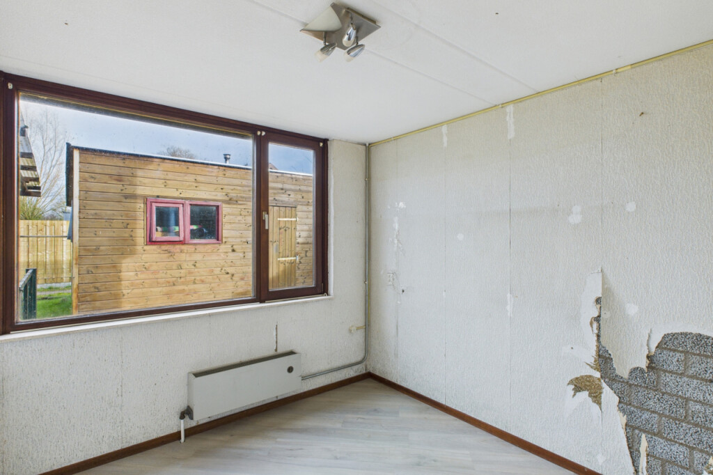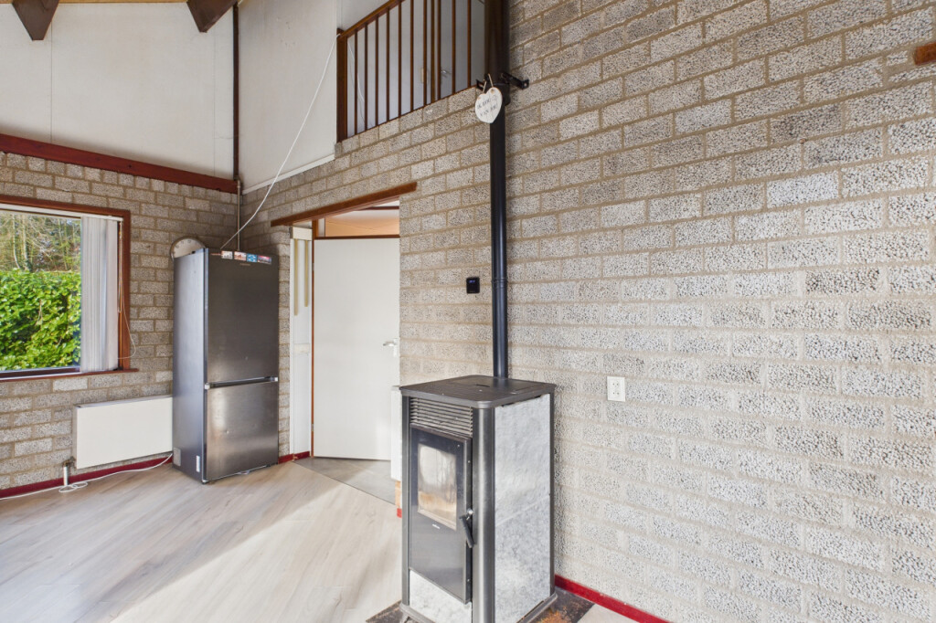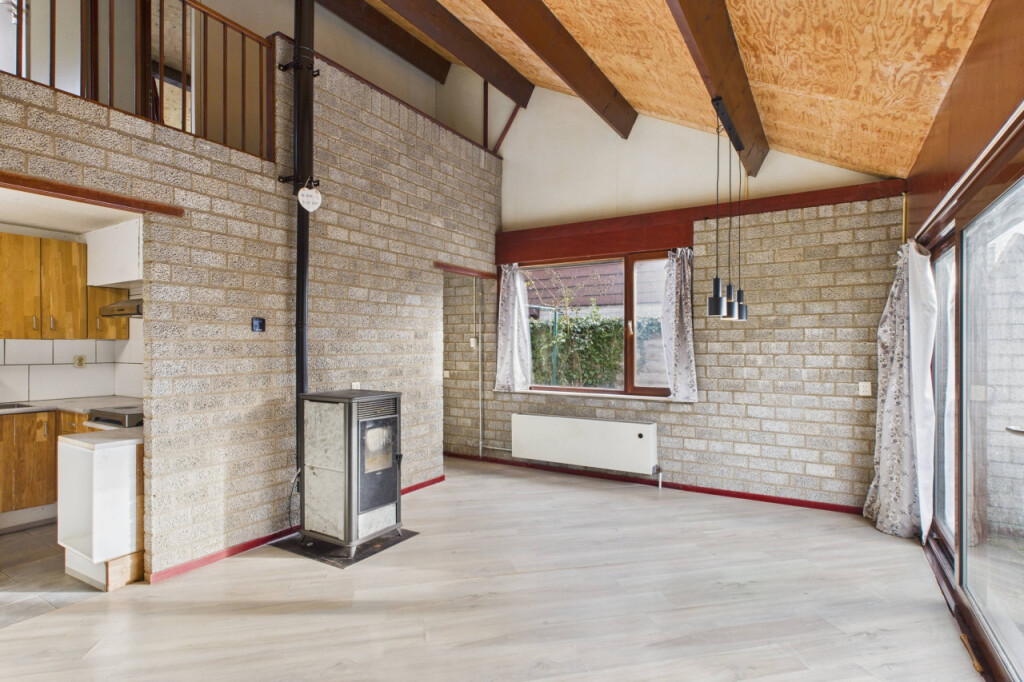 Je komt de woning binnen in de hal met plavuizenvloer en meterkast, die toegang geeft tot de verschillende vertrekken. De woonkamer is voorzien van een laminaatvloer en ademt een gezellige sfeer dankzij de palletkachel. Via de schuifpui staat de woonkamer in directe verbinding met de tuin, waardoor binnen en buiten mooi in elkaar overlopen. De open keuken is eenvoudig maar praktisch ingericht en beschikt over een compact keukenblok met elektrische kookplaat en afzuigkap. Op de begane grond bevindt zich tevens een slaapkamer met aangrenzend de badkamer en suite, wat deze woning zeer geschikt maakt voor gelijkvloers wonen. De volledig betegelde badkamer is ingericht met een douche, wastafel, toilet en witgoedaansluitingen en is zowel vanuit de slaapkamer als vanuit de hal bereikbaar.