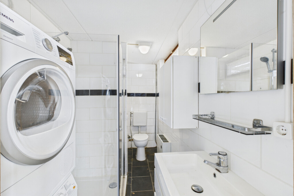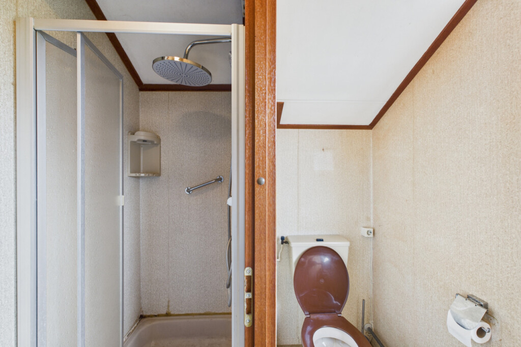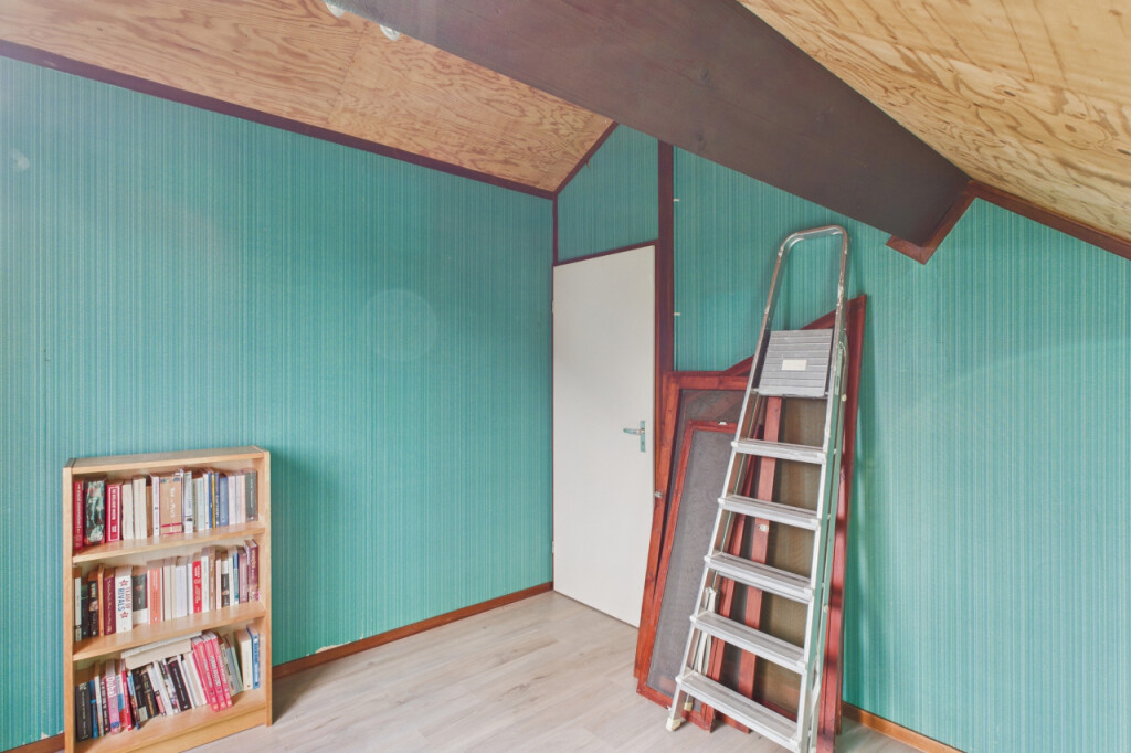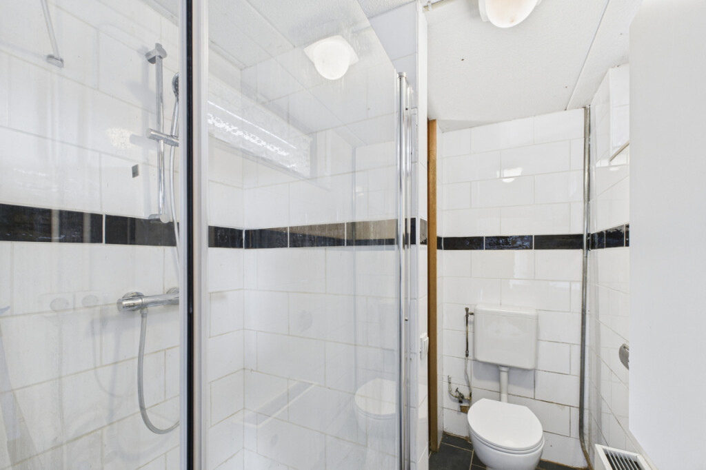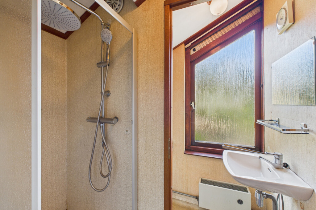 Op de eerste verdieping heb je via een open overloop toegang tot twee slaapkamers. Deze verdieping is praktisch ingedeeld en biedt volop ruimte voor een gezin, logees of een werk- of hobbykamer. Ook bevindt zich hier een tweede, eenvoudige badkamer met douchecabine, wastafel en toilet, wat het comfort op deze verdieping compleet maakt.