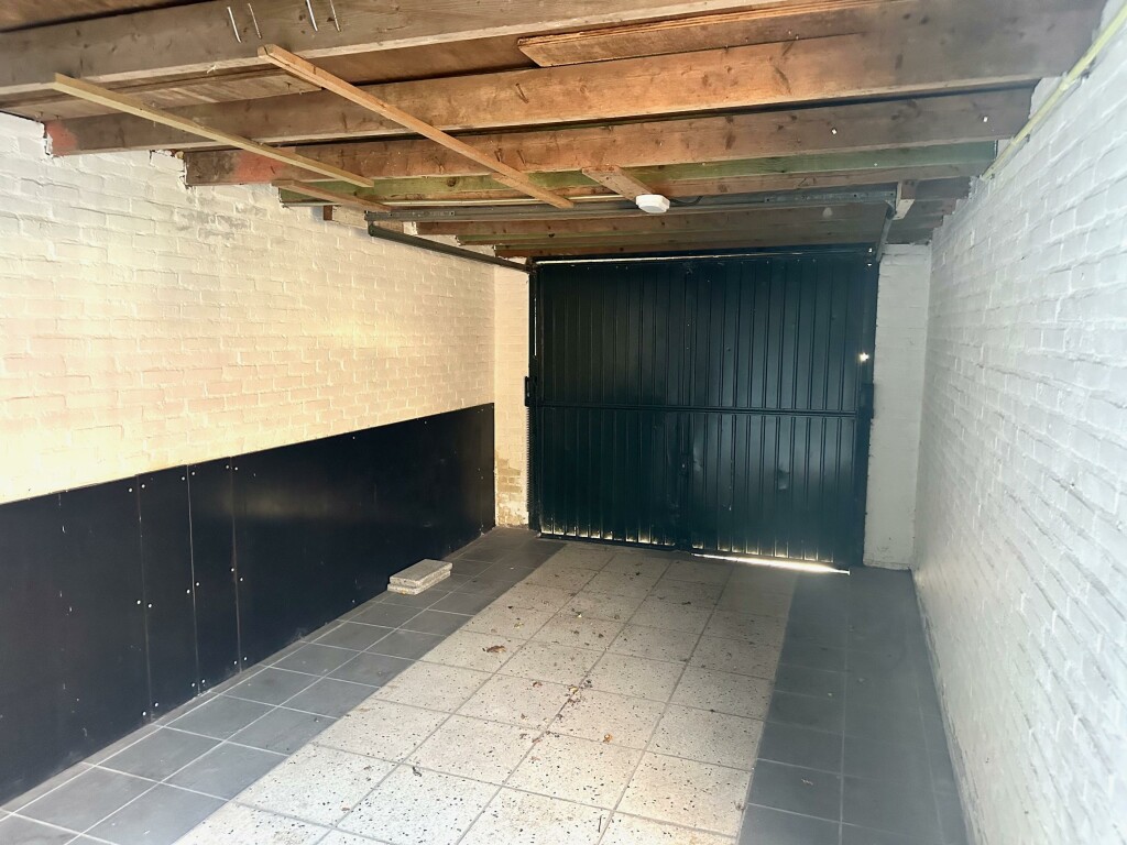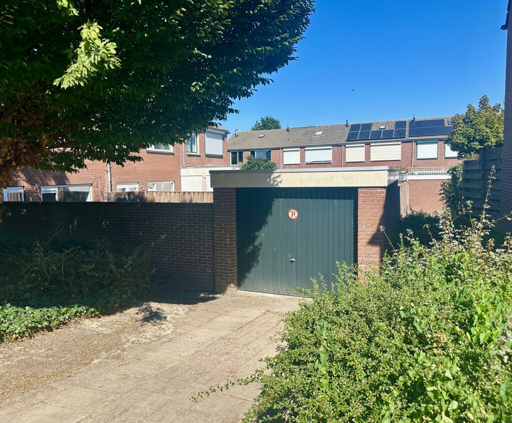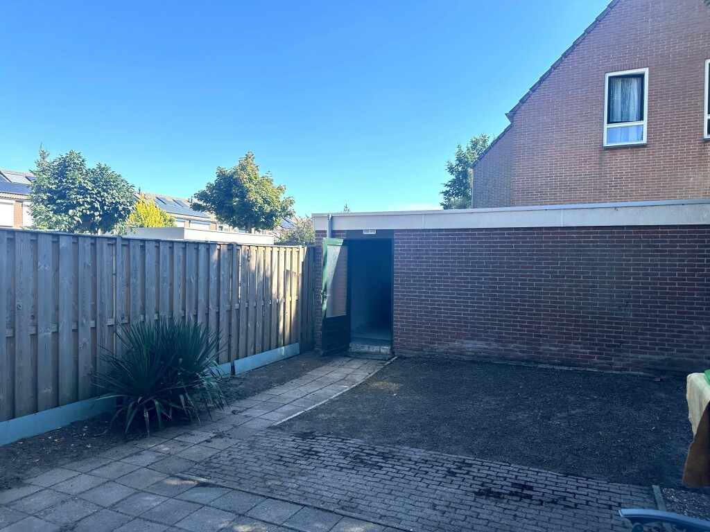 De woning beschikt over een kleine voortuin en een achtertuin die bereikbaar is via een poort aan de zijkant. De garage staat achterin de tuin.