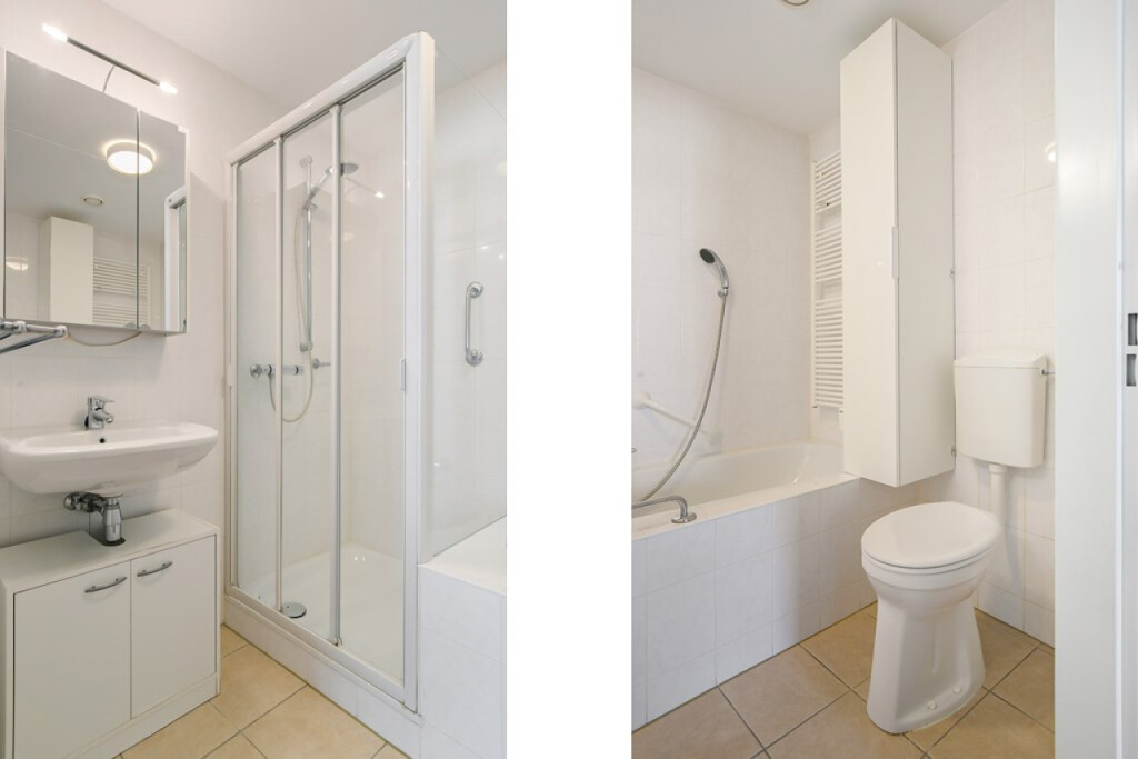 De ruime hal leidt naar alle vertrekken, waaronder twee slaapkamers (respectievelijk 17m² en 10m²), het toilet, een berging met witgoedaansluiting, een volledig betegelde badkamer met zowel een bad als douche en een tweede toilet.