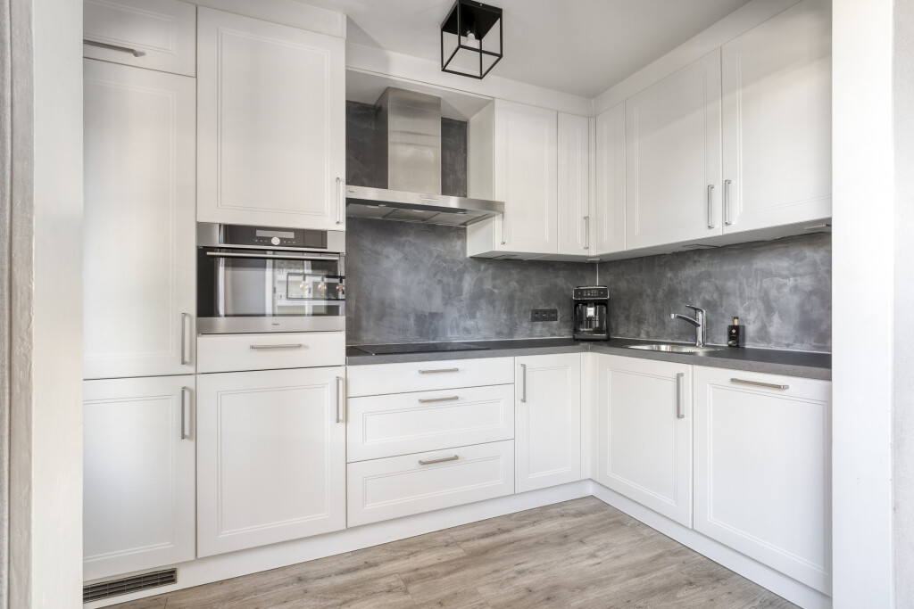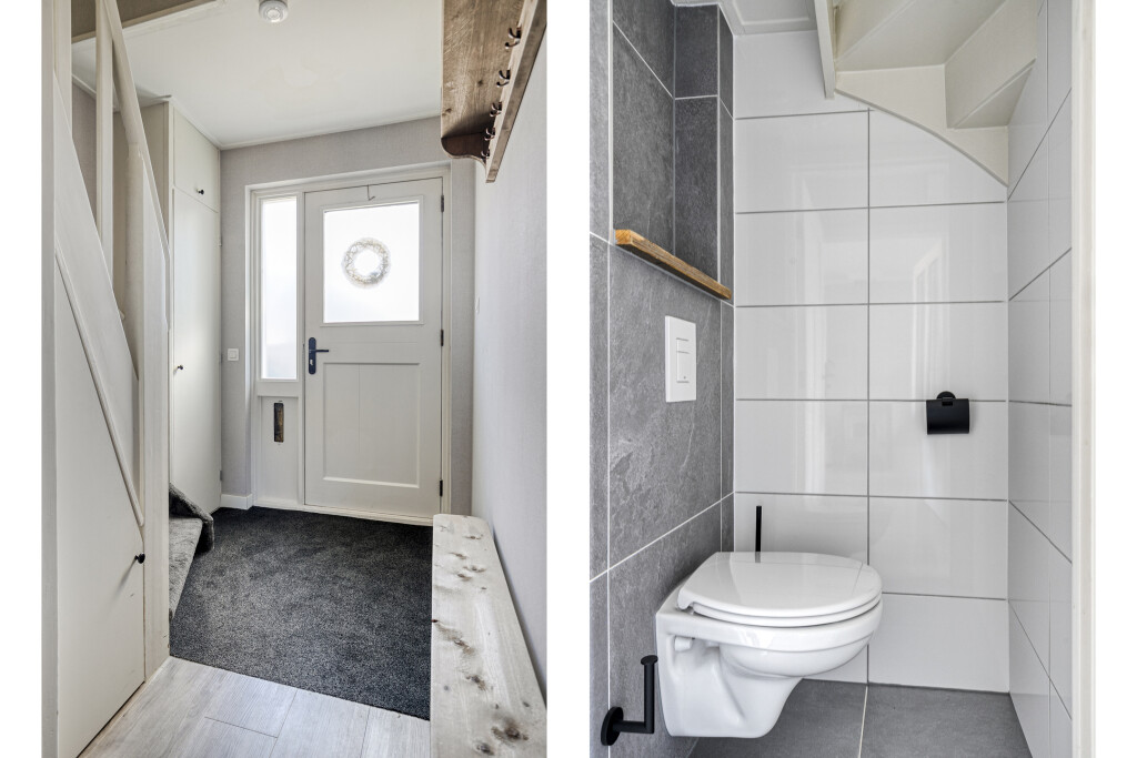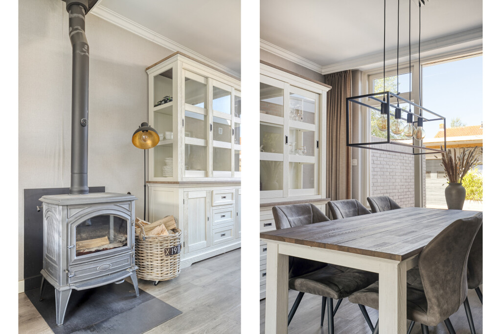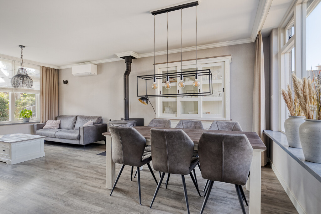 Bij binnenkomst kom je in de hal met de trapopgang, meterkast en het toilet. Vanuit hier stap je de woonkamer in: een lichte doorzonkamer waar de gezellige haard meteen de blik vangt. Hier is genoeg ruimte voor een fijne zithoek en een grote eettafel waar je samen met familie en vrienden lange avonden kunt doorbrengen. De open keuken sluit hier perfect op aan en is uitgevoerd met moderne inbouwapparatuur, waardoor koken een plezier wordt. Achter de keuken ligt de praktische bijkeuken met witgoedaansluitingen en een deur naar de achtertuin.
