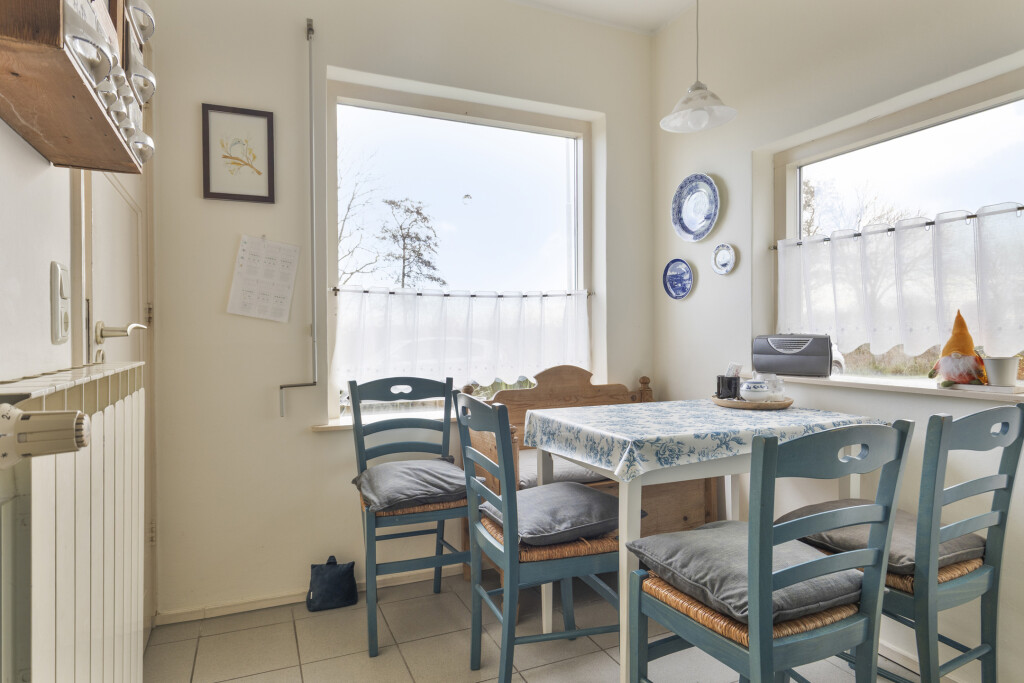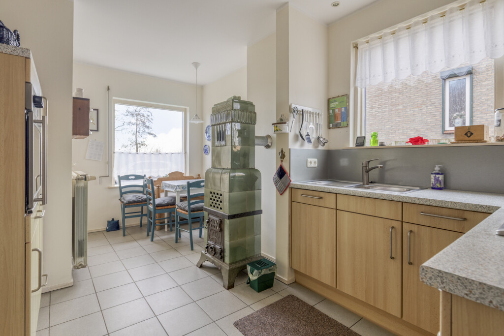 De gesloten keuken is een gezellige plek in huis, mede dankzij de sfeervolle houtkachel en ruimte voor een knusse zithoek. De keuken is compleet uitgerust met inbouwapparatuur: een 4-pits gaskookplaat, afzuigkap, oven, koelkast, vriezer en vaatwasser. Vanuit de keuken loopt u door naar de bijkeuken, die toegang geeft tot de eerste badkamer en de serre. Deze badkamer op de begane grond is voorzien van een douche, wastafel en toilet. De lichte serre vormt de perfecte overgang naar het buitenleven.