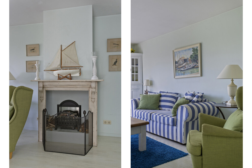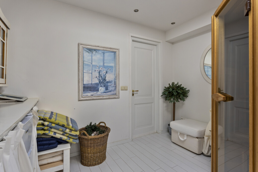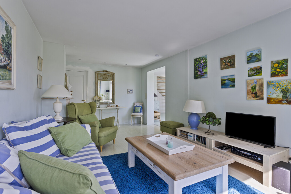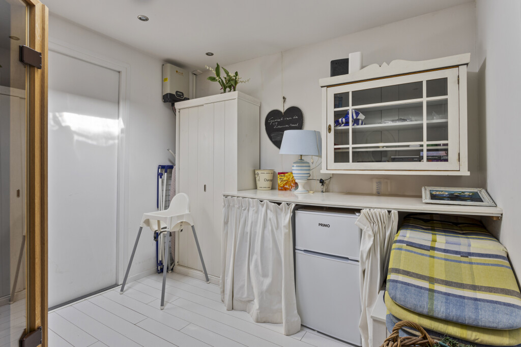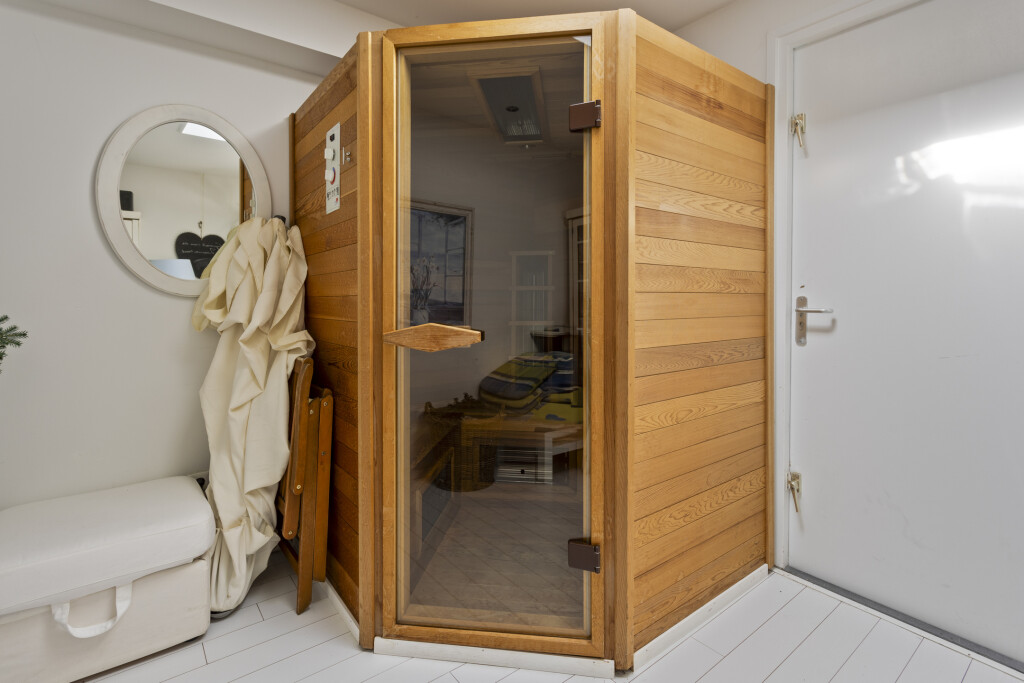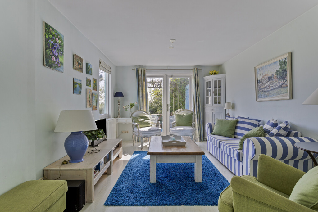 De eetkamer loopt over in de sfeervolle woonkamer, die is gesitueerd in de aanbouw. Dankzij de openslaande deuren geniet u hier van veel lichtinval en directe toegang tot de zonnige achtertuin. De woonkamer is voorzien van een gezellige open haard en biedt tevens toegang tot een praktische berging met sauna en wasmachineaansluiting.