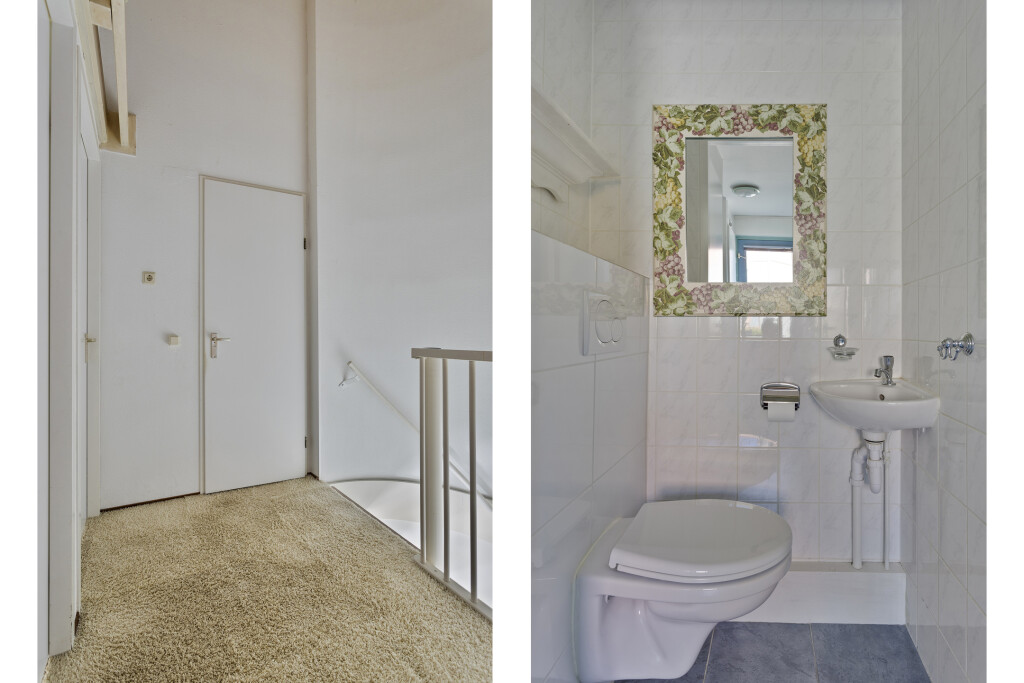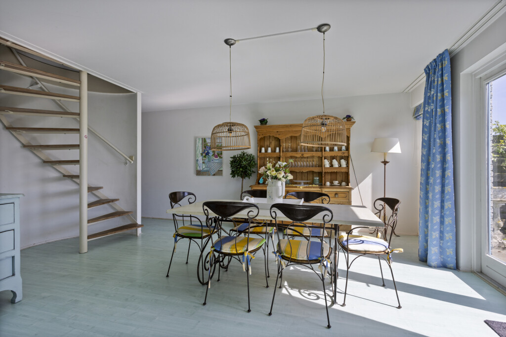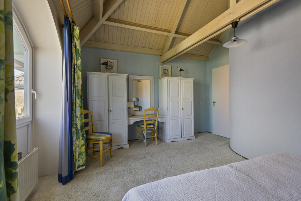 Via de ronde trap in de eetkamer bereikt u de bovenverdieping. Hier vindt u een overloop met toegang tot drie ruime slaapkamers en een badkamer met douchecabine, wastafelmeubel, toilet en een Velux dakraam voor extra daglicht.