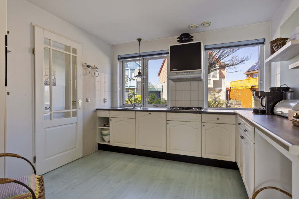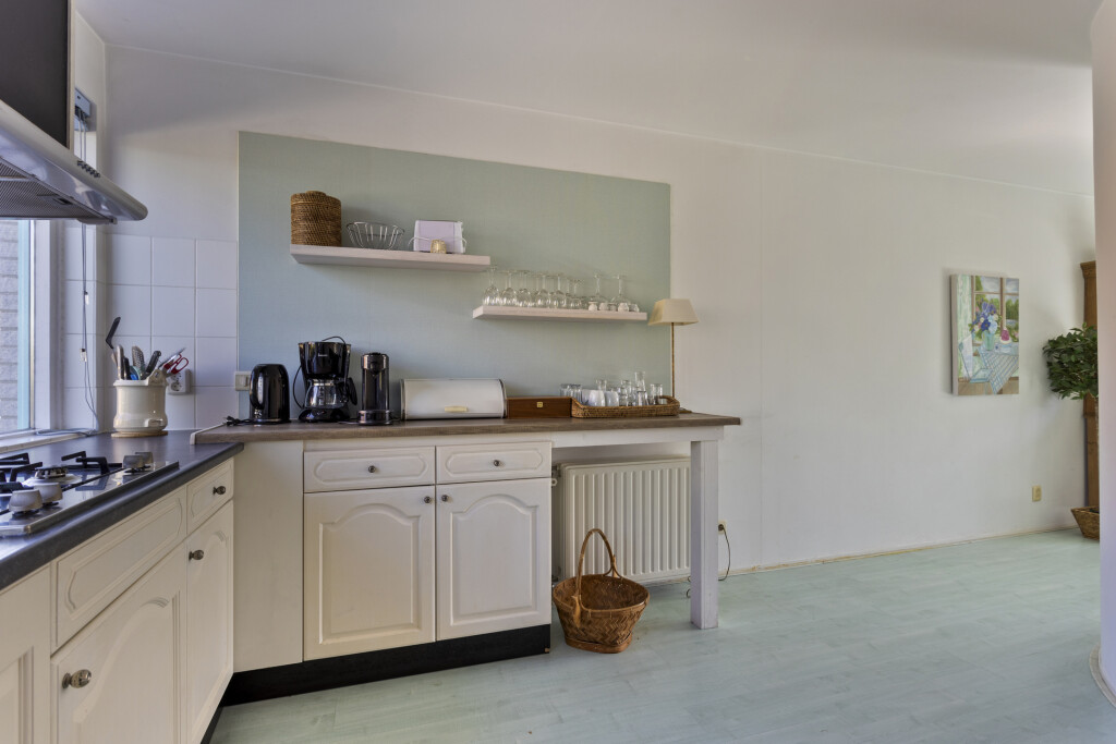 U betreedt de woning via de hal met toegang tot een separate toiletruimte en de open keuken met aangrenzende eetkamer. De keuken is compleet uitgerust met diverse inbouwapparatuur, waaronder een 4-pits gaskookplaat, afzuigkap, combi-oven, koelkast en vaatwasser.