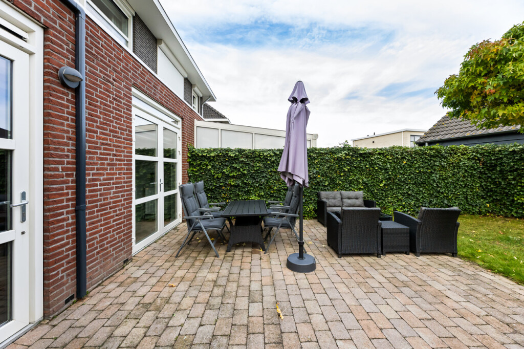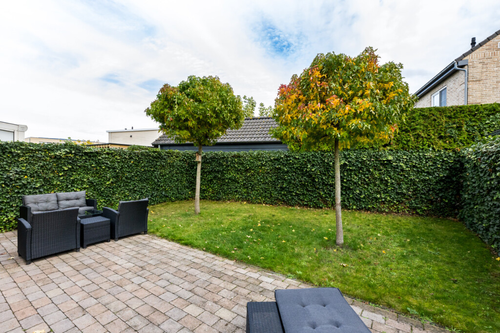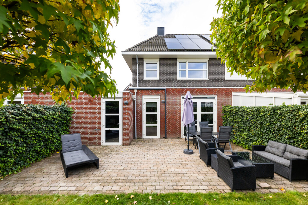 De achtertuin is een fijne verlenging van het wooncomfort. Gelegen op het oosten, met een verzorgd gazon en een royaal terras direct aan de woning, is het de ideale plek om te ontspannen, te genieten van de ochtendzon of kinderen veilig te laten spelen. Aan de woning grenst de aangebouwde stenen garage, die ruimte biedt voor opslag, fietsen of hobby’s en bovendien via de tuin bereikbaar is.