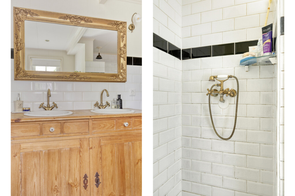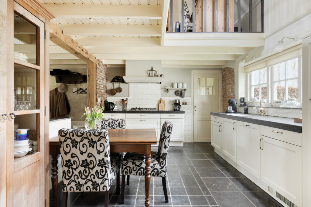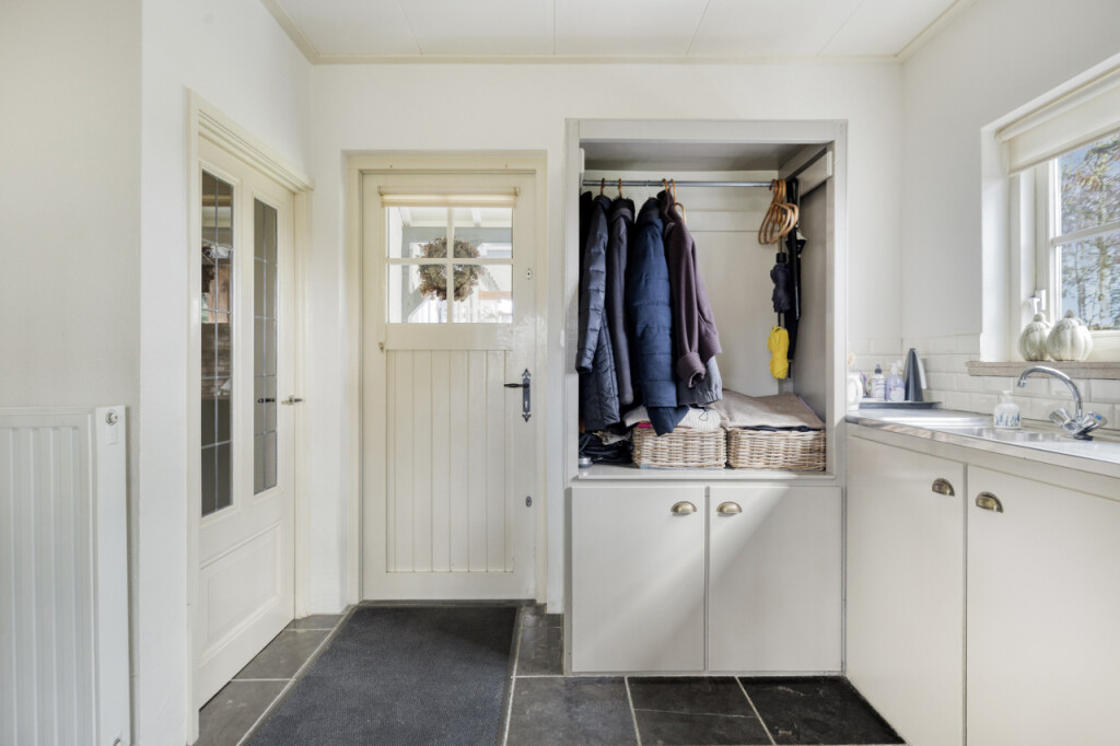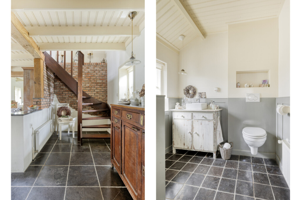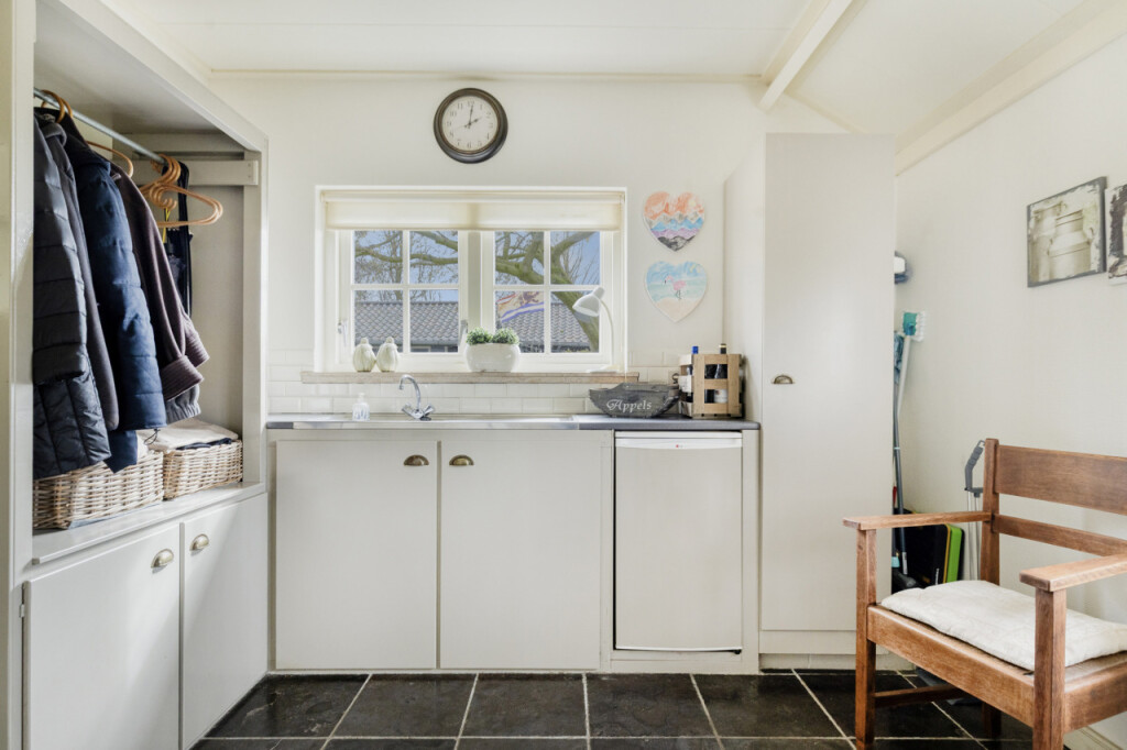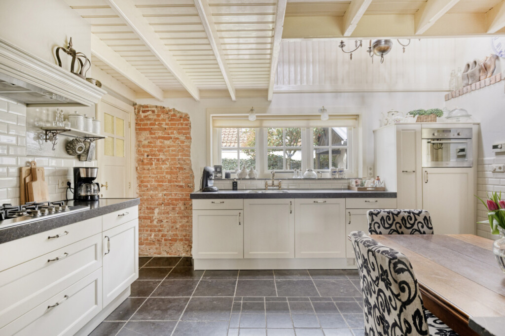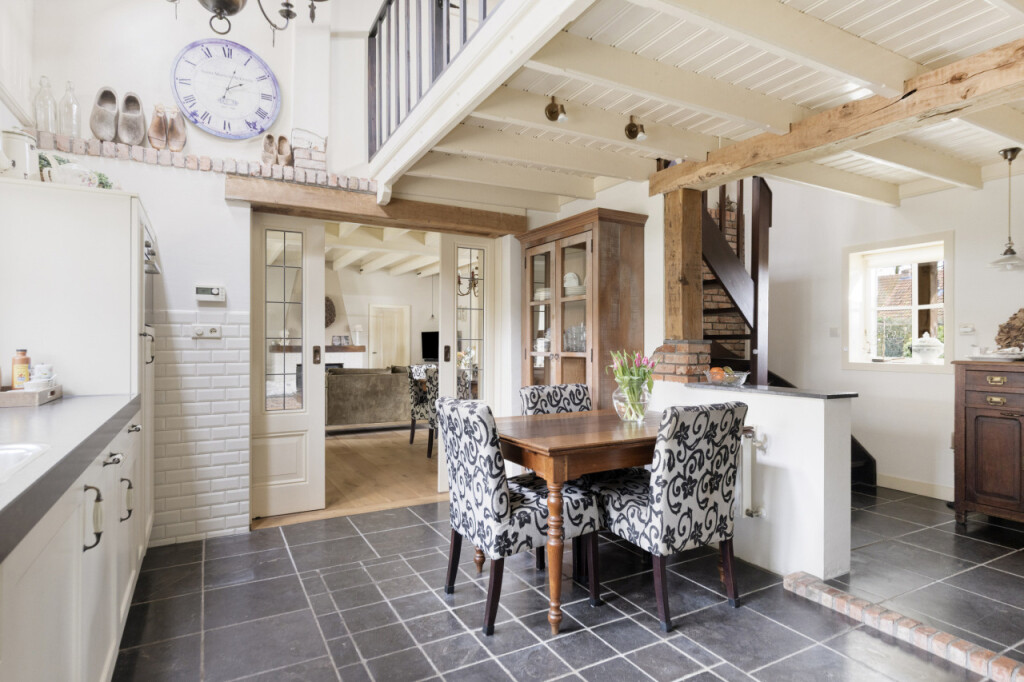 Zoals dat zo mooi past bij een woning op het platteland, kom je hier via de achterdeur binnen in de bijkeuken. Een praktische ruimte met een keukenblad en spoelbak, een extra koelkast en de meterkast (vernieuwd in 2012). Ook vind je hier het ruime toilet. Via de bijkeuken kom je in de gezellige keuken. De keuken is voorzien van een 5-pits gasfornuis, vaatwasser, koelkast en magnetron en afgewerkt met een stijlvol composiet werkblad. Ook hier vallen meteen de authentieke elementen op: robuuste houten balken en deels zichtbare bakstenen muren geven de ruimte een warme en karaktervolle uitstraling. Dankzij de vide voelt de keuken verrassend ruim en licht aan. Vanuit de keuken heb je toegang tot een tweede bijkeuken met aansluitingen voor wasmachine en droger.