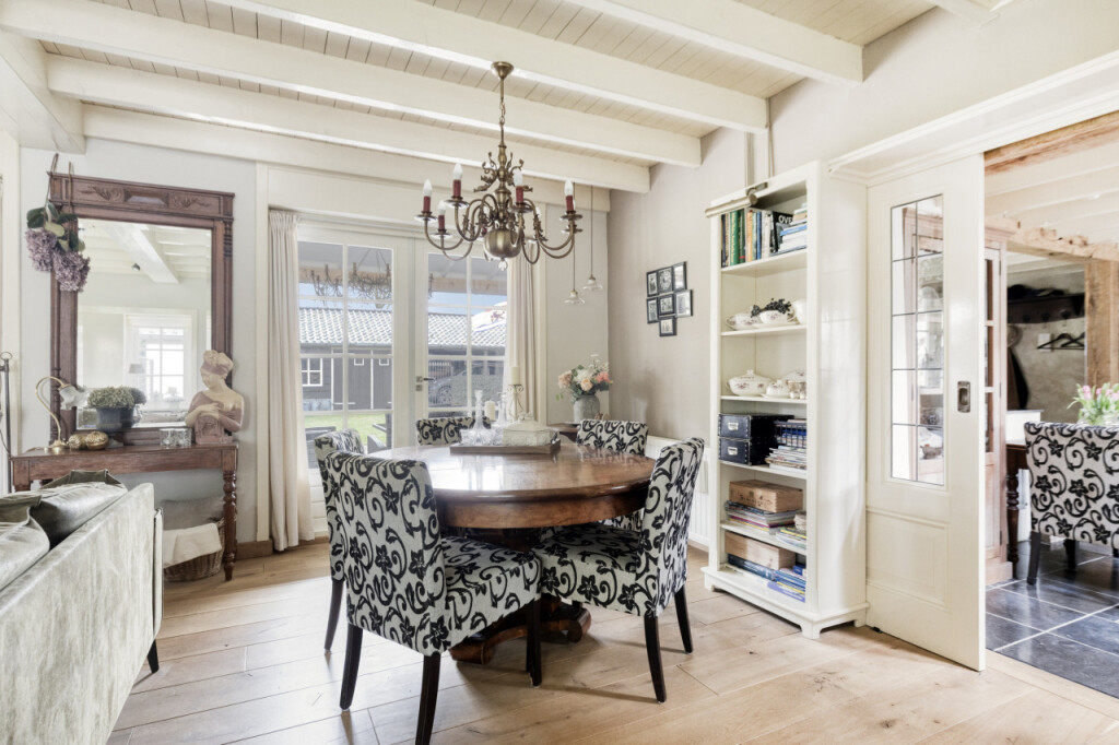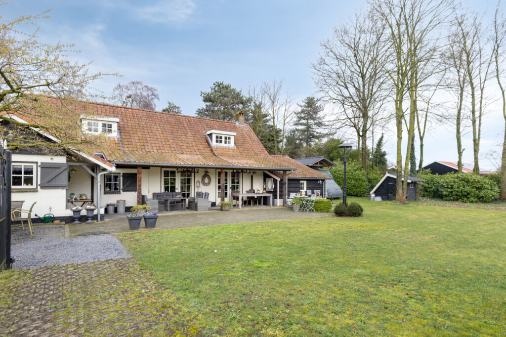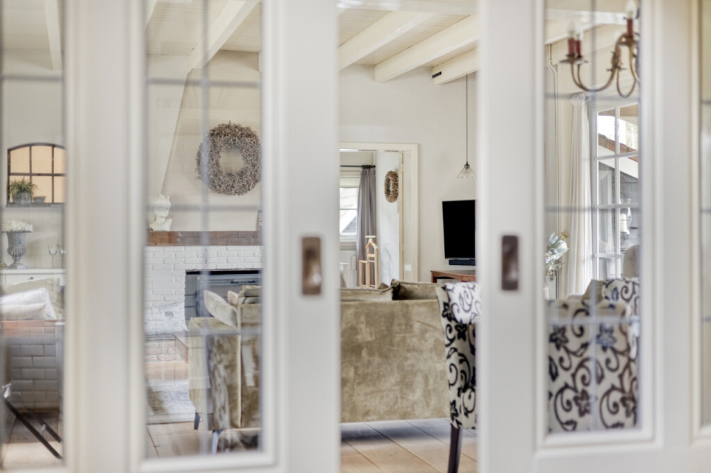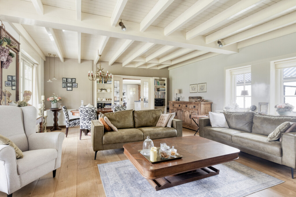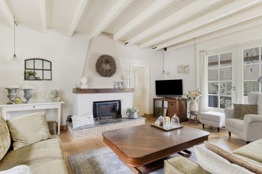 Via schuifdeuren loop je vanuit de keuken naar de woonkamer; het hart van de woning. De massief eikenhouten vloer, de houten balken aan het plafond en de sfeervolle haard zorgen direct voor een warme sfeer. De grote tuindeuren vormen een prachtige verbinding met buiten. Wanneer je ze opent, stap je zo onder de overkapping waar je beschut kunt zitten en het hele jaar door van de tuin kunt genieten. Op mooie dagen zet je de deuren open en loopt het binnenleven moeiteloos over in het buitenleven; een heerlijke plek voor lange zomeravonden, een kop koffie in de ochtend of een gezellig samenzijn met familie en vrienden.
