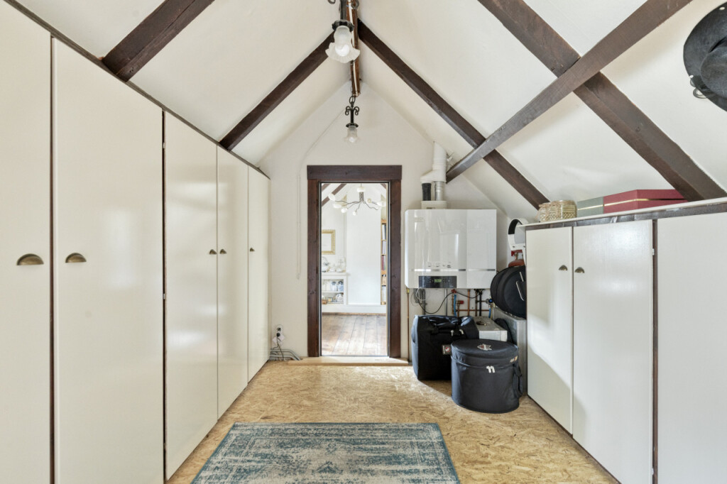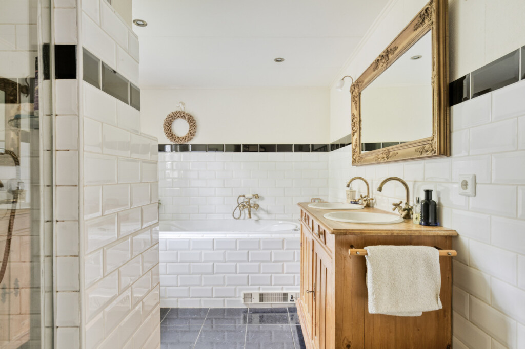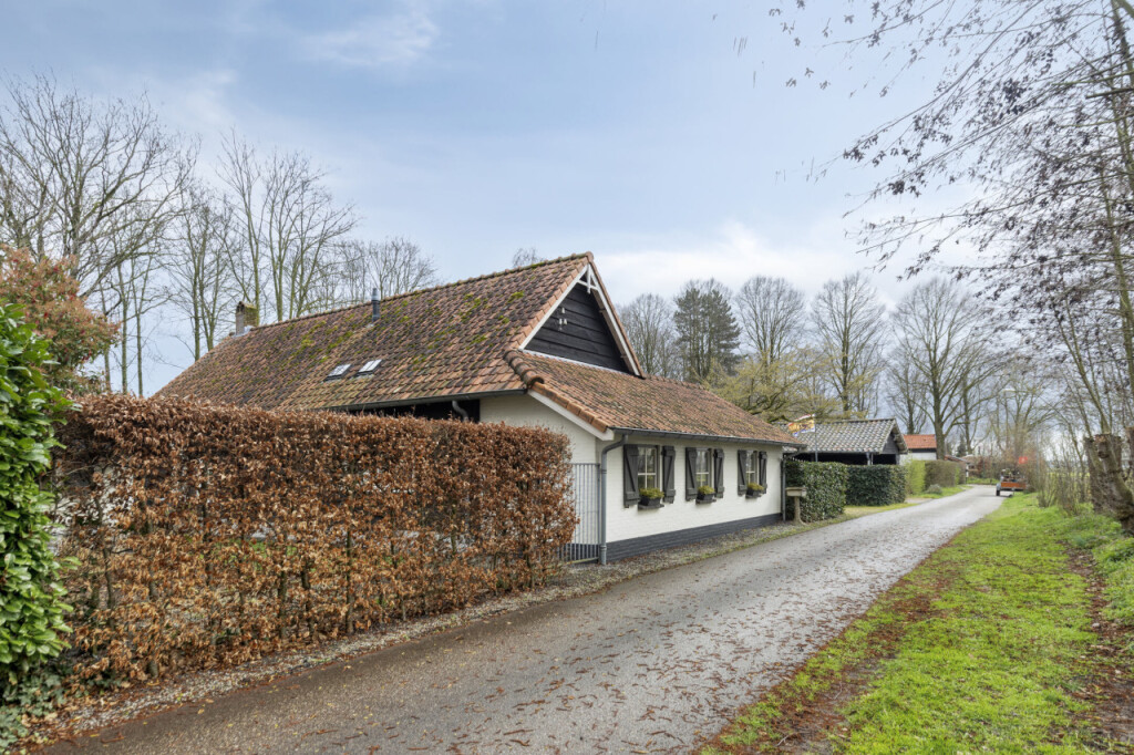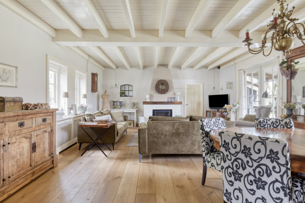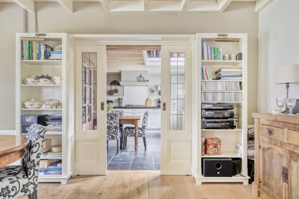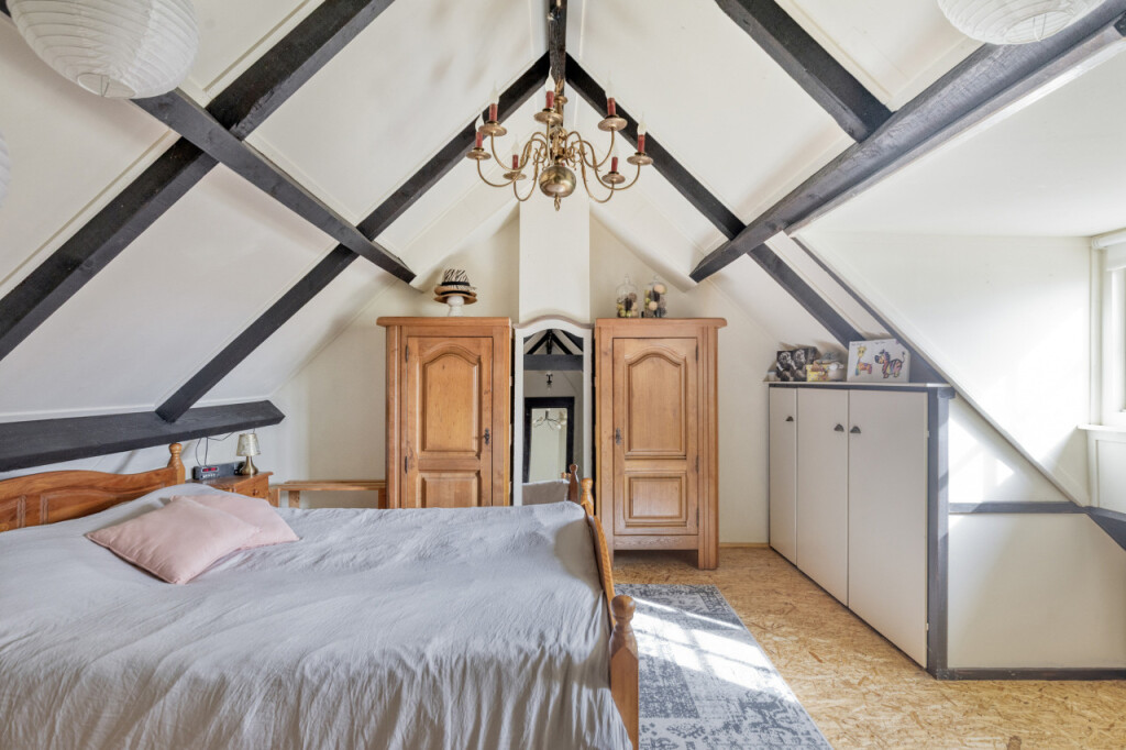 Via schuifdeuren loop je vanuit de keuken naar de woonkamer; het hart van de woning. De massief eikenhouten vloer, de houten balken aan het plafond en de sfeervolle haard zorgen direct voor een warme sfeer. De grote tuindeuren vormen een prachtige verbinding met buiten. Wanneer je ze opent, stap je zo onder de overkapping waar je beschut kunt zitten en het hele jaar door van de tuin kunt genieten. Op mooie dagen zet je de deuren open en loopt het binnenleven moeiteloos over in het buitenleven; een heerlijke plek voor lange zomeravonden, een kop koffie in de ochtend of een gezellig samenzijn met familie en vrienden.