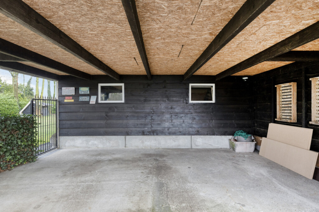 Aan de andere zijde van de tuin staat de vrijstaande stenen garage. Op het dak liggen 8 zonnepanelen. Voor de garage bevindt zich nog een carport met plaats voor twee autoâs. De garage is voorzien van elektra en water en is daarmee perfect geschikt als hobbyruimte, werkplaats of extra opslag.