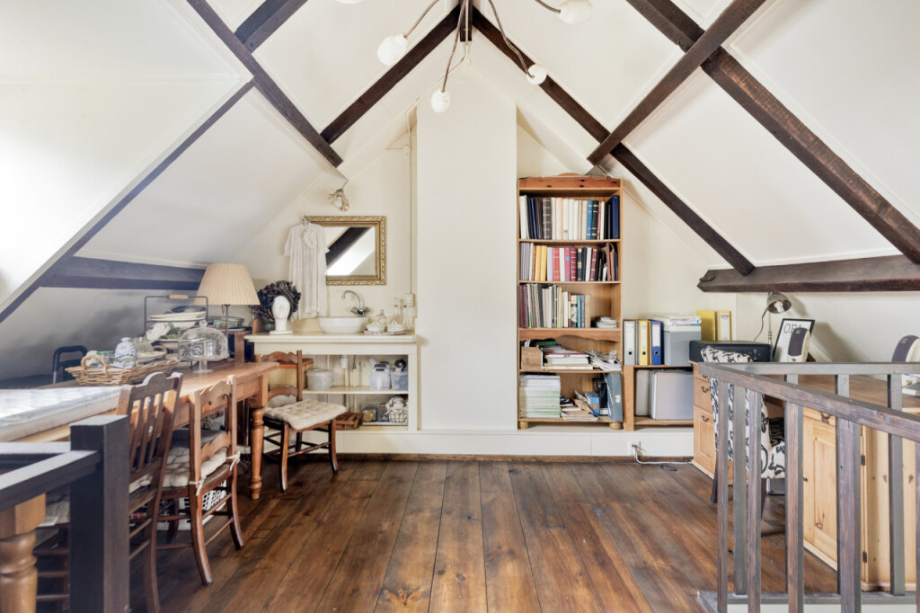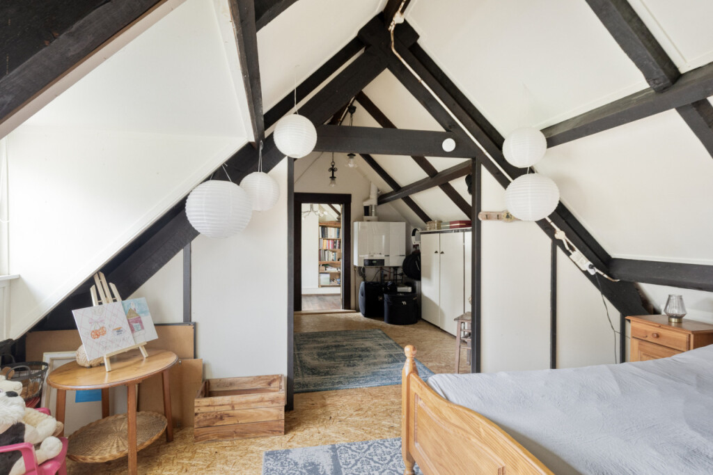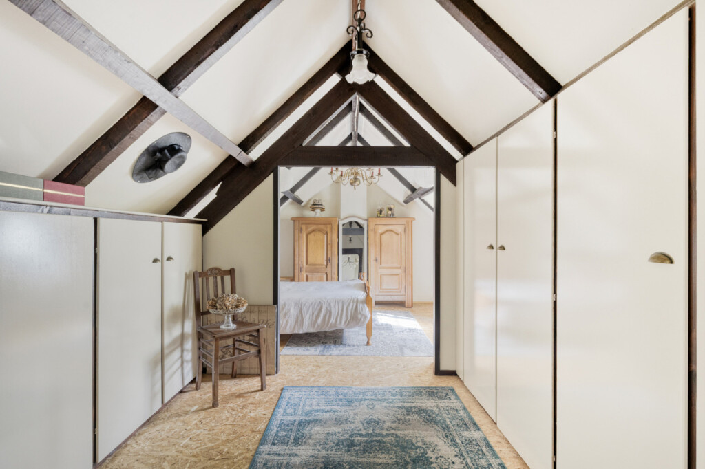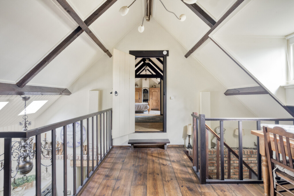 Via de trap in de keuken kom je op de eerste verdieping. De overloop wordt momenteel gebruikt als werkruimte, maar kan eenvoudig worden omgevormd tot een derde slaapkamer door het plaatsen van een wand. Aan de rechterzijde bevindt zich nog een slaapkamer. In het voorste gedeelte zijn praktische inbouwkasten gerealiseerd en hier vind je ook de cv-ketel.