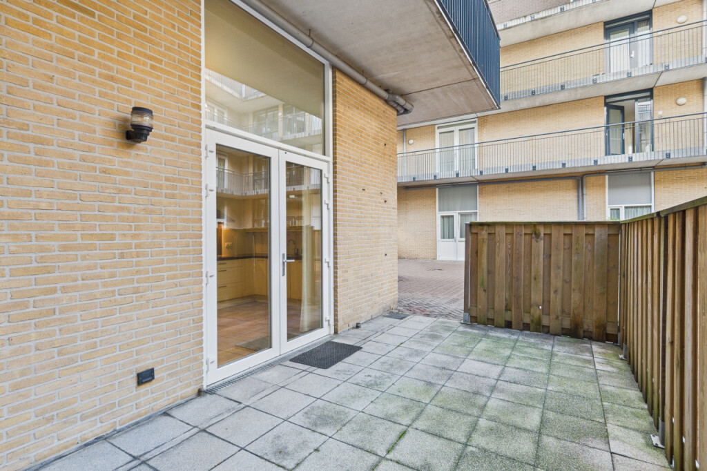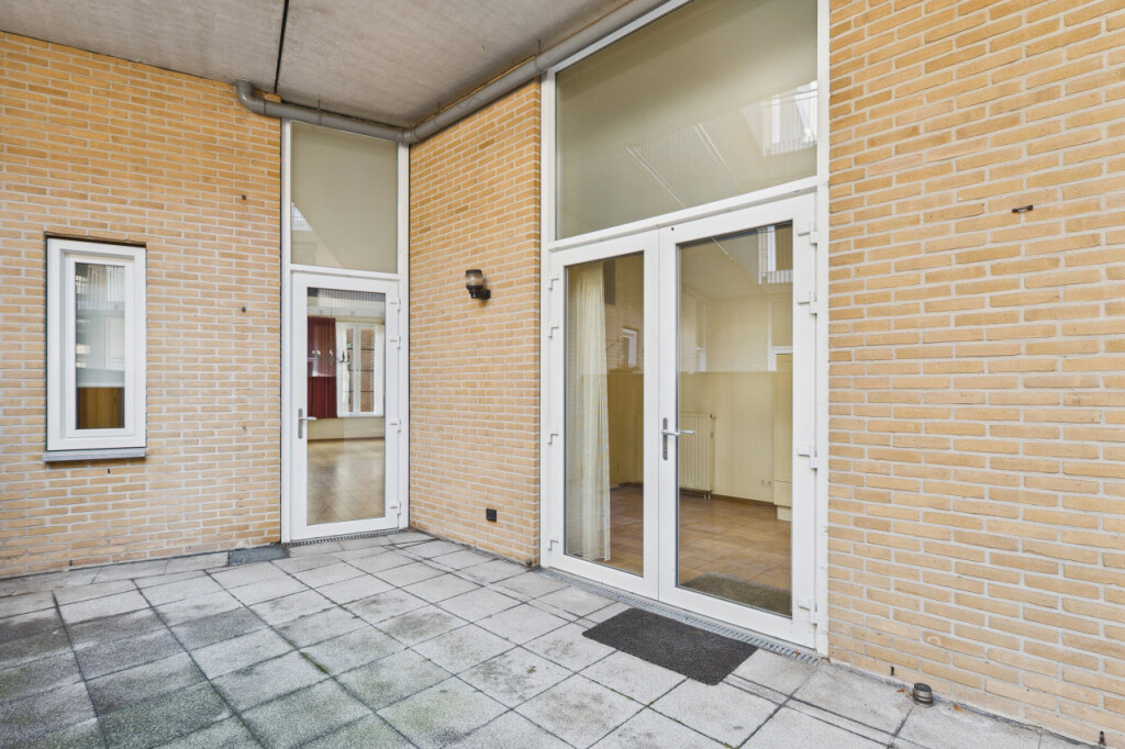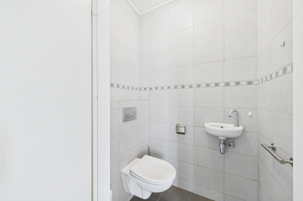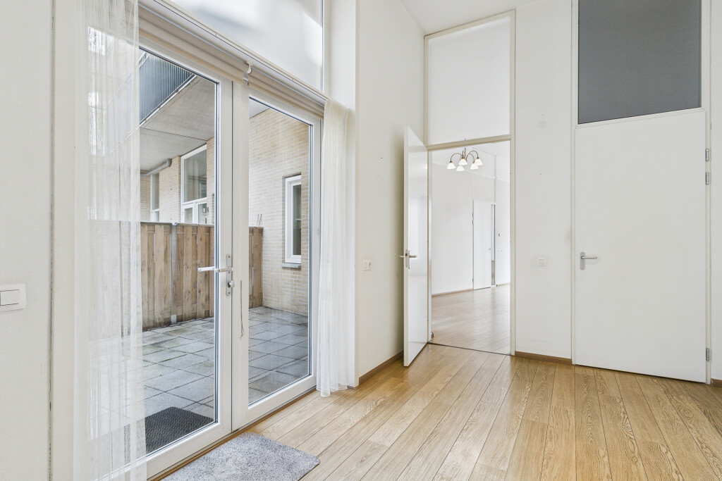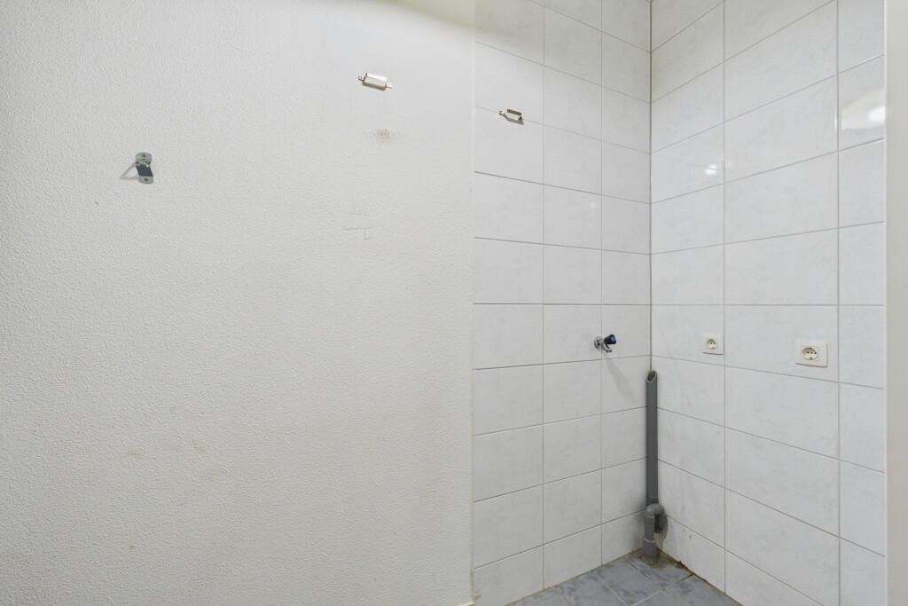 De entree aan de straatzijde leidt naar een ruime hal met meterkast, toilet en een berging/wasruimte. Vanuit hier stap je de lichte woonkamer binnen, voorzien van een nette laminaatvloer en een tuindeur naar het zonnige terras van circa 20 m² – een fijne, beschutte plek midden in de stad. De open keuken sluit aan op de woonkamer en is uitgevoerd in een moderne witte hoekopstelling met inductiekookplaat, afzuigkap, vaatwasser, koelkast en combimagnetron. Ook vanuit de keuken geven dubbele deuren toegang tot het terras.
