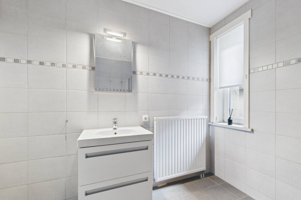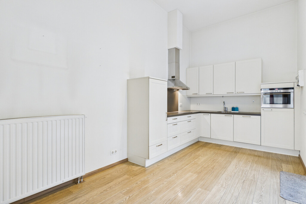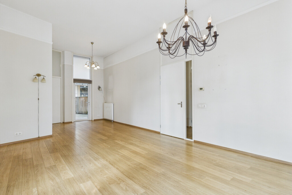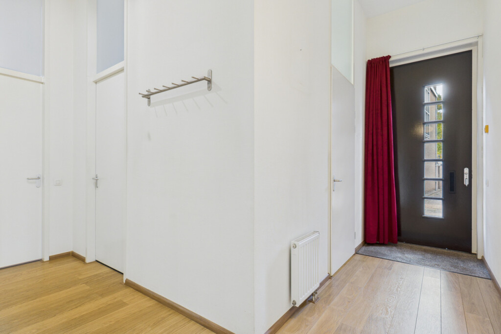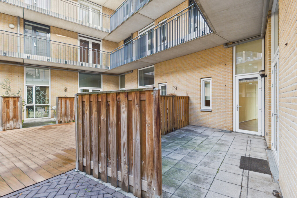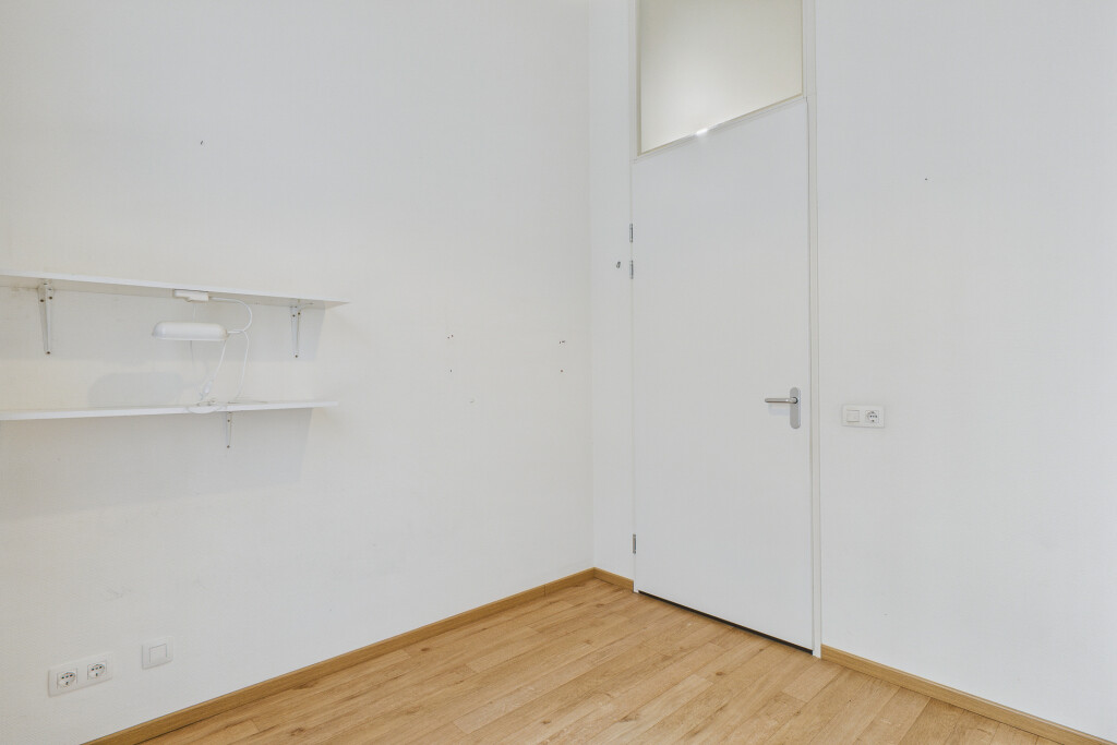 De entree aan de straatzijde leidt naar een ruime hal met meterkast, toilet en een berging/wasruimte. Vanuit hier stap je de lichte woonkamer binnen, voorzien van een nette laminaatvloer en een tuindeur naar het zonnige terras van circa 20 m² – een fijne, beschutte plek midden in de stad. De open keuken sluit aan op de woonkamer en is uitgevoerd in een moderne witte hoekopstelling met inductiekookplaat, afzuigkap, vaatwasser, koelkast en combimagnetron. Ook vanuit de keuken geven dubbele deuren toegang tot het terras.