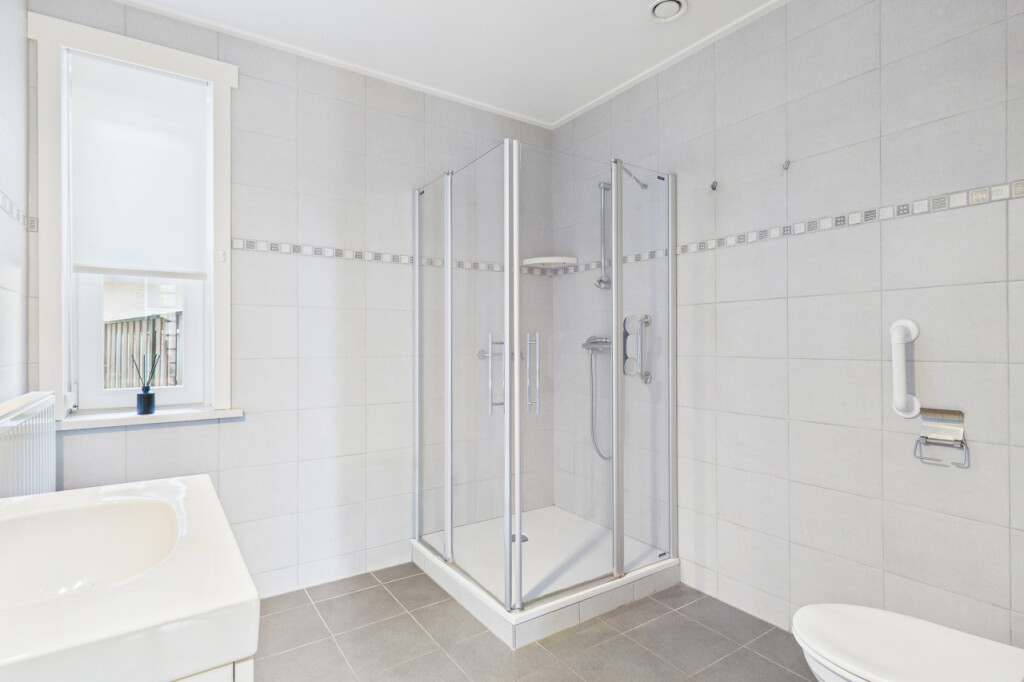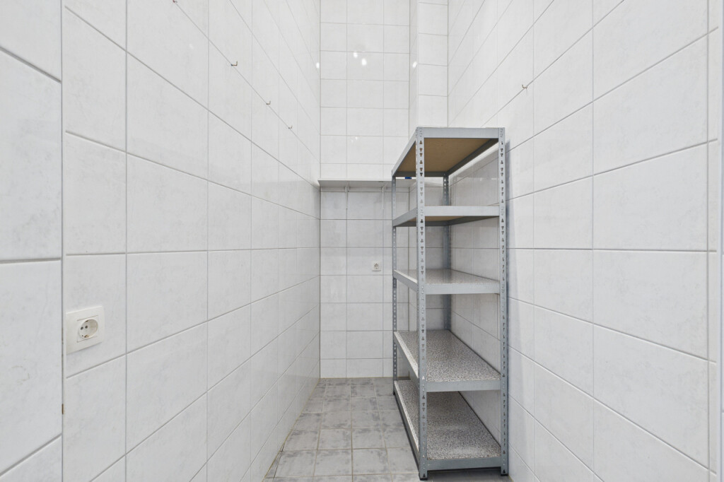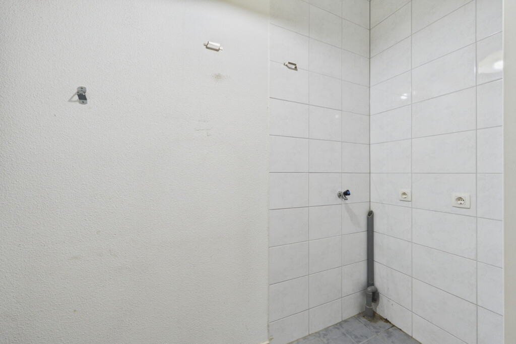Naast de keuken bevindt zich een extra berging/bijkeuken – praktisch voor voorraad of apparatuur. De volledig betegelde badkamer is uitgerust met een douche, wastafel en tweede toilet. Aan de rechterzijde van de hal liggen de twee slaapkamers (ca. 7 m² en 17 m²), beide met laminaatvloer.