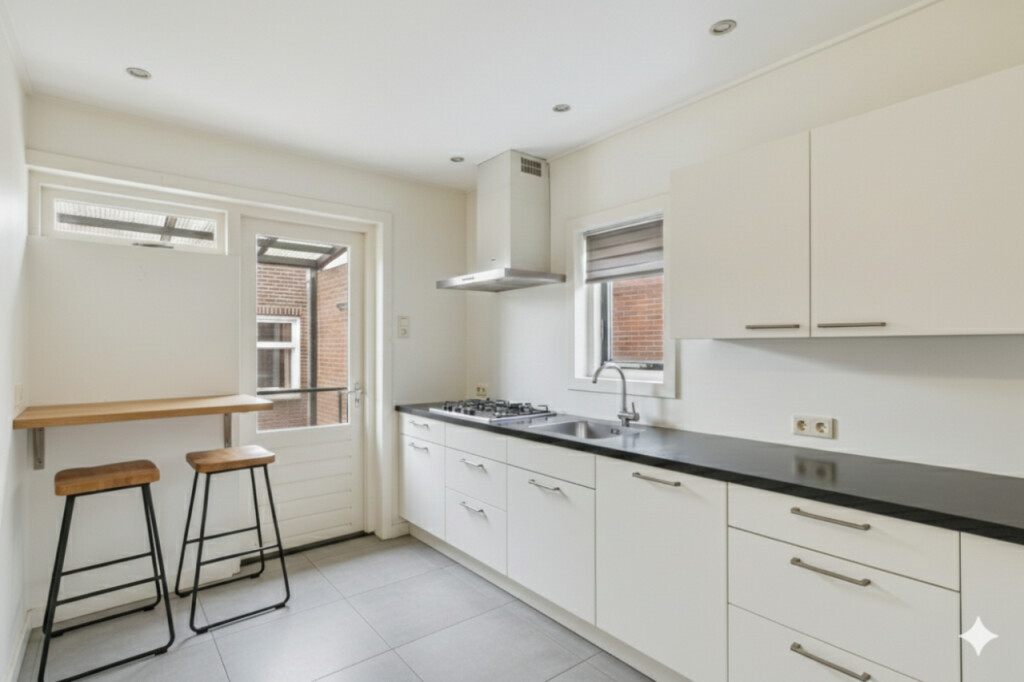 Via de voordeur kom je binnen in de hal, waar zich het toilet met fonteintje bevindt en de trapopgang naar de verdieping. Vanuit de hal is er toegang tot zowel de woonkamer als de keuken. De lichte doorzonwoonkamer loopt over de volledige lengte van de woning en profiteert van een prettige lichtinval aan zowel de voor- als achterzijde. De authentieke haard geeft de ruimte karakter en vormt een mooi uitgangspunt voor een eigentijdse inrichting. Via een deur aan de achterzijde is er direct toegang tot de tuin, waardoor binnen en buiten op een natuurlijke manier met elkaar worden verbonden. De dichte keuken is eveneens vanuit de hal bereikbaar, is voorzien van inbouwapparatuur en biedt toegang tot de praktische trapkast voor extra bergruimte.