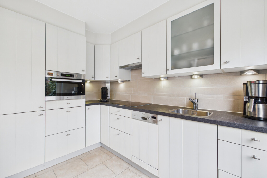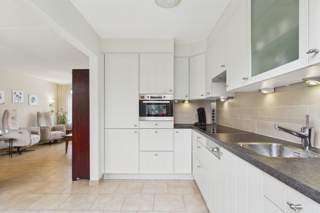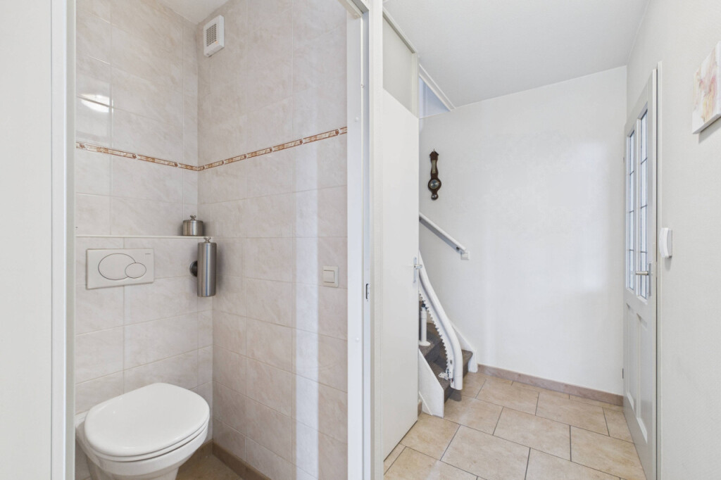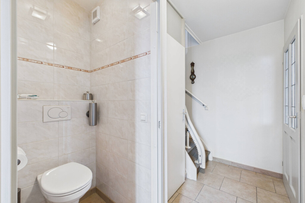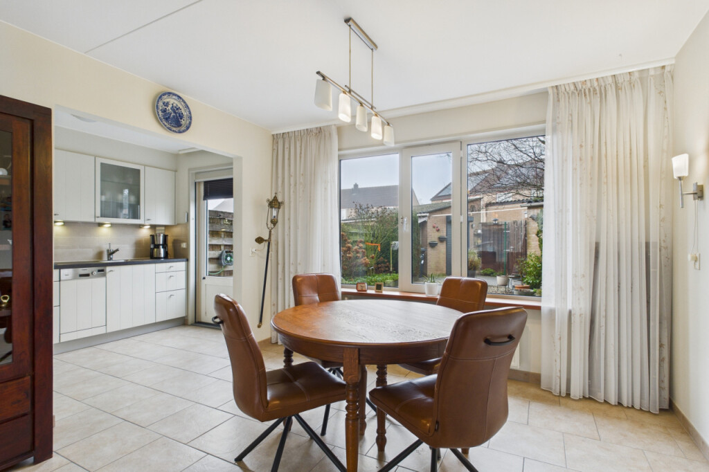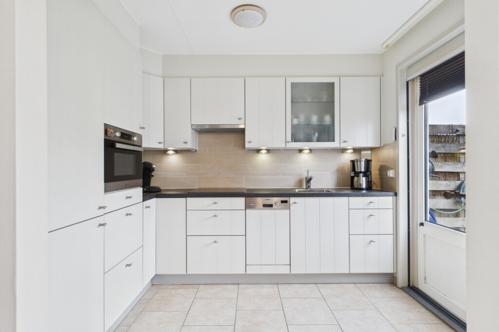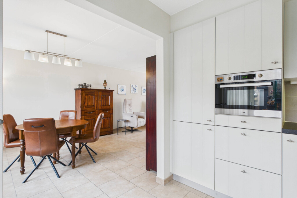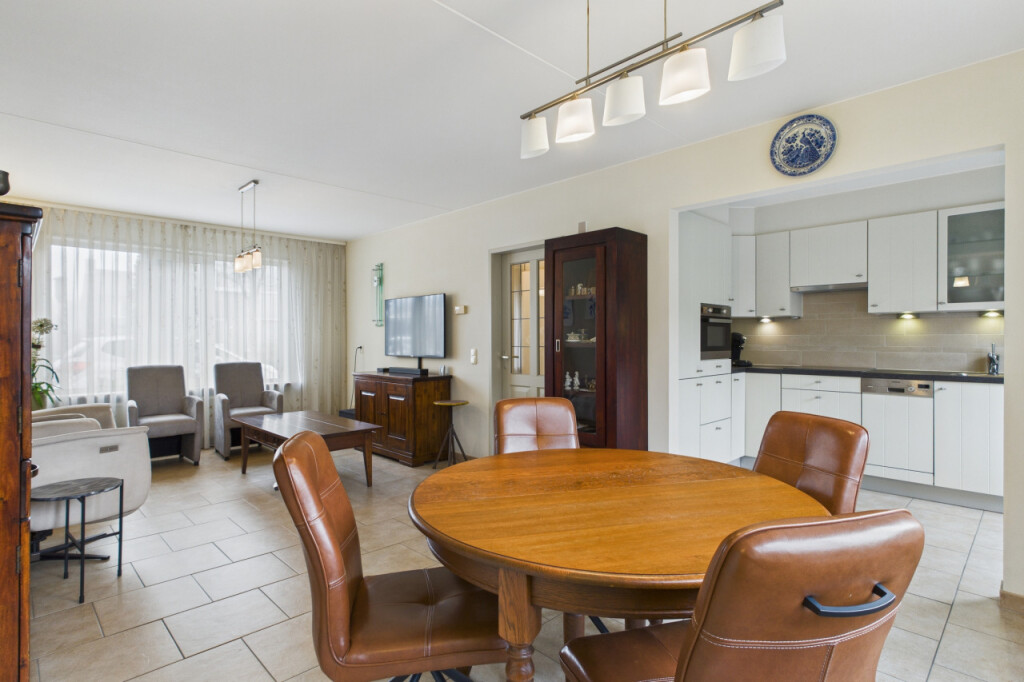 Je komt binnen in de hal met het toilet, een praktische provisiekast en de trap naar de eerste verdieping. Vanuit hier loop je door naar de woonkamer. De doorzonopstelling zorgt voor een mooie lichtinval, met aan de voorzijde ruimte voor een comfortabele zithoek en aan de achterzijde plaats voor een grote eettafel. De open keuken is opgesteld in een hoek en uitgevoerd in een lichte kleurstelling, voorzien van inbouwapparatuur en met directe toegang tot de tuin, wat het geheel extra gebruiksvriendelijk maakt.