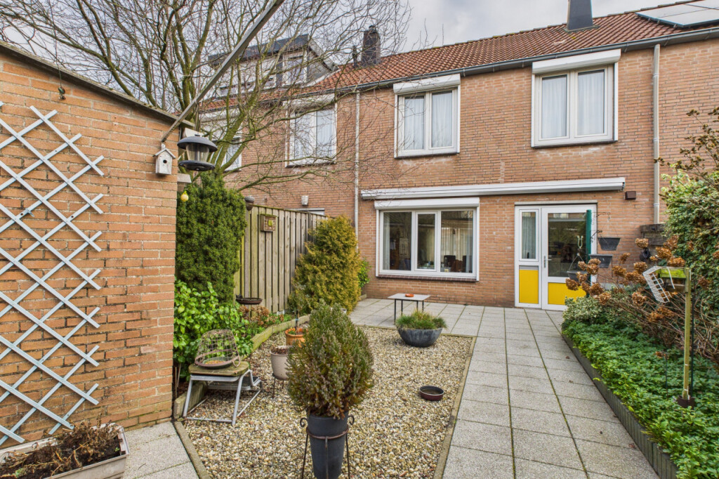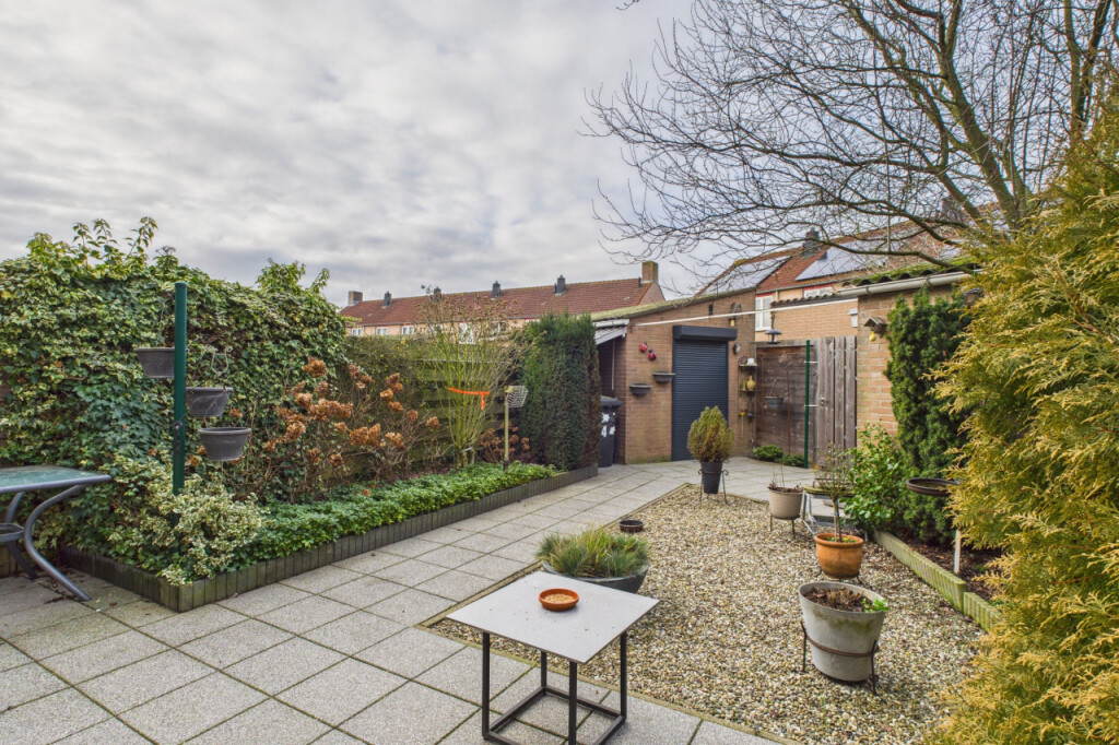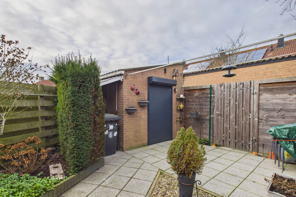 De achtertuin is zonnig gelegen op het zuidwesten en biedt volop mogelijkheden om buiten te genieten. Er is een prettig terras met buitenzonwering, meerdere borders met beplanting en voldoende ruimte om verschillende zitplekken te creëren. Achterin staat een vrijstaande stenen berging en via de vrije achterom is de tuin ook praktisch bereikbaar met bijvoorbeeld fietsen.
