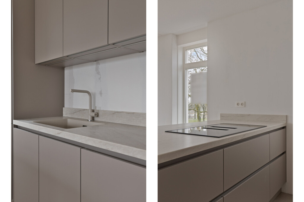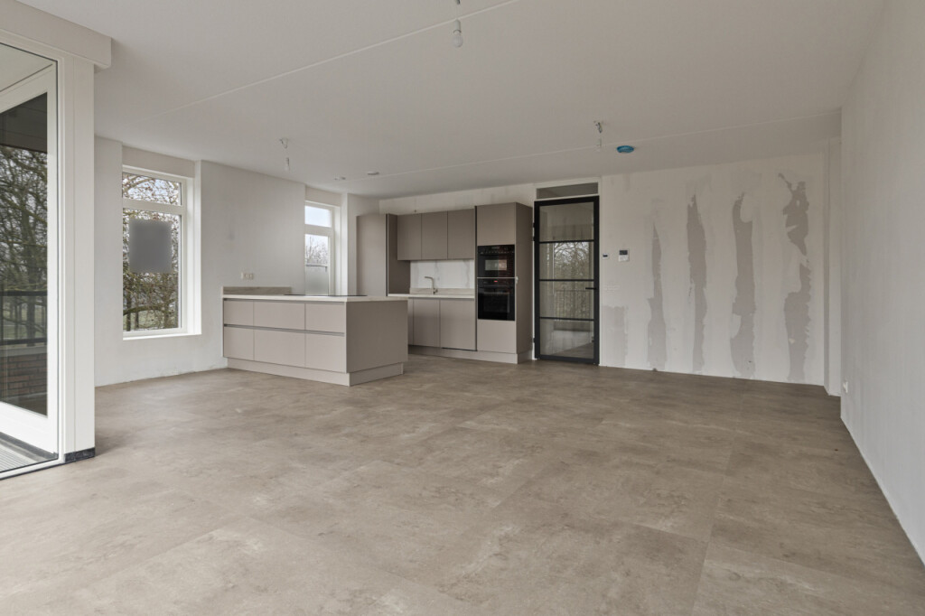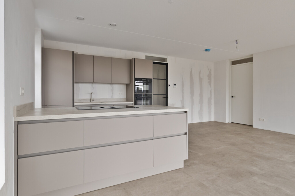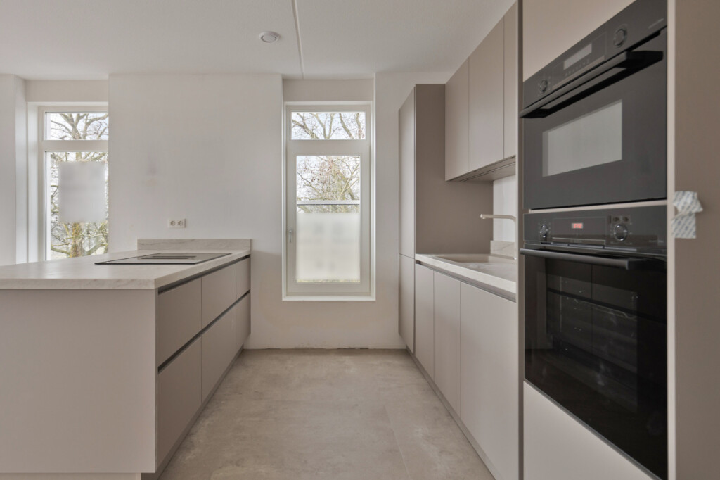 Loop je verder door de hal, dan kom je in de ruime en lichte woonkamer. Dankzij de vele ramen rondom profiteer je hier van een prachtige lichtinval en een uitzicht vanuit vrijwel iedere hoek van de leefruimte. De open keuken met kookeiland vormt het hart van het appartement en is uitgerust met moderne inbouwapparatuur: een inductiekookplaat met geïntegreerde afzuiging, combi oven/magnetron, vaatwasser en koelkast.