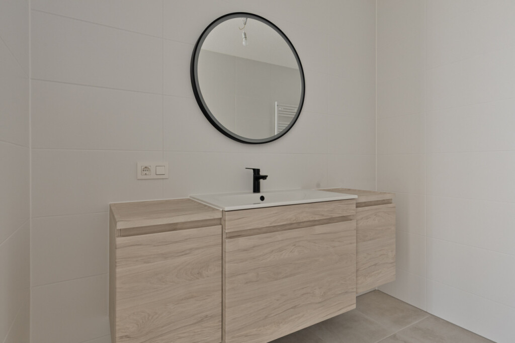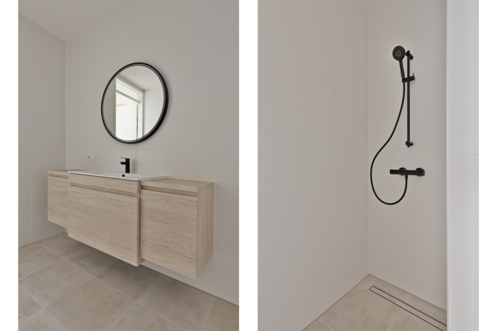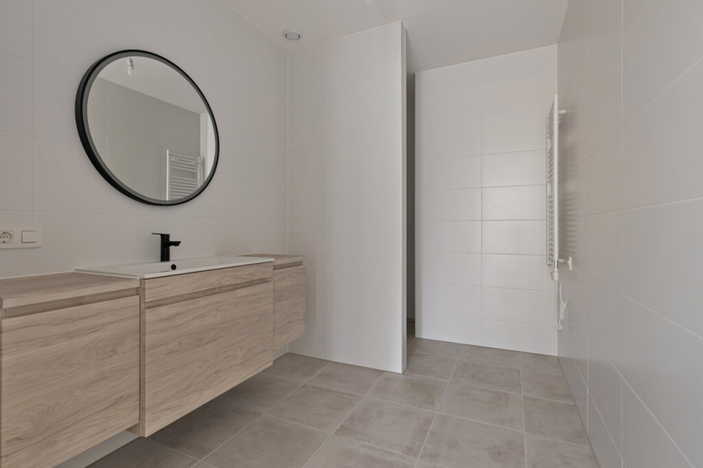 Een modern afgewerkte badkamer met inloopdouche, wastafelmeubel en handdoekradiator.