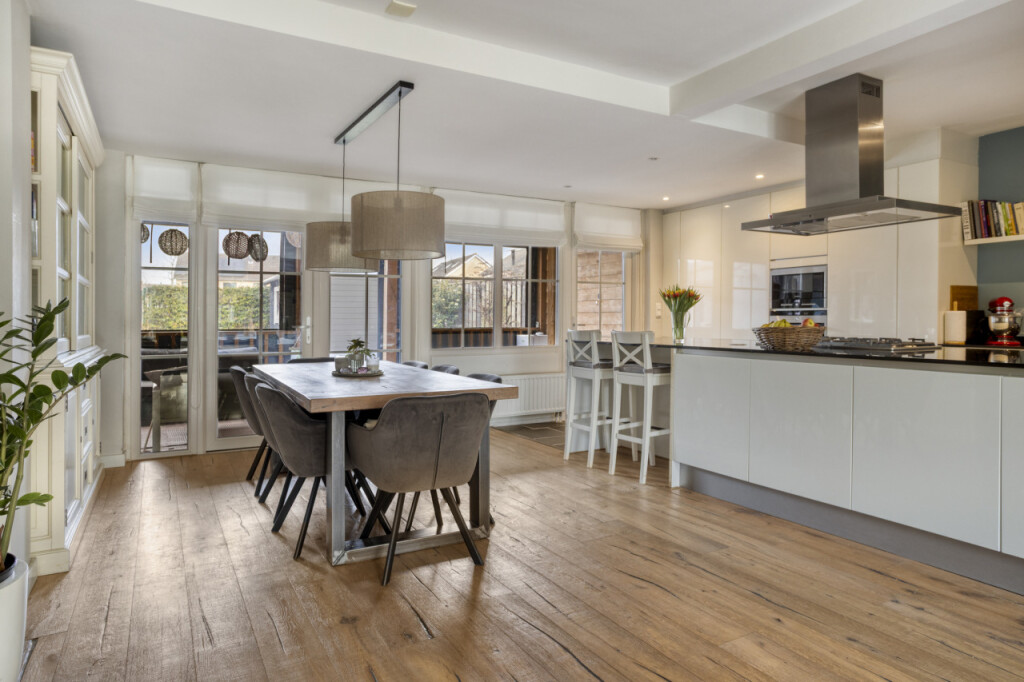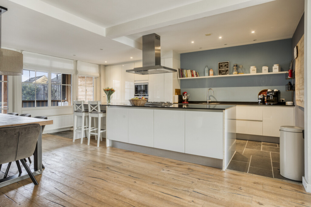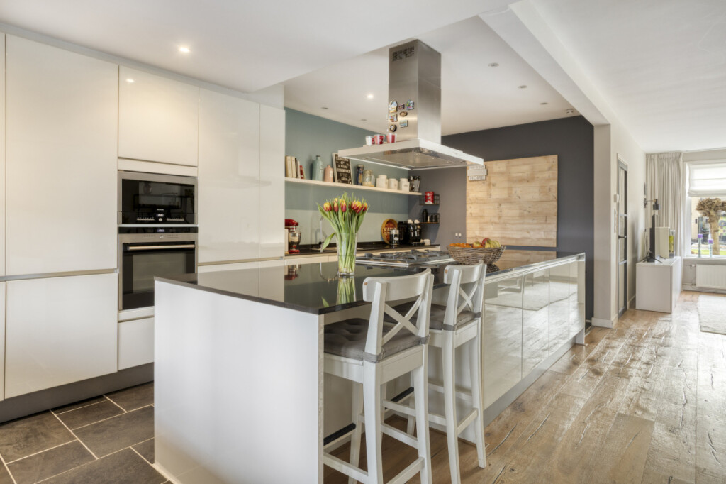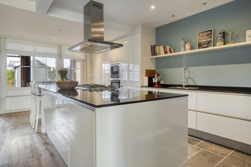 Via de hal, met toegang tot het toilet met fonteintje, kom je in de woonkamer. De woonkamer is prettig licht en staat in open verbinding met de keuken. De keuken is modern uitgevoerd en voorzien van een kookeiland met 5-pits gaskookplaat, vaatwasser, koelkast, vriezer, oven en magnetron.
