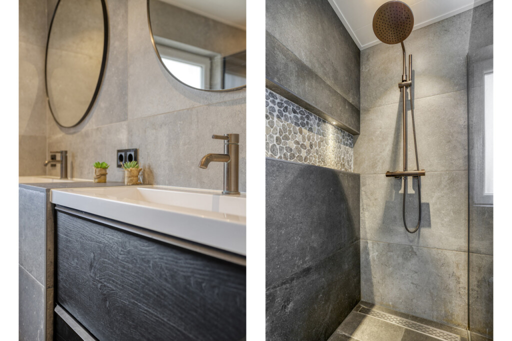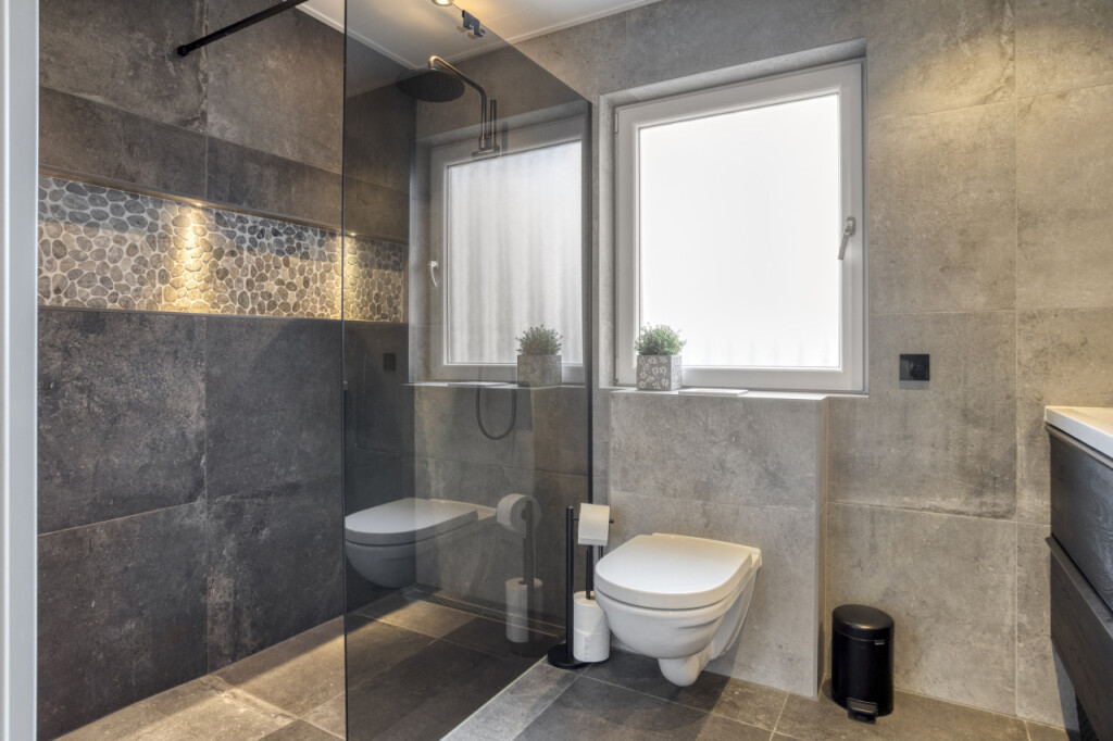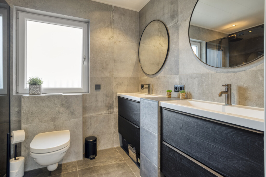 Op de eerste verdieping bevinden zich drie slaapkamers en de badkamer. De badkamer is ingericht met een inloopdouche, toilet en een dubbele wastafel met meubel. Alle slaapkamers zijn voorzien van horren.