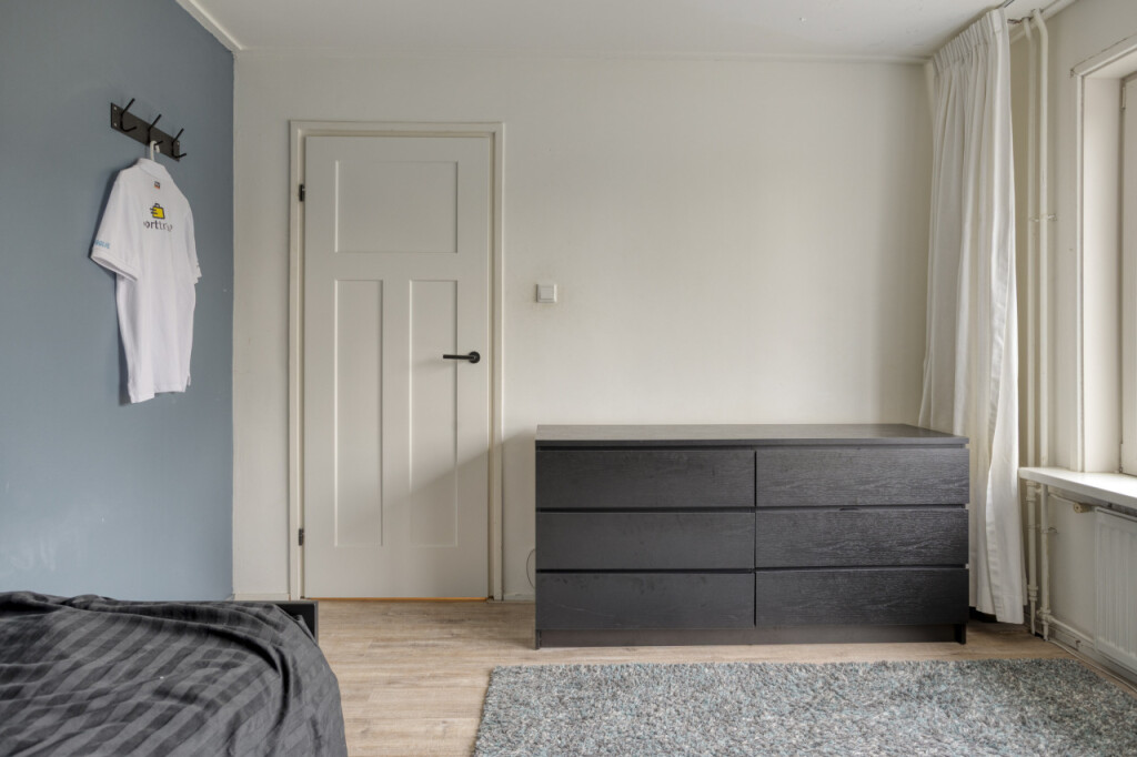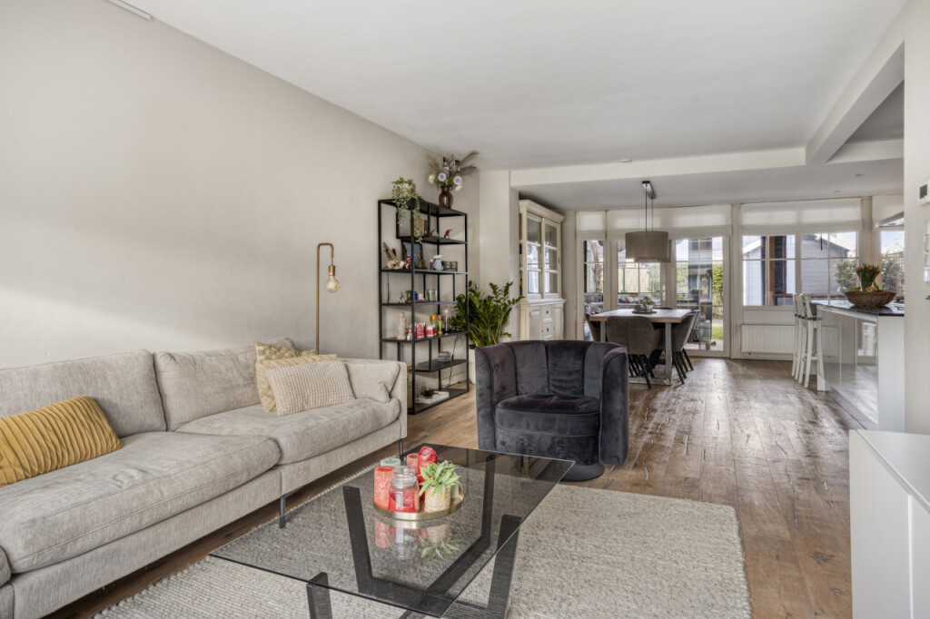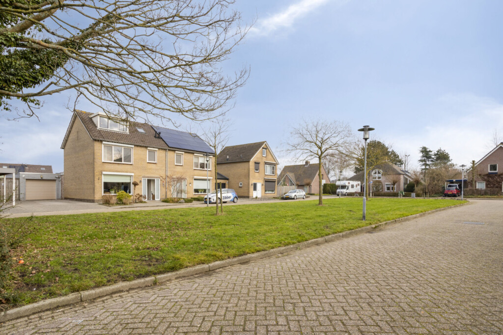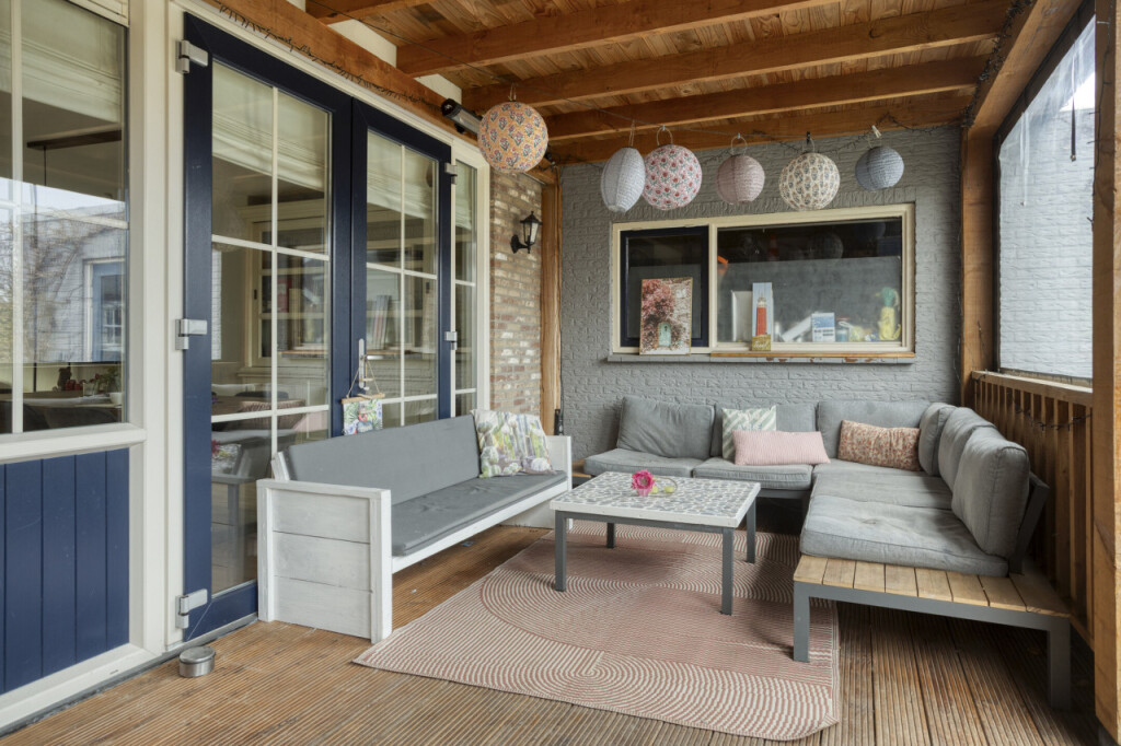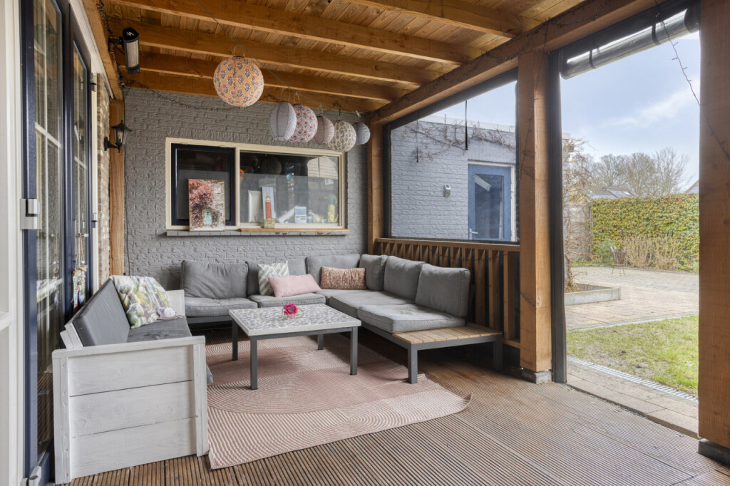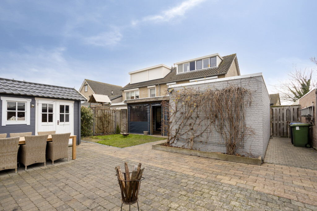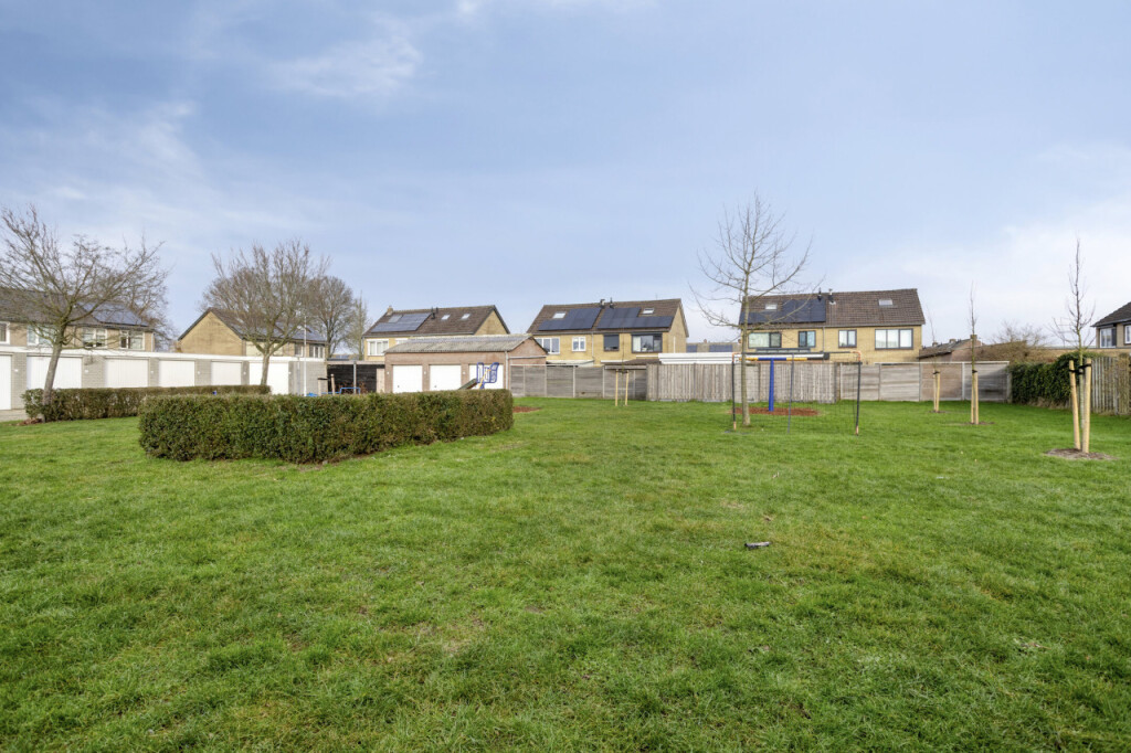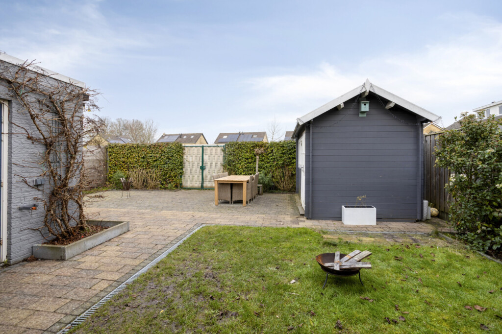 Vanuit de keuken is er toegang tot de tuin met een houten overkapping, waardoor je ook bij minder weer buiten kunt zitten. Achterin de tuin staat een houten berging met elektra en een vliering. Via de achteruitgang kom je direct bij een openbaar speeltuintje, wat de woning geschikt maakt voor gezinnen met (jonge) kinderen.