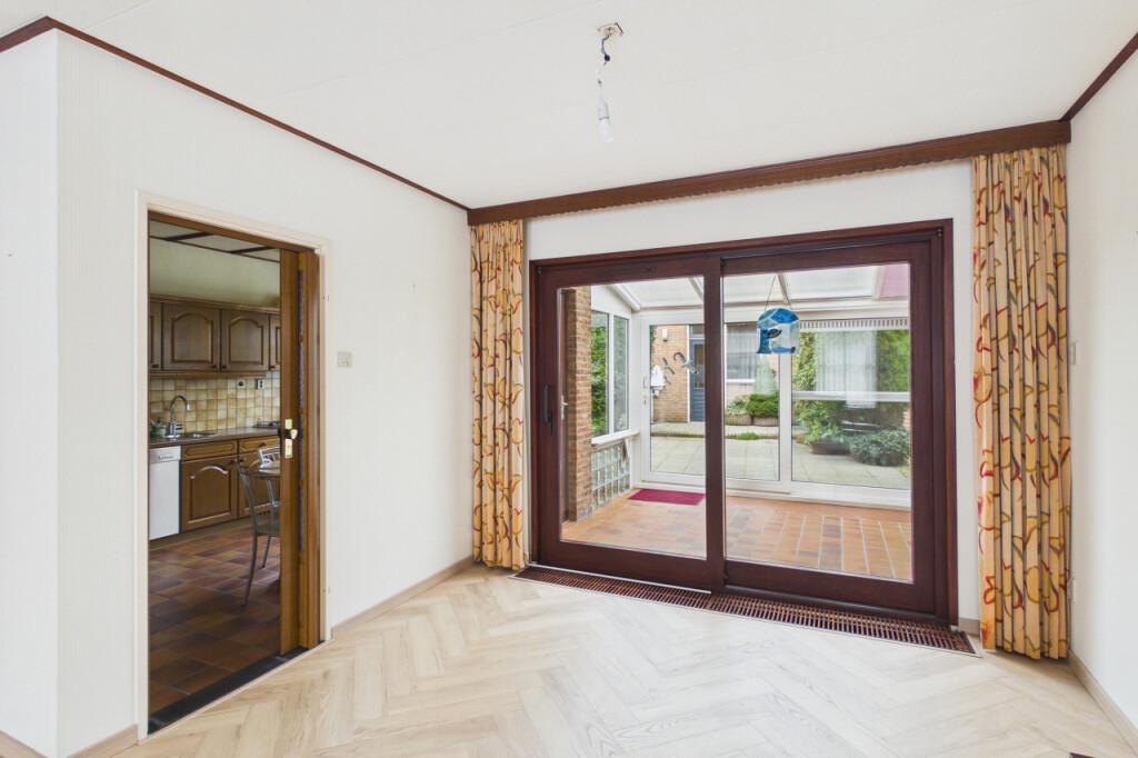 Bij binnenkomst via de hal tref je de meterkast, het toilet met fonteintje en de trapopgang. De doorzonwoonkamer is een absolute blikvanger, mede dankzij de prachtige visgraat laminaatvloer (2019) die de ruimte een luxe uitstraling geeft. De grote schuifpui biedt toegang tot de serre.