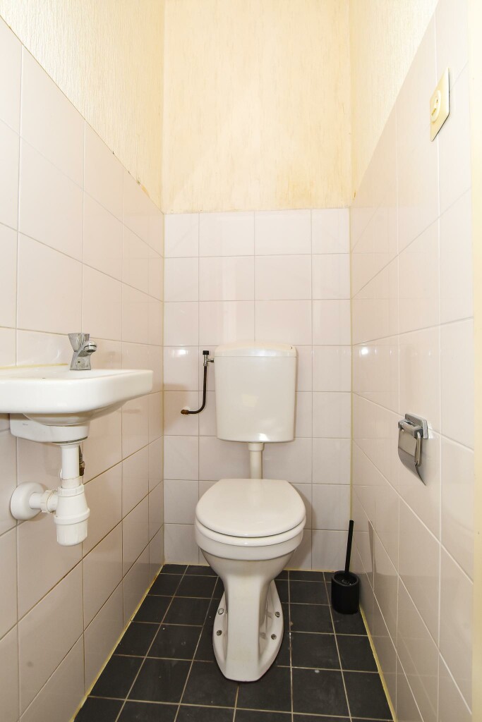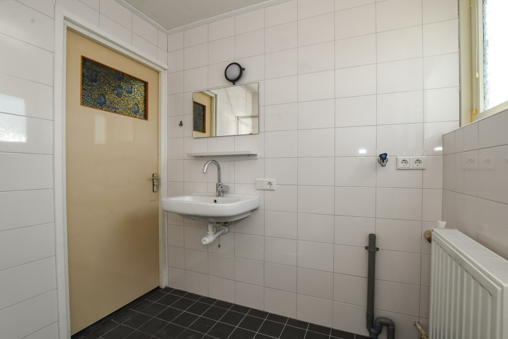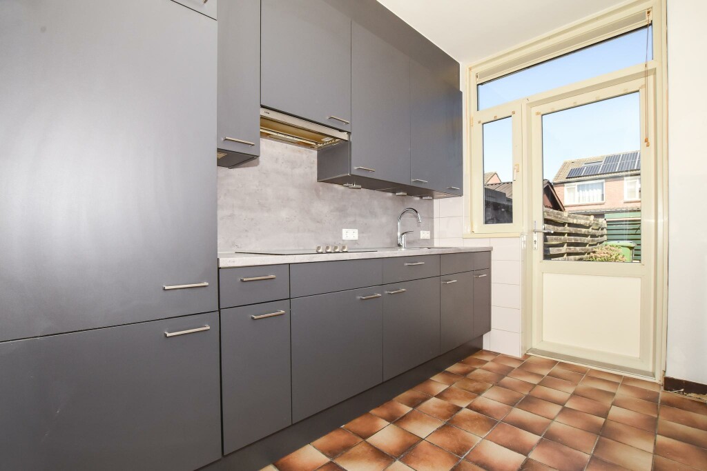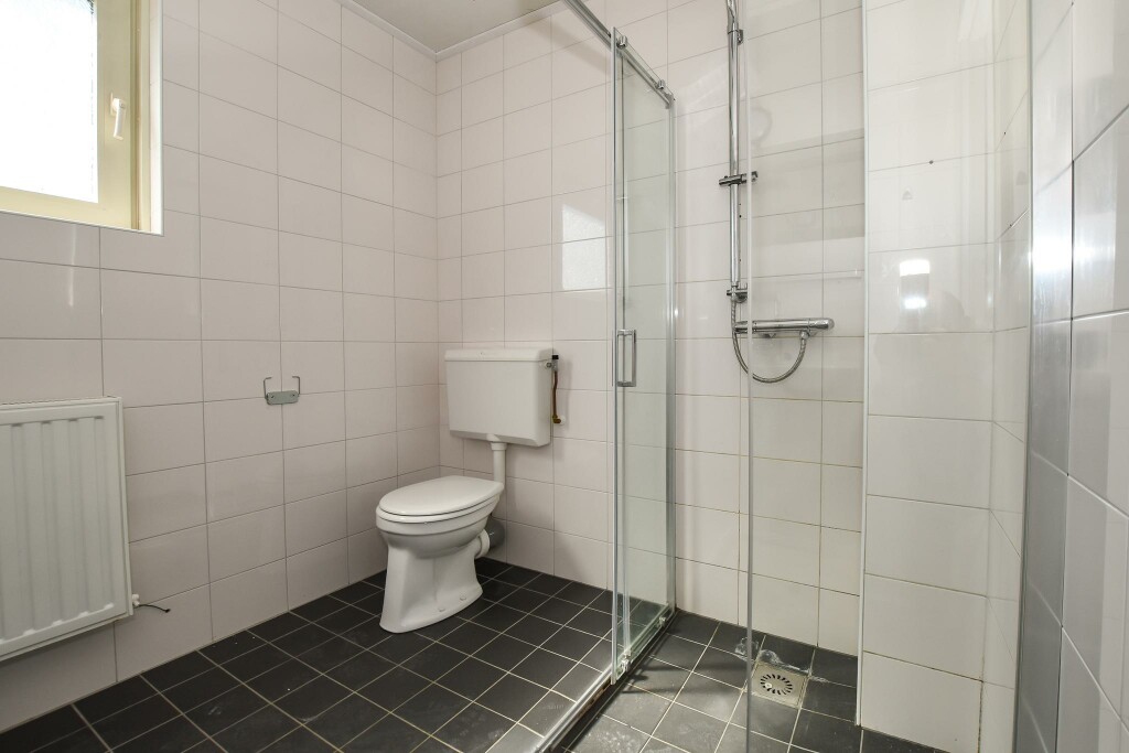 Entree in de hal met meterkast, trapopgang en toilet. De ruime woonkamer is heerlijk licht door de grote ramen. Aansluitend aan de woonkamer een dichte keuken en een keuken in een rechte opstelling. De keuken is voorzien van een elektrische kookplaat, afzuigkap en koelkast. Verder is er hier een diepe trapkast voor extra bergruimte. Vanuit de keuken een deur naar de tuin.