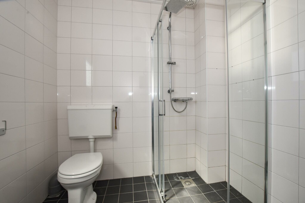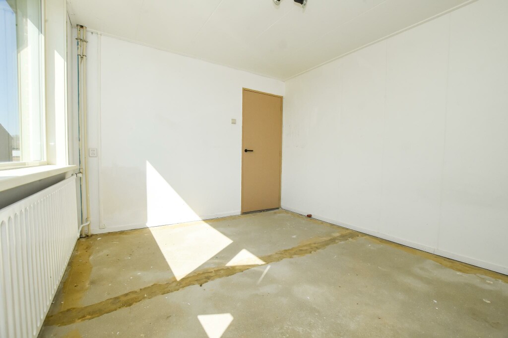 Overloop met toegang tot een ruime slaapkamer aan de voorzijde van de woning. Aan de achterzijde van de woning bevinden zich een grote en een kleine slaapkamer. De eenvoudige badkamer heeft een douche, wastafel en toilet. Verder is hier de aansluiting voor de wasapparatuur.
